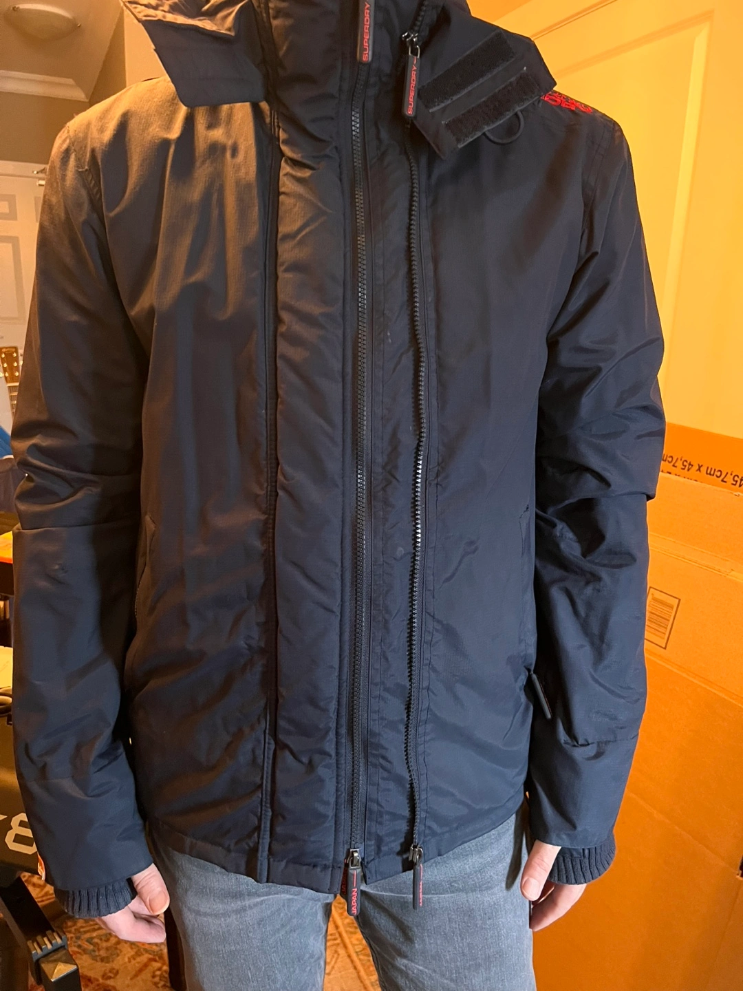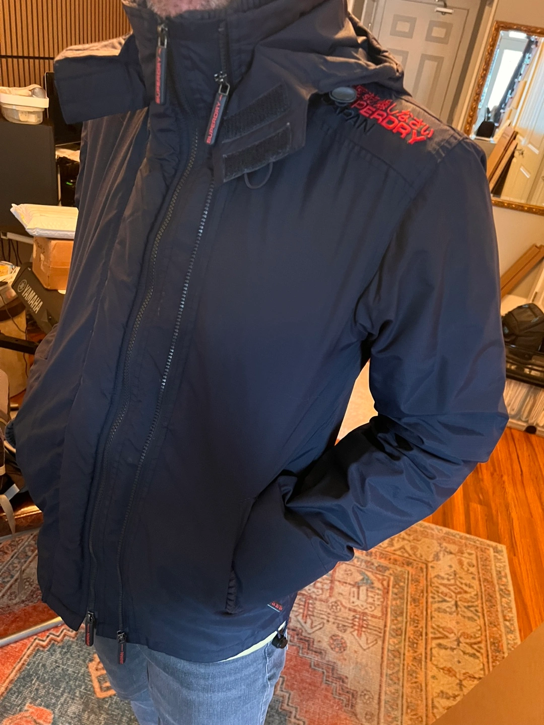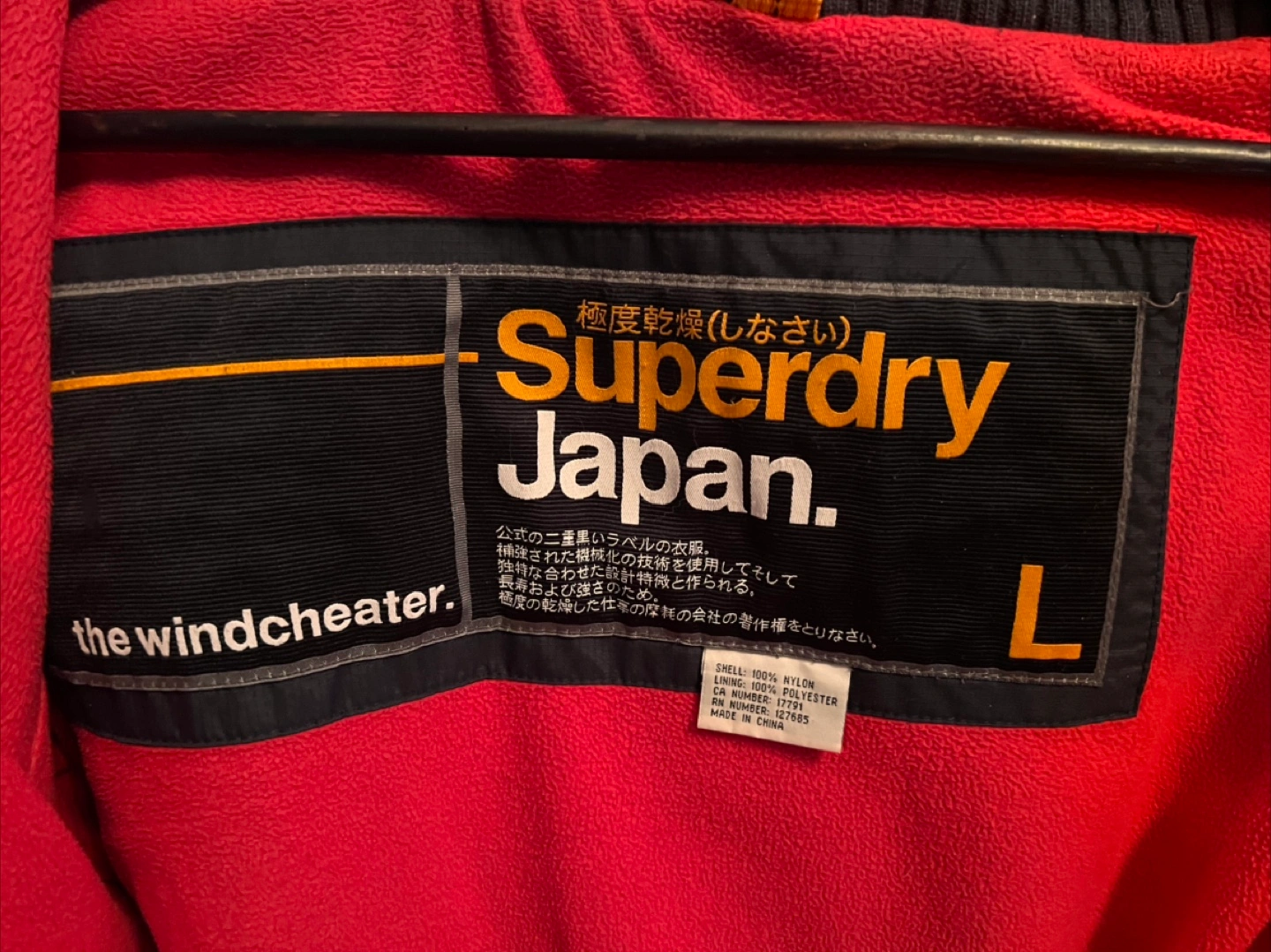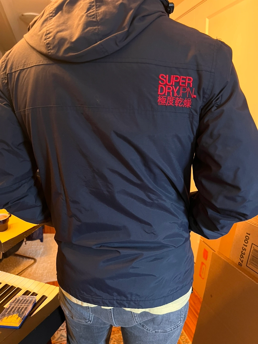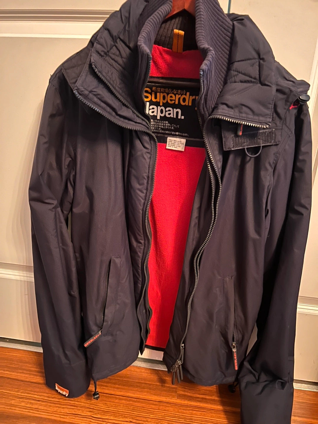 Men's size large Superdry Japan Windcheater jacket. Dark navy blue colour. Features a hood and red accents. Zipper closure. Lined. Brand new sell for $260. WHOEVER FINDS THIS IS GETTING AN AMAZING DEAL!!!