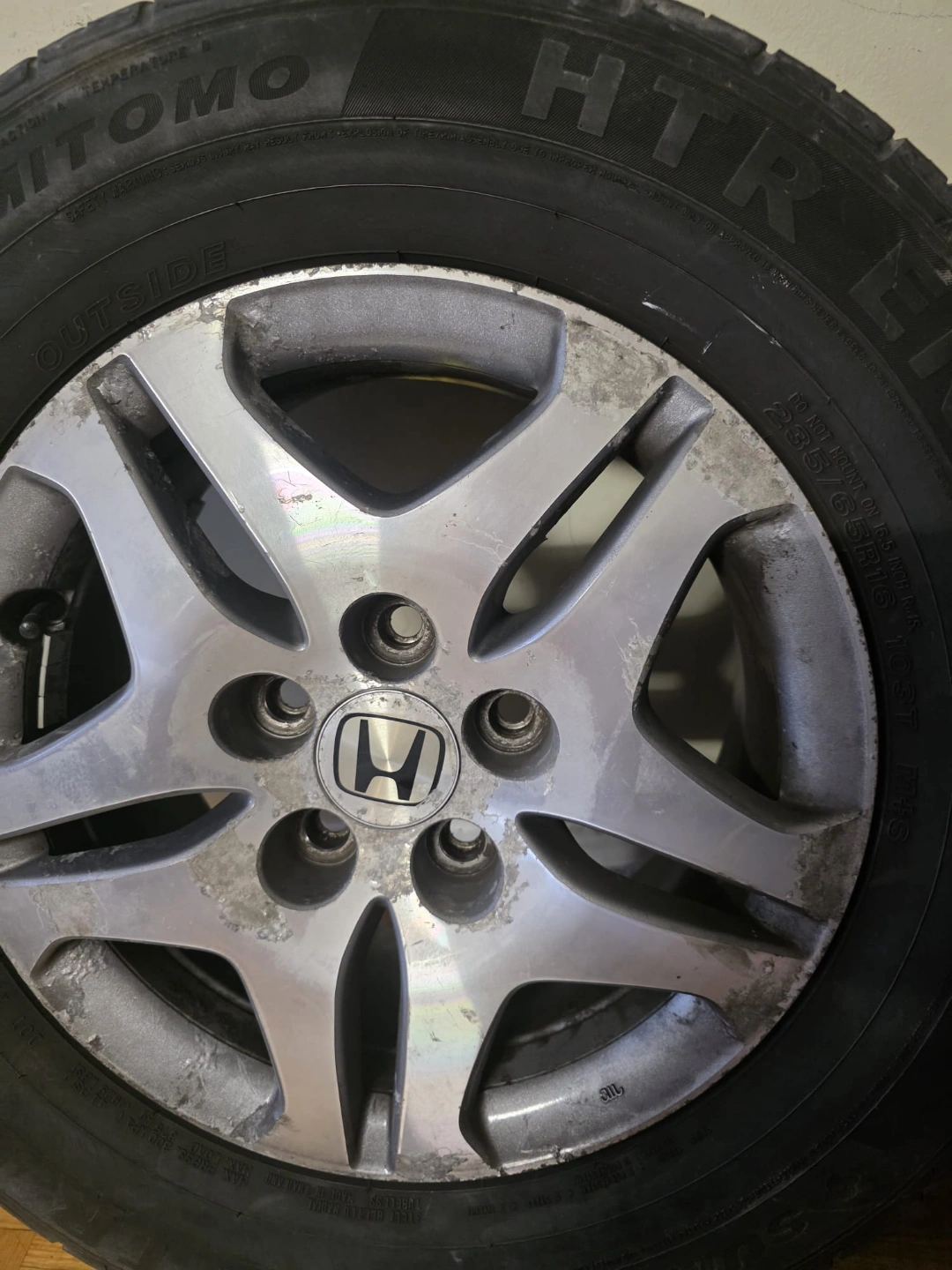 Set of four used Honda alloy rims with Sumitomo summer tires. Tires show wear. Rims have some scuffs and scratches. Size 225/65/R16