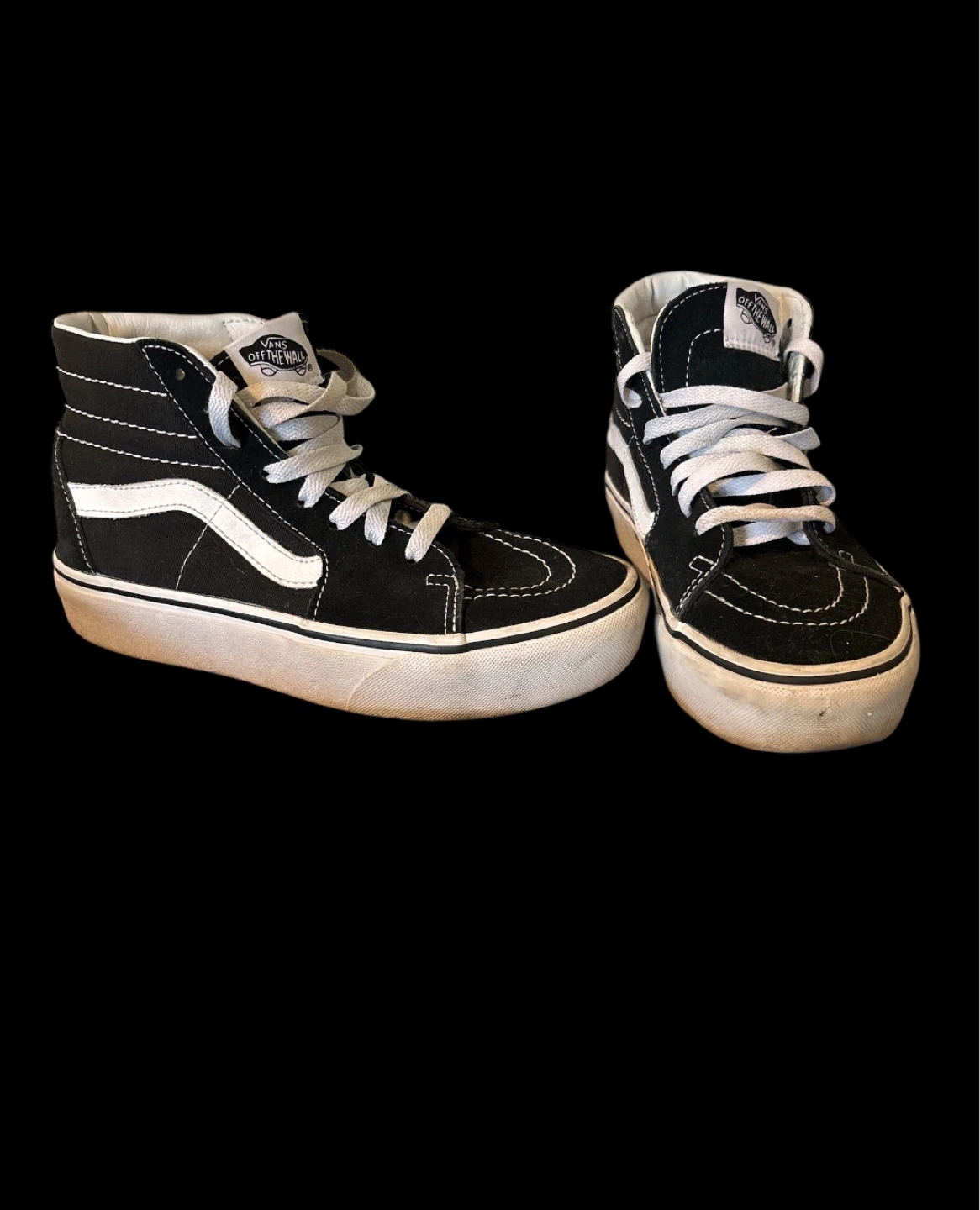 Black canvas high top sneakers. White side stripe. Lace-up closure. Worn a couple times. Brand new condition. Size 6.5 Women’s or 5 Men. Unisex.