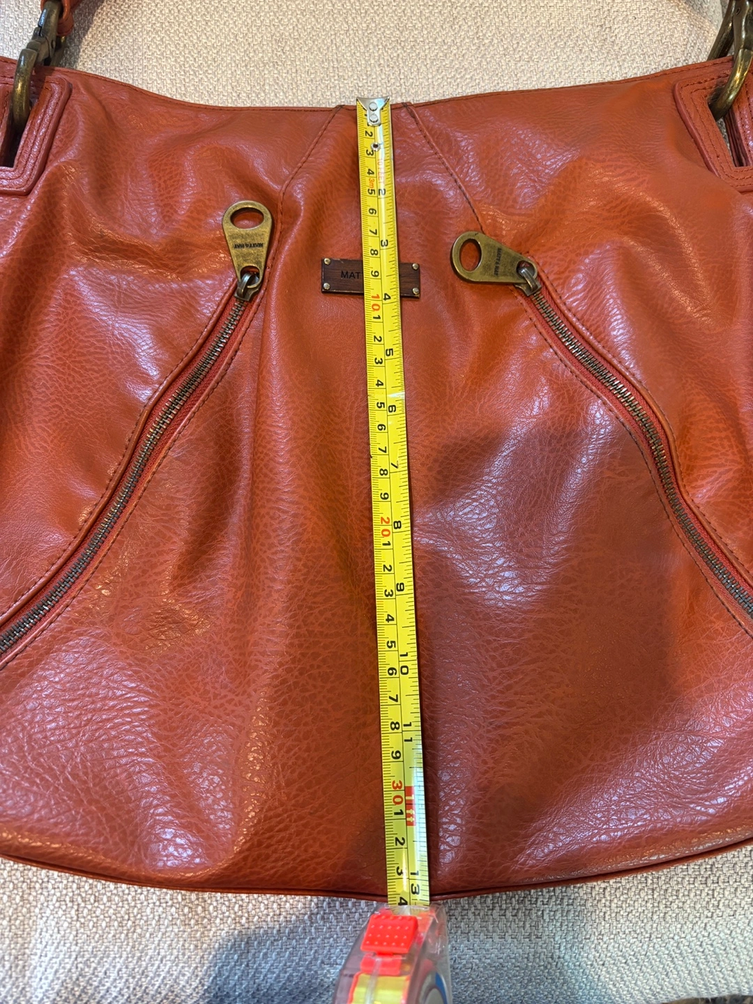 Beautiful burnt orange vegan leather shoulder bag. Features two zip compartments and one slip pocket inside. Top handle and roomy interior. Excellent for everyday use.