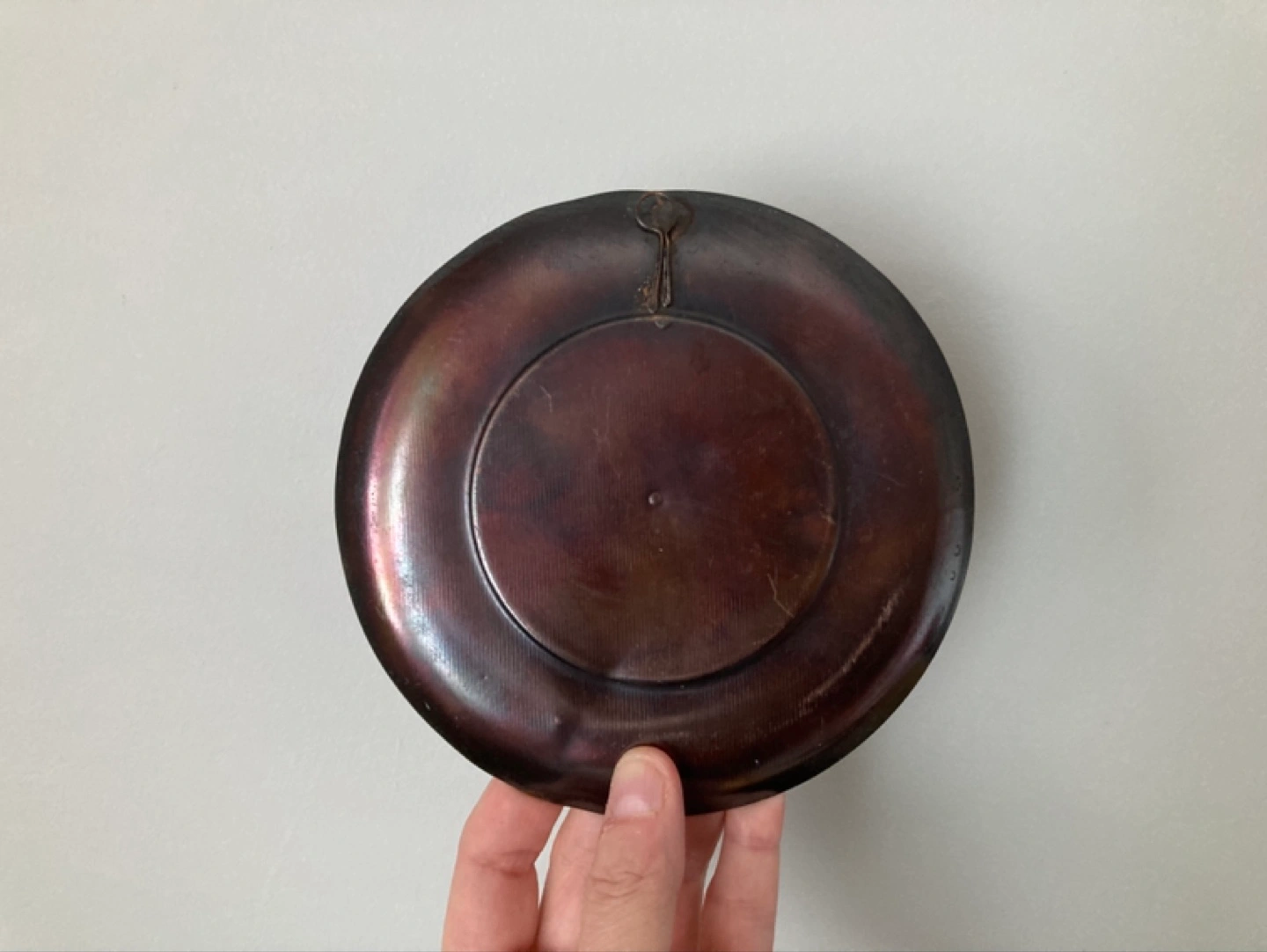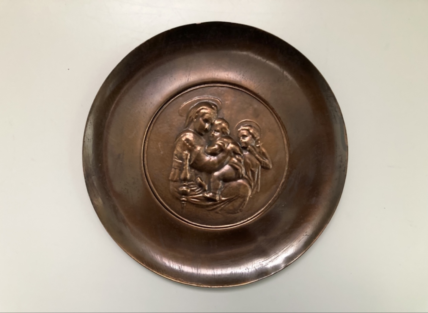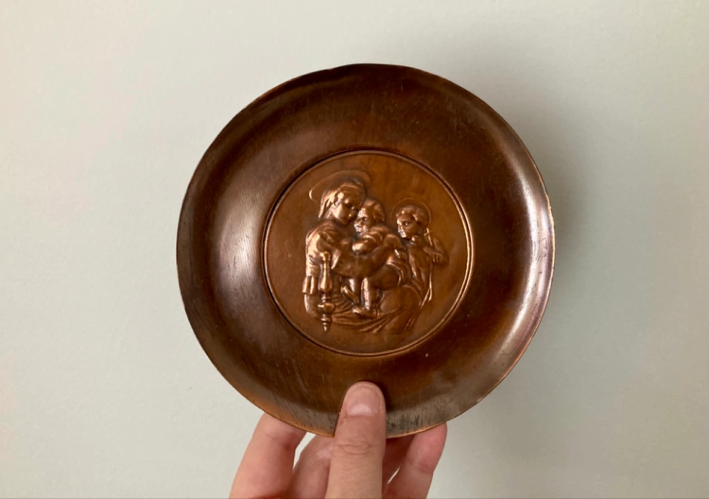 Small decorative wall hanging. Features embossed Madonna and Child image with angel. Dark copper colour. Unique vintage piece. There are some minor dents but otherwise good condition. 5.5” diameter. This would look sweet on its own or provide added texture to a gallery wall. Pick up in the Ossington and Davenport area.
