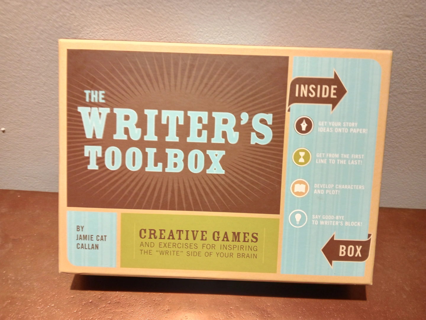 Writer's Toolbox game by Jamie Cat Callan. Includes cards, spinner, hourglass, and craft sticks. Fun creative writing prompts. Great for writers of all levels.