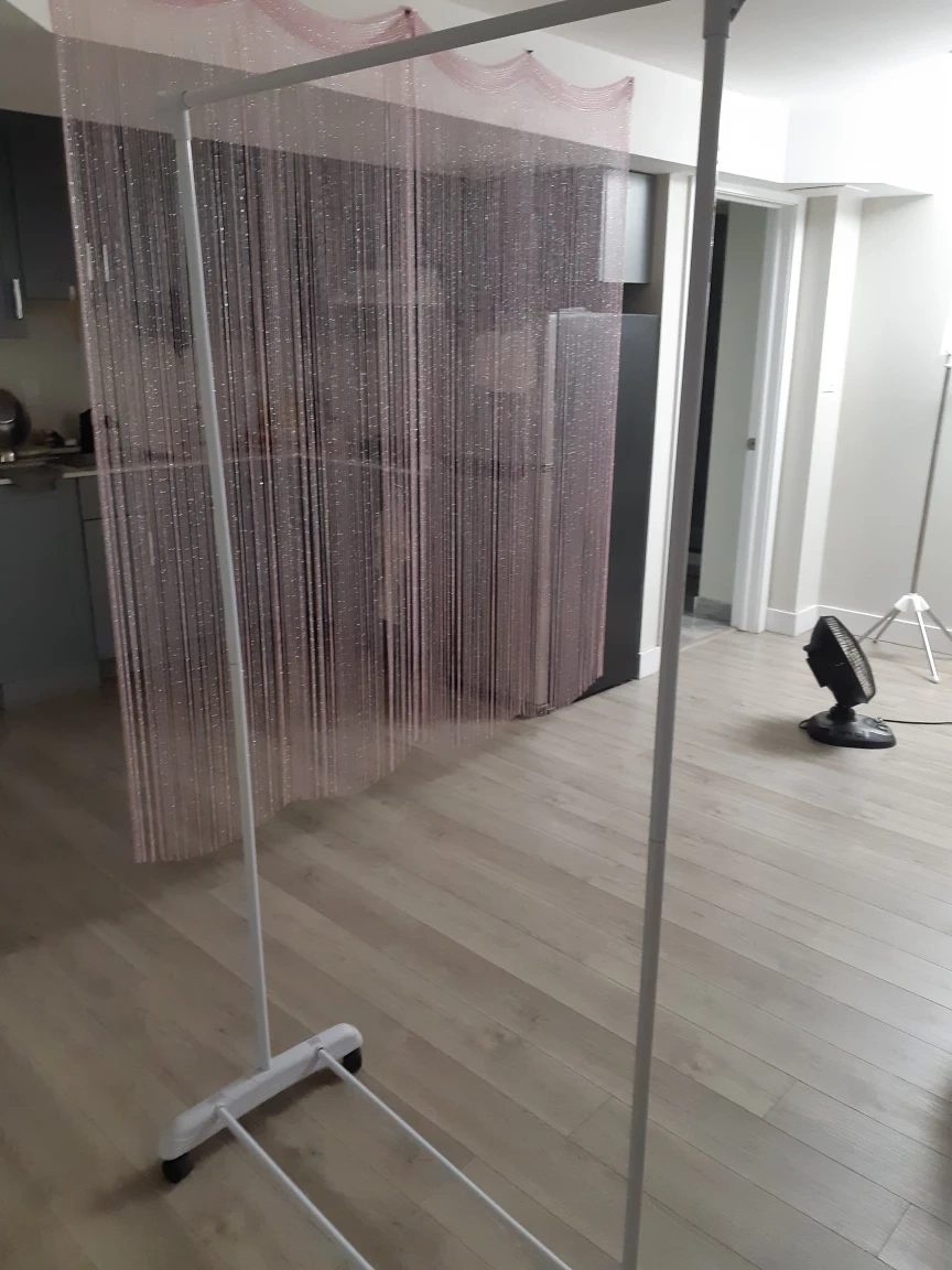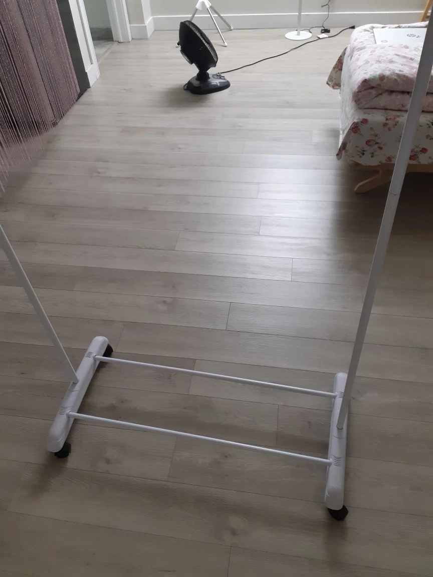 Portable clothing rack, great for small spaces. White frame, easily comes apart for storage. Four wheels for mobility. Simple assembly.