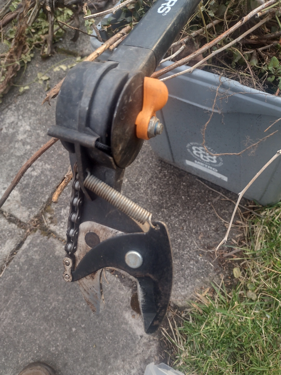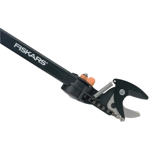 Fiskars Extendable loppers. Model # 1065428 Great for reaching high branches. 1-1/4" Dia capacity. Black pole 12' lg . Chain-driven cutting mechanism.