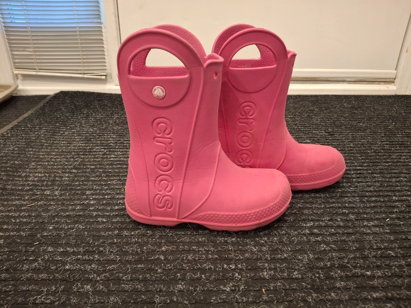 Adorable pink Crocs rain boots. Great for puddles and rainy days. Easy to clean. Kids' size J1.
