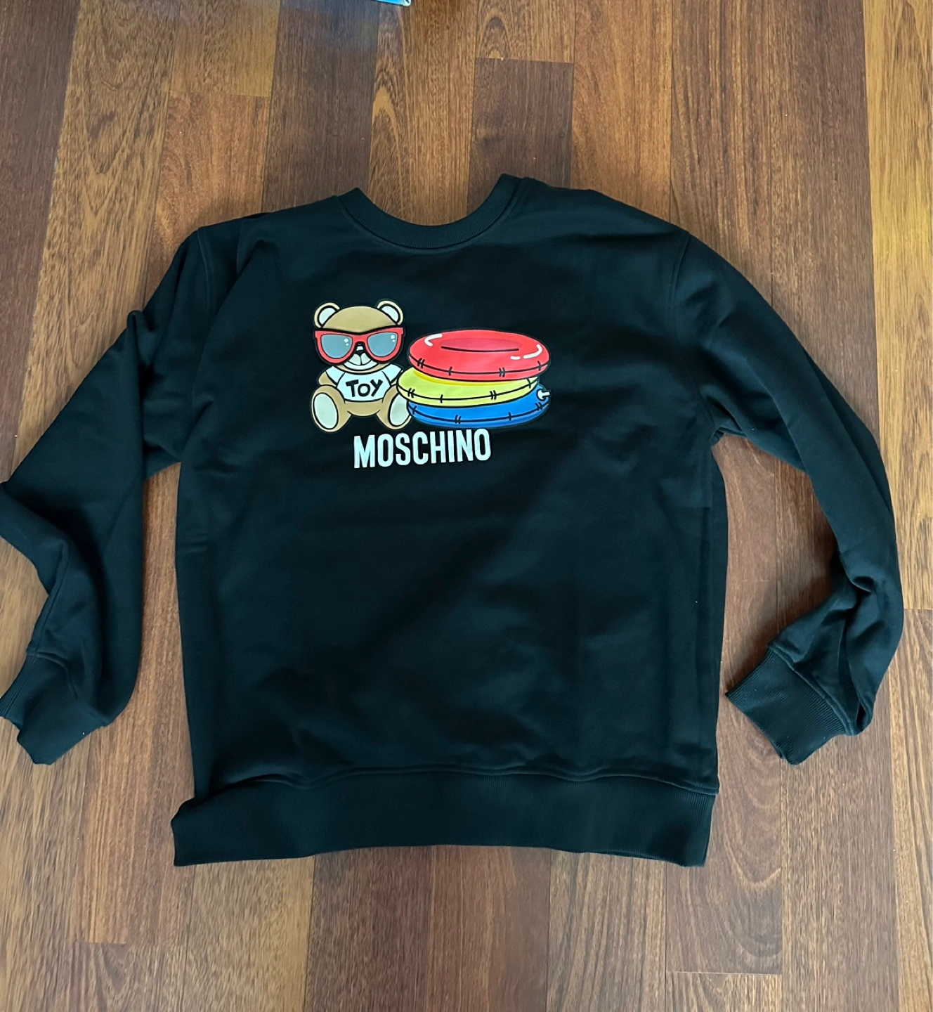 Black Moschino crewneck sweatshirt. Features a graphic of a teddy bear wearing sunglasses and inflatable rings. Long sleeves, relaxed fit. Great for casual wear. Yonge and finch pick up $80 cash only