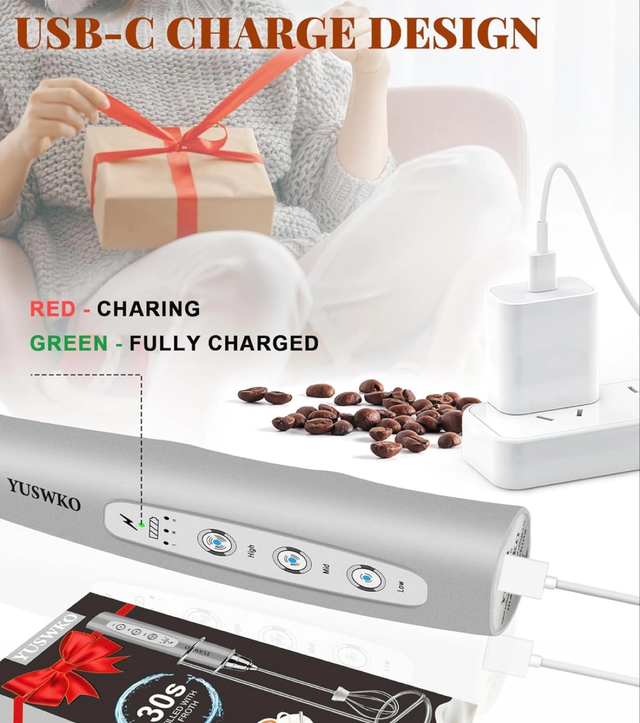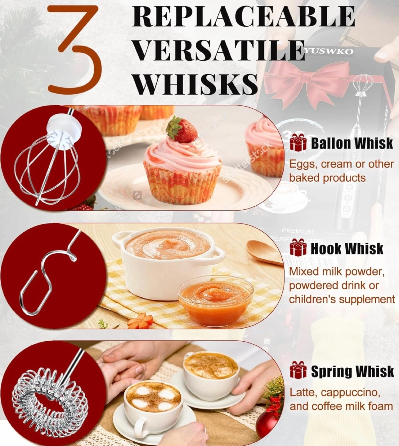 Three interchangeable whisks: balloon, hook, and spring. USB-C charging. Stylish stand included. Easy to clean. Perfect for lattes, cappuccinos, hot chocolate, and more.