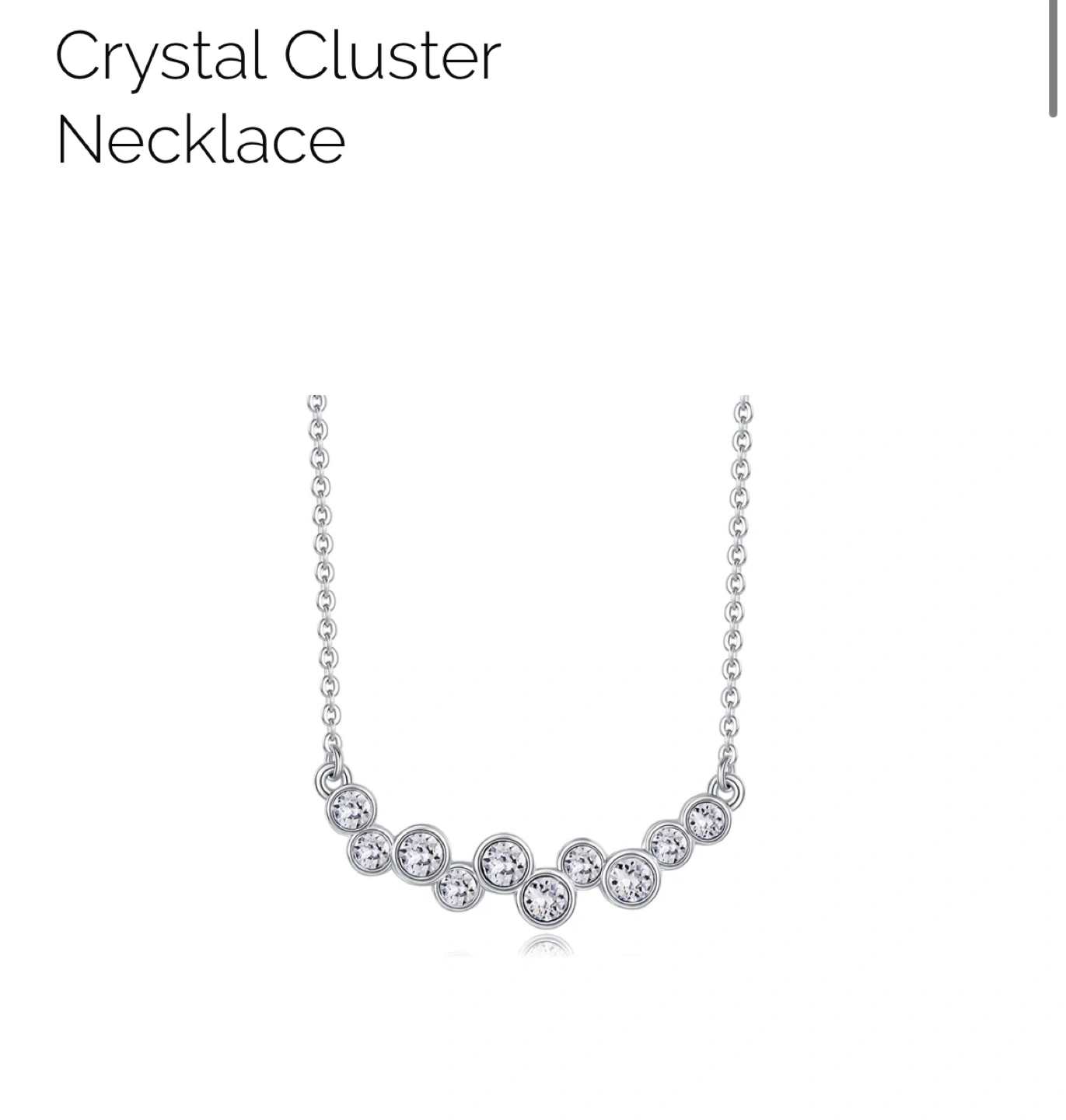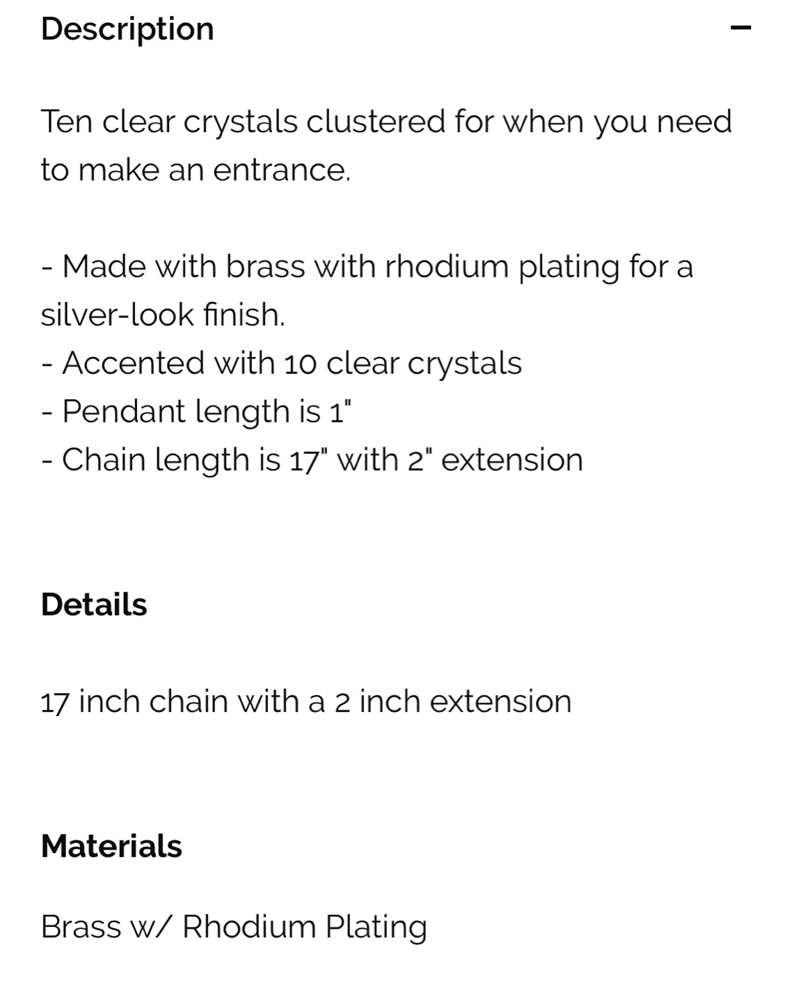 Ten clear crystals clustered necklace. Brass with rhodium plating for silver look. Pendant length 1". Chain length 17" with 2" extension.