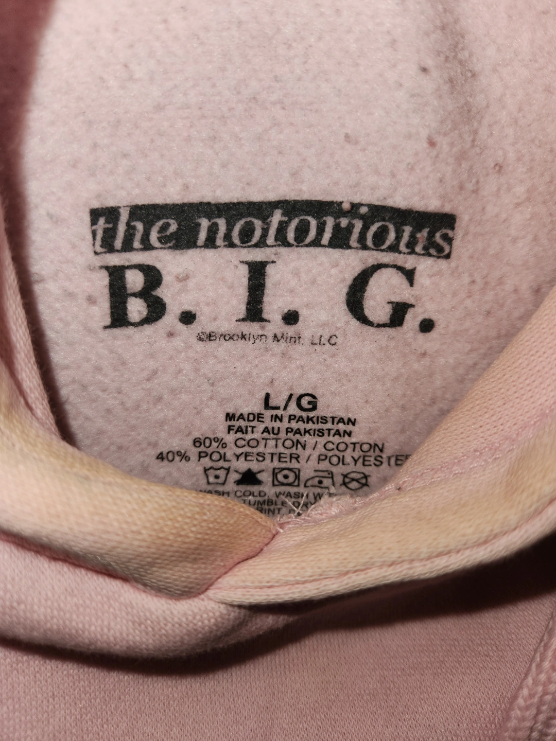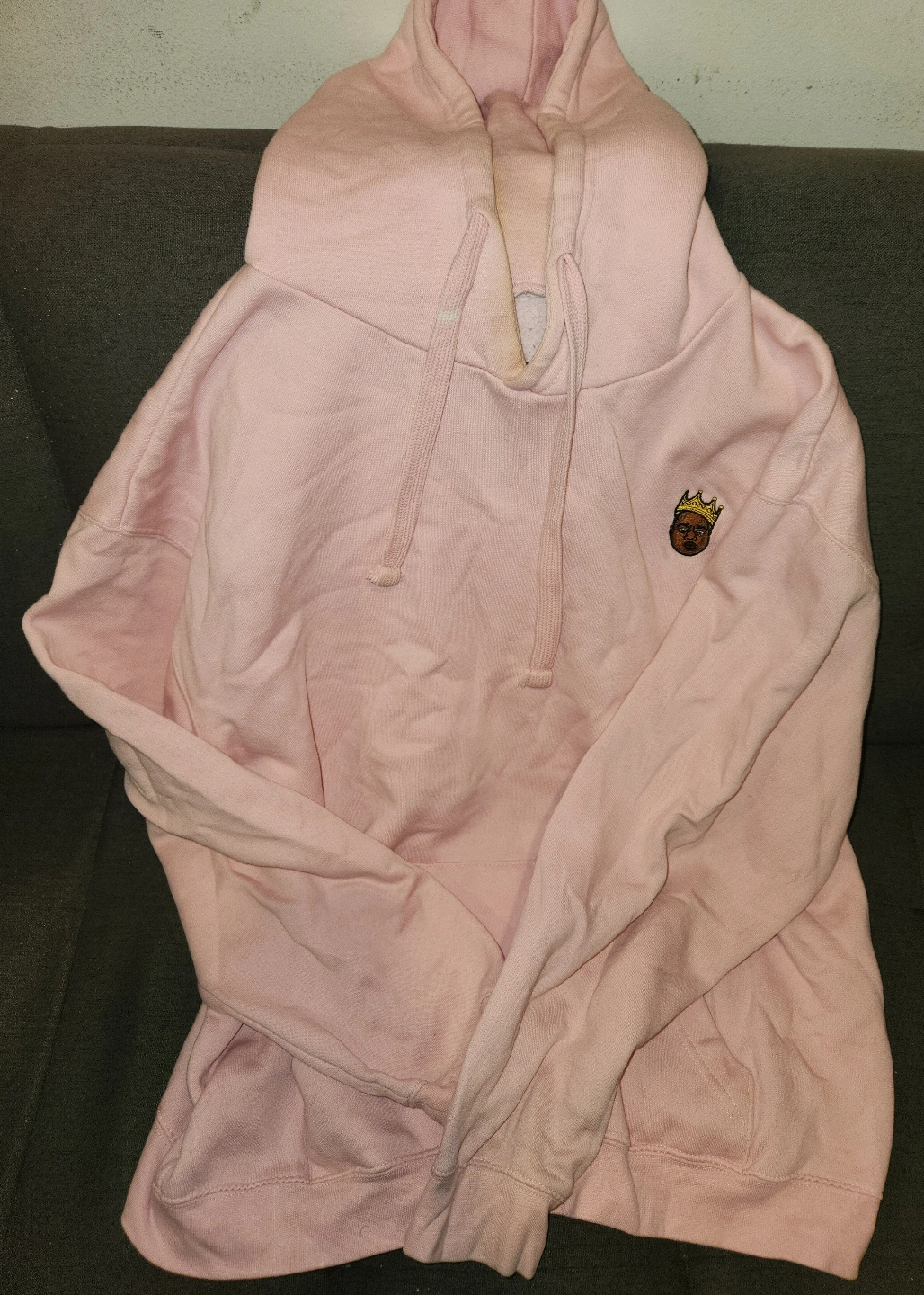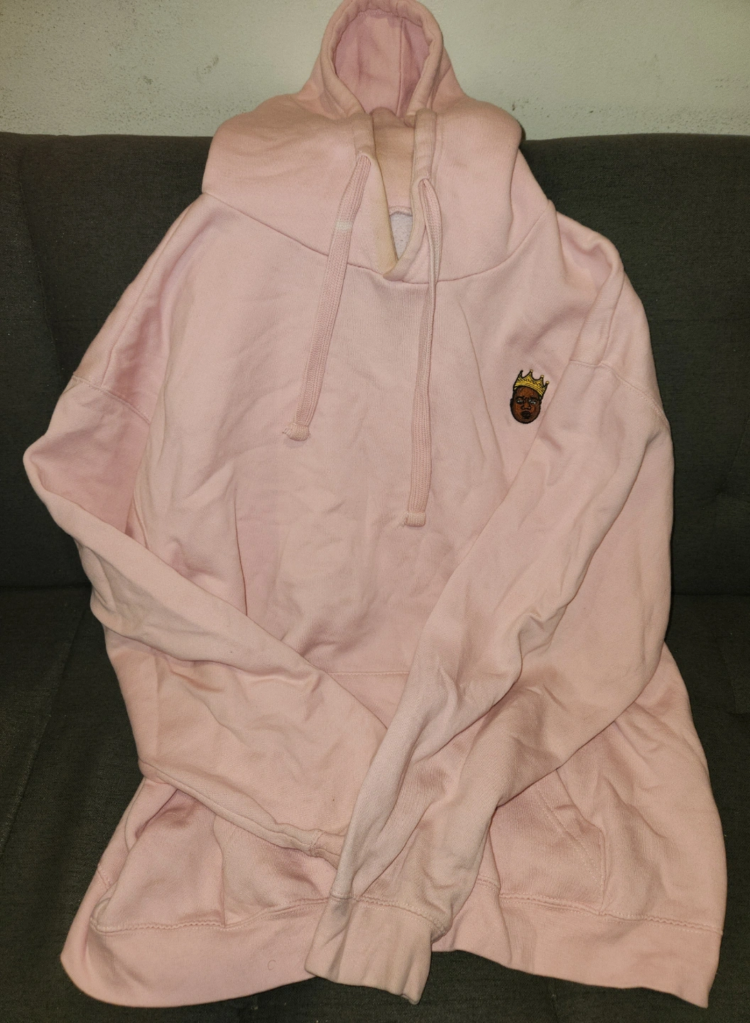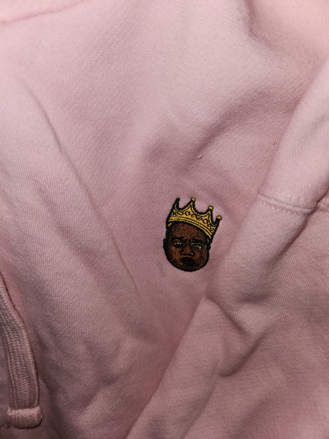 Large unisex baby pink Notorious B.I.G. hoodie. Features a small embroidered image of Biggie wearing a crown. 60% cotton, 40% polyester.
