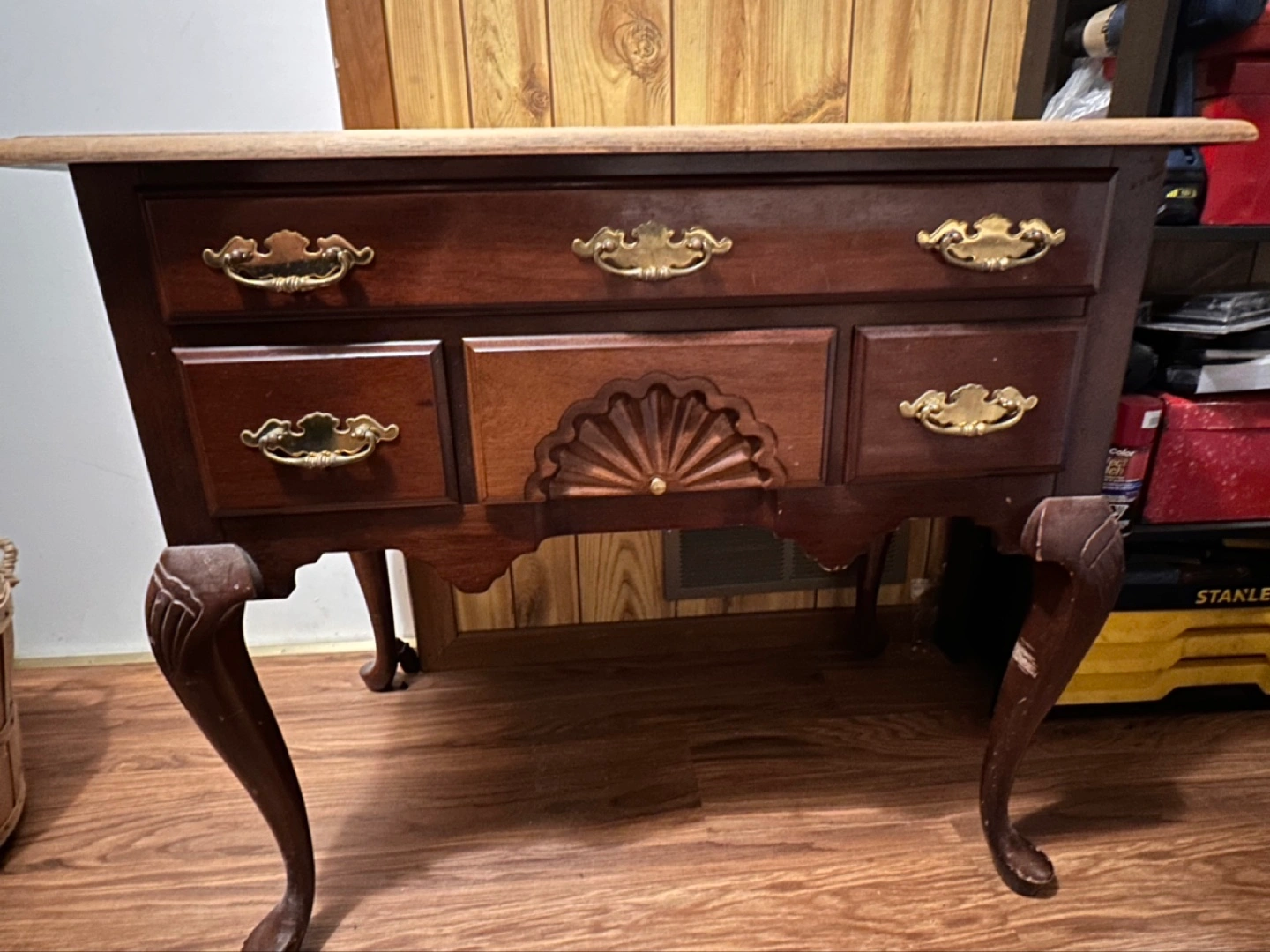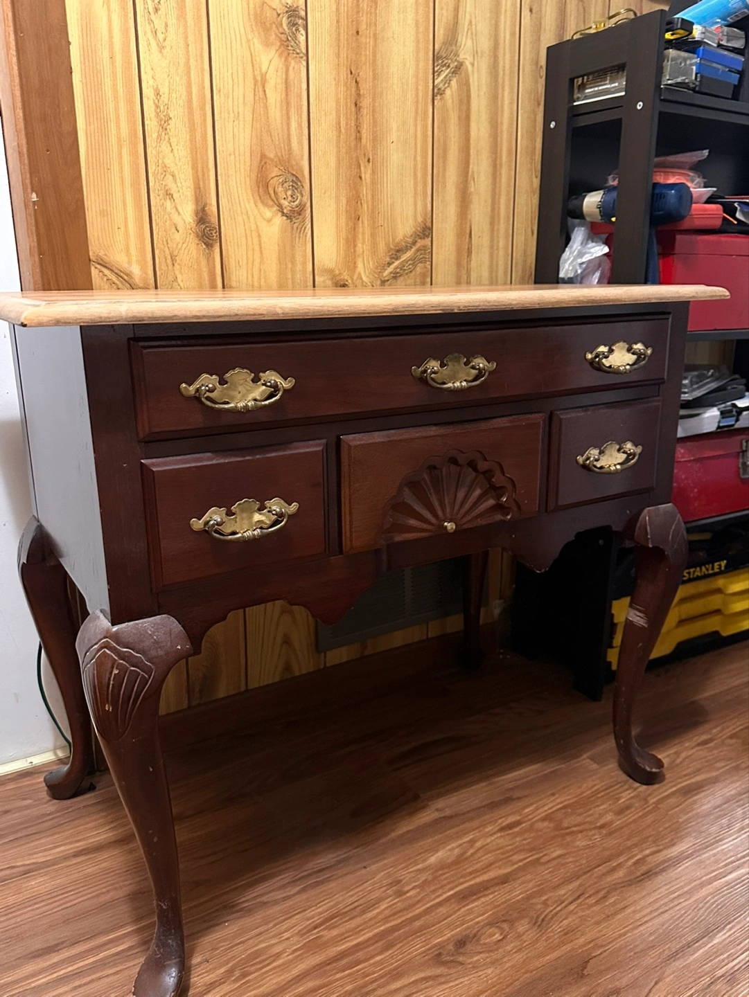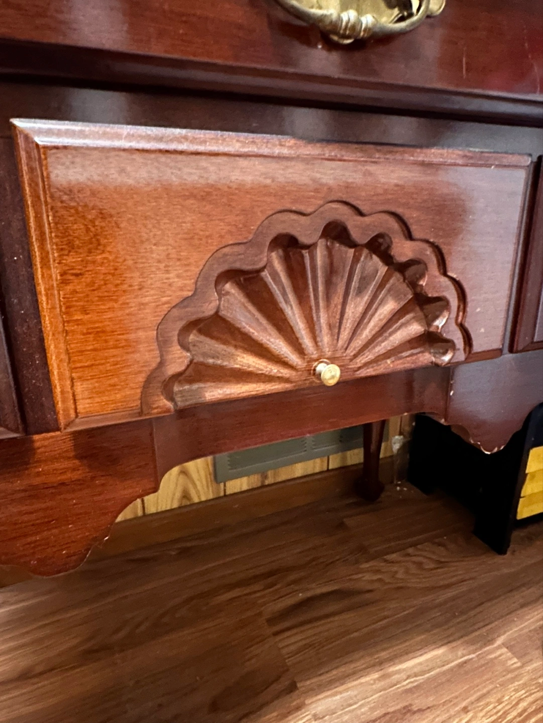 Beautiful solid wood Five-drawer wooden chest. Dark brown wood finish. Brass drawer pulls. Cabriole legs. Intricate carving on one drawer. Shows some wear.