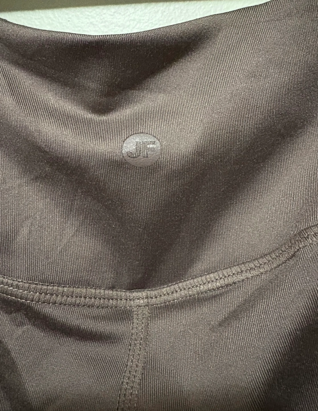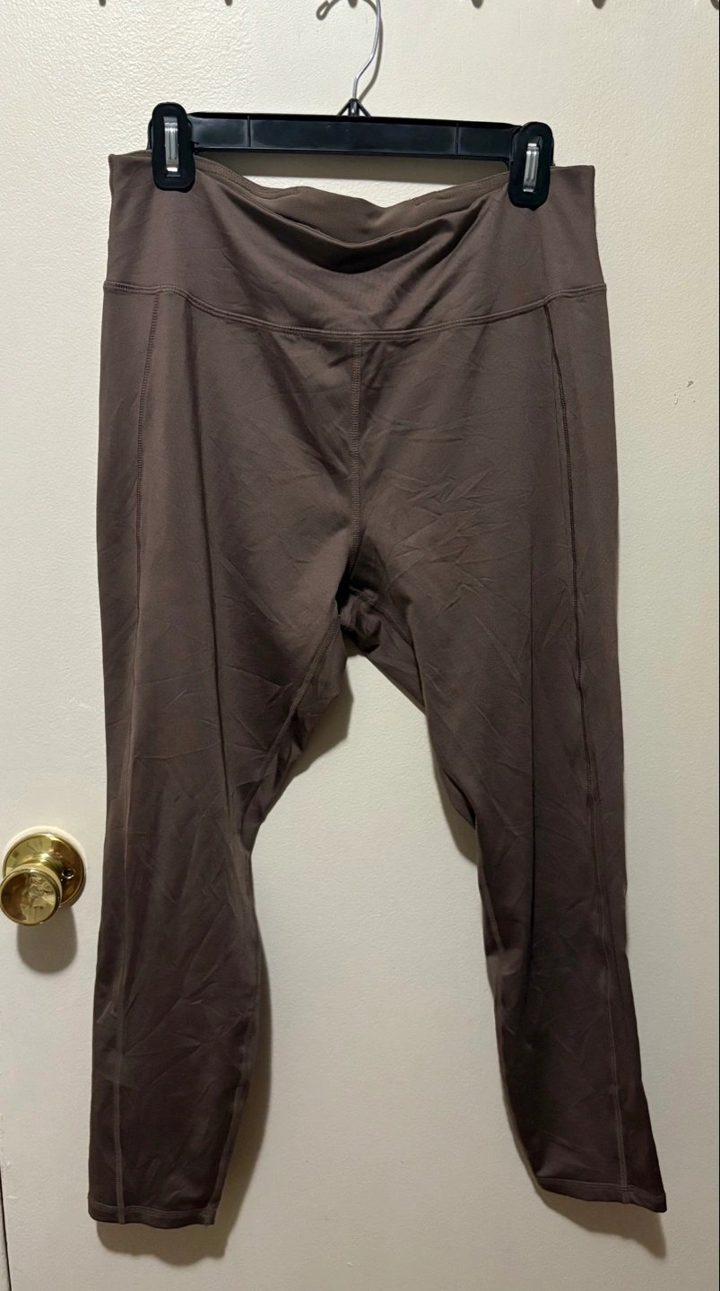 Brown high-waisted leggings. Size large. Features a subtle sheen. Good for working out or casual wear. In excellent condition.