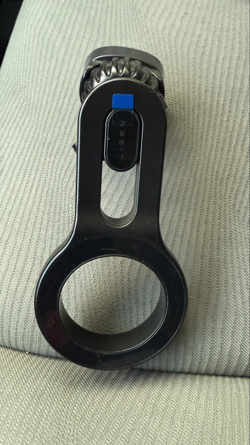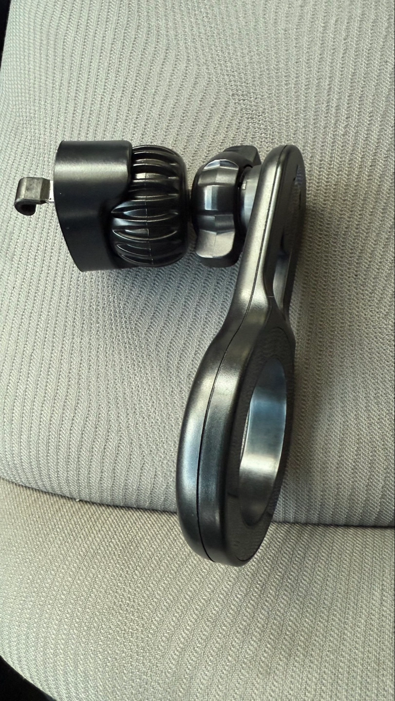 Black plastic phone holder. Mounts to headrest. Adjustable viewing angle. Simple design.