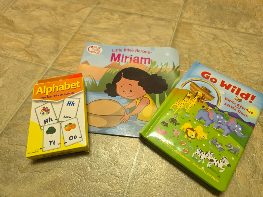 Bundle includes three Little Bible Heroes books: Daniel, Miriam, and a Go Wild! Bible Stories book. Also includes an alphabet flashcard set. Great for children's learning and storytelling.