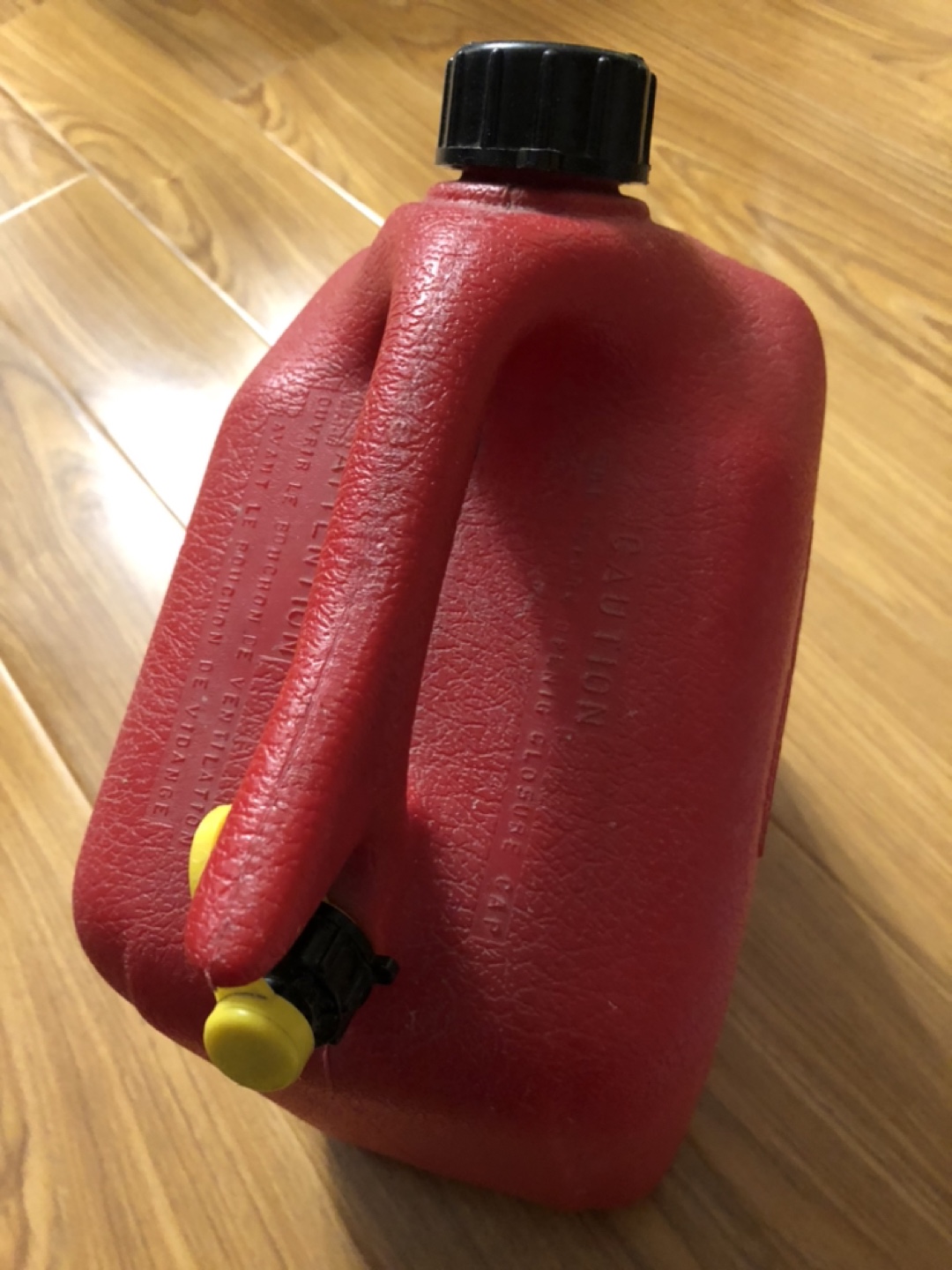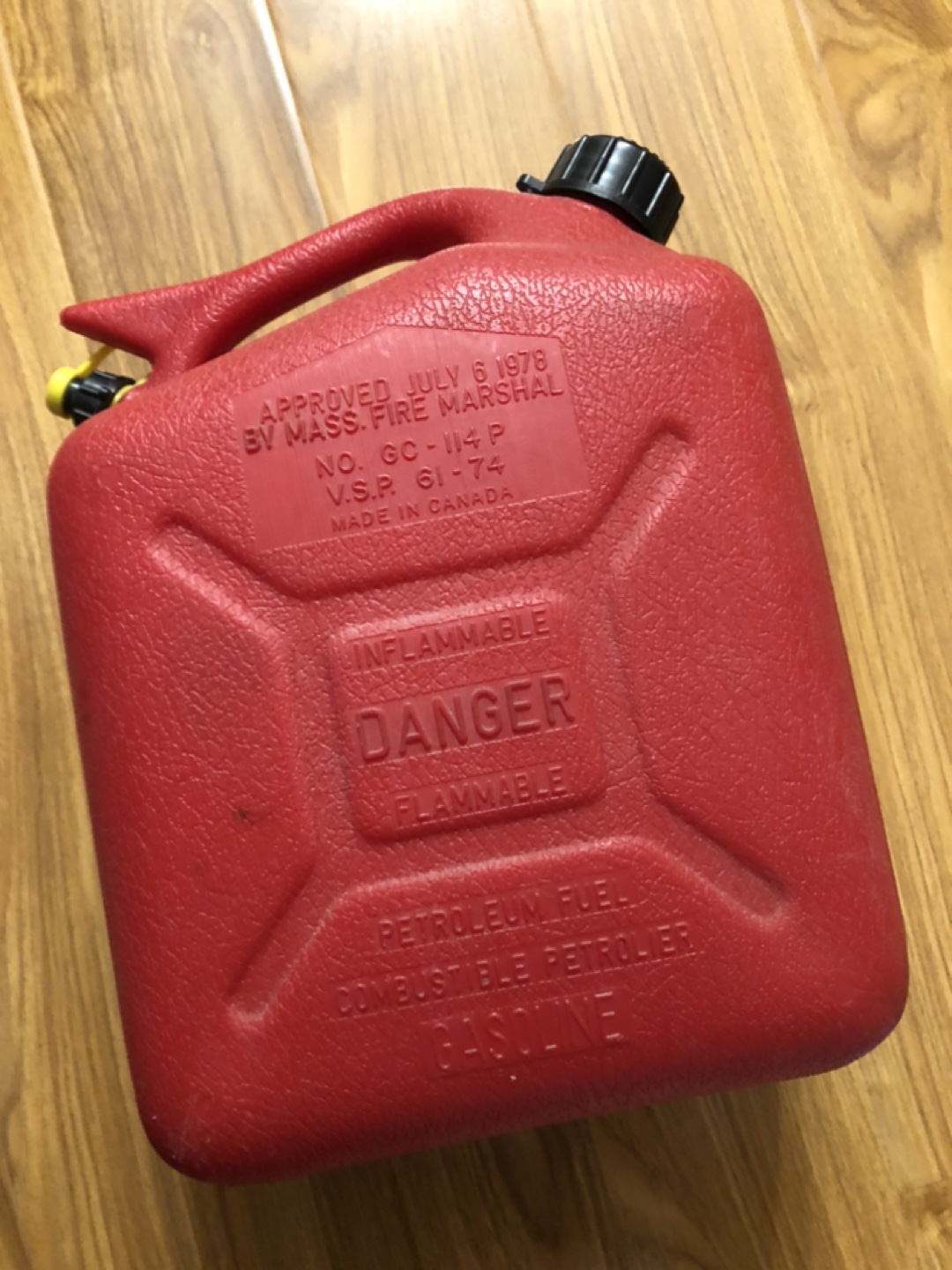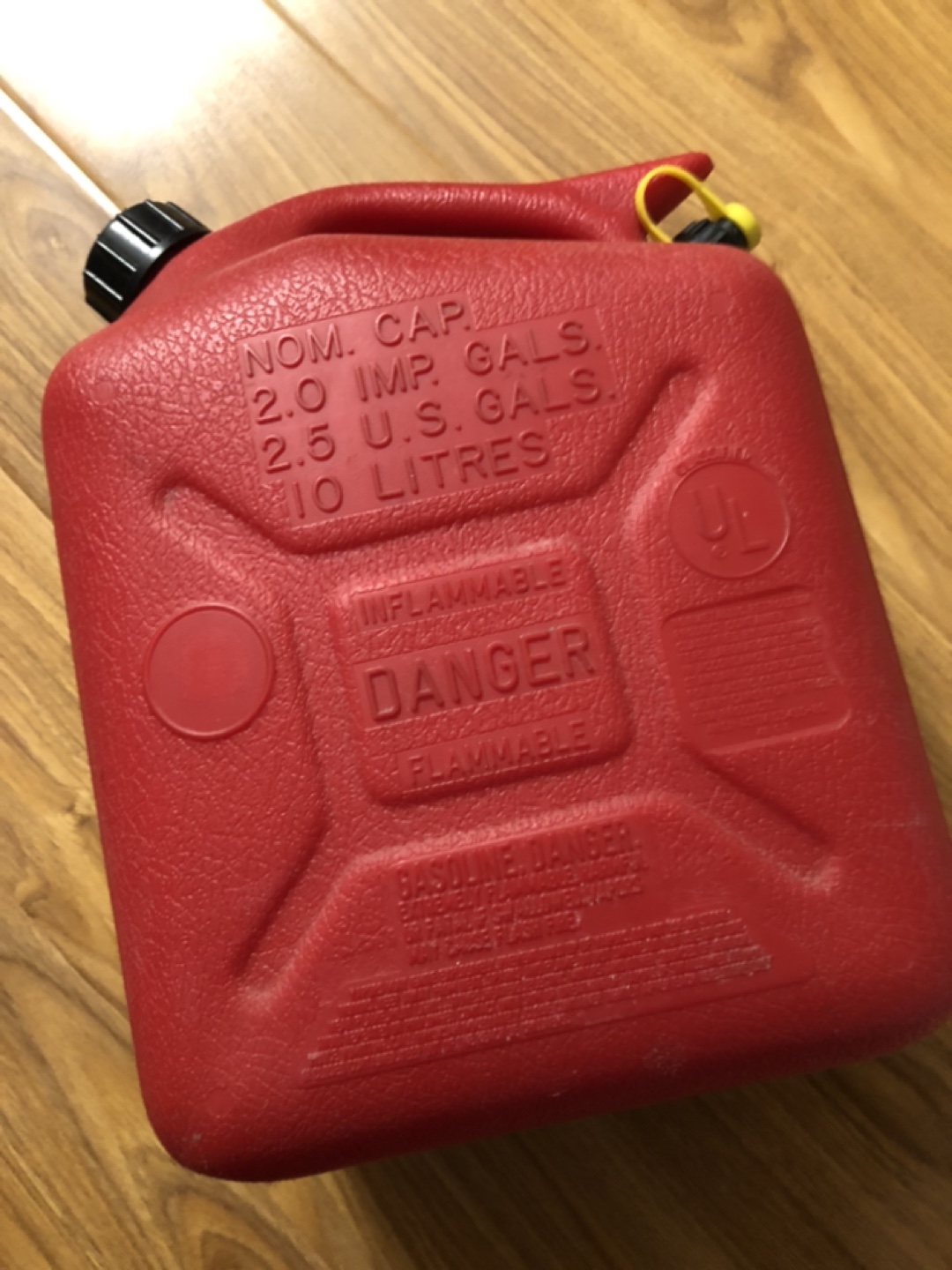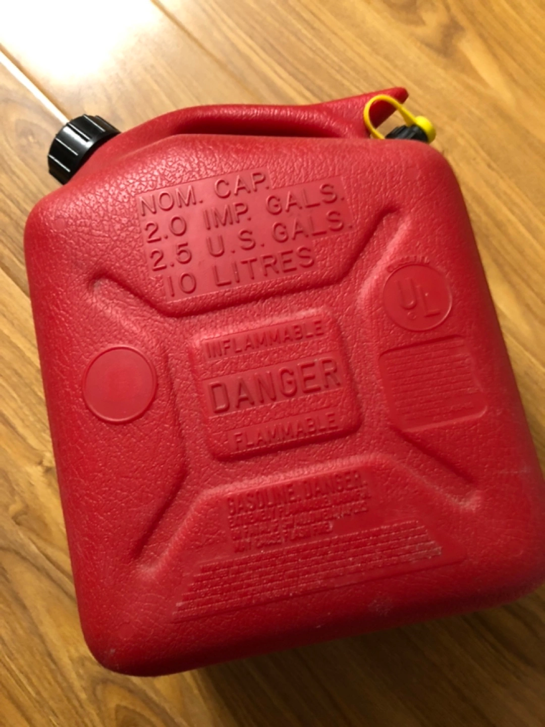 Red plastic gasoline container. Holds 10 litres, 2.5 US gallons, or 2.0 imperial gallons. Made in Canada.