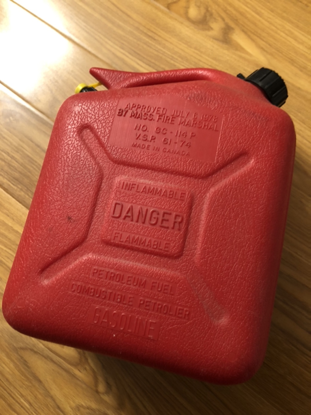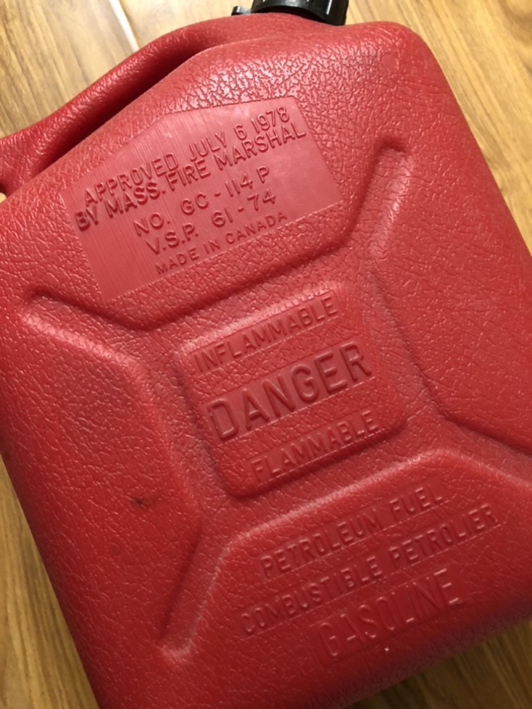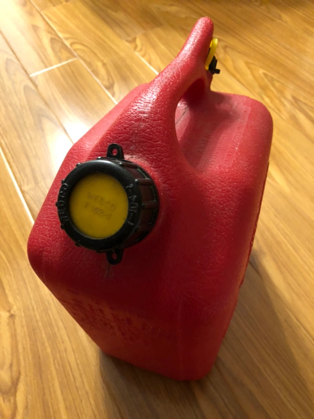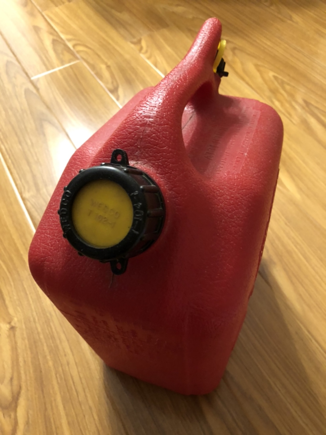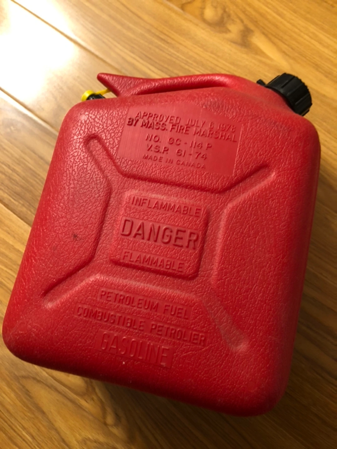Red plastic gasoline container. Holds 10 litres, 2.5 US gallons, or 2.0 imperial gallons. Made in Canada.