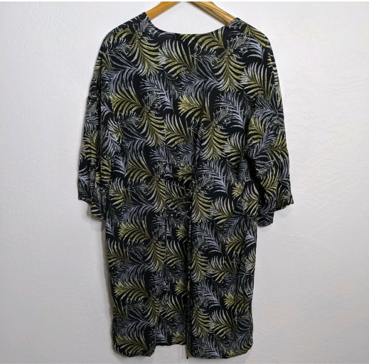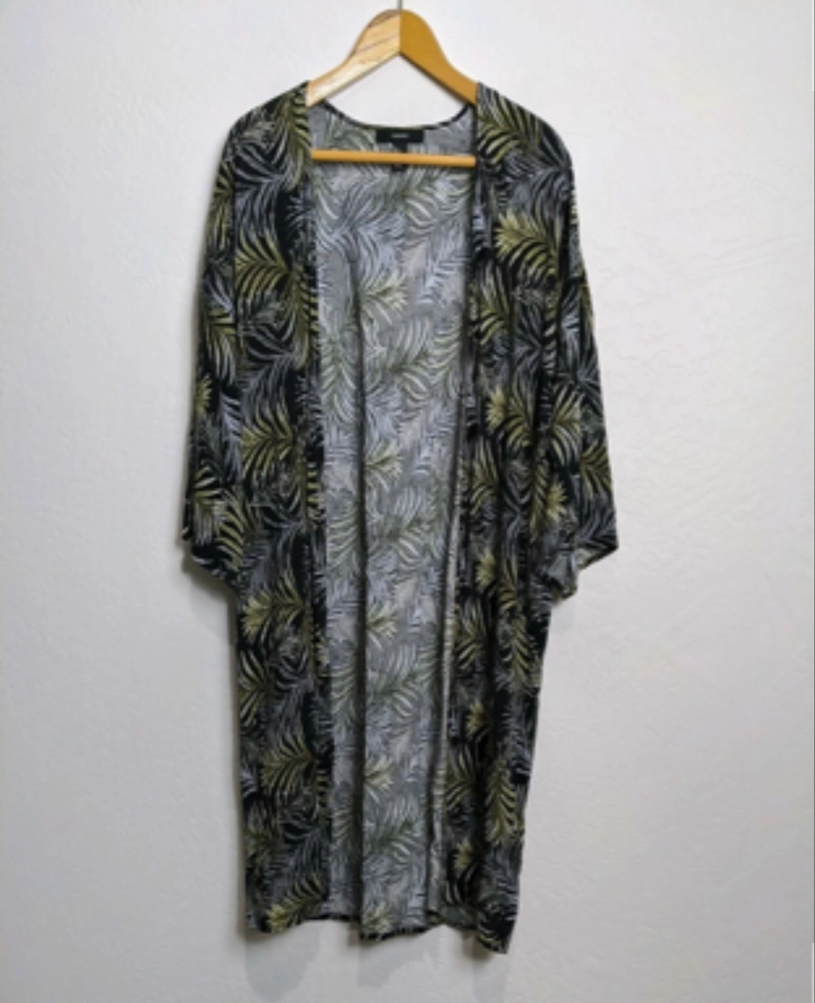 Lightweight kimono cardigan. Three-quarter sleeves. Open front. Black background with gold and grey palm leaf print. Lacing detail at back.