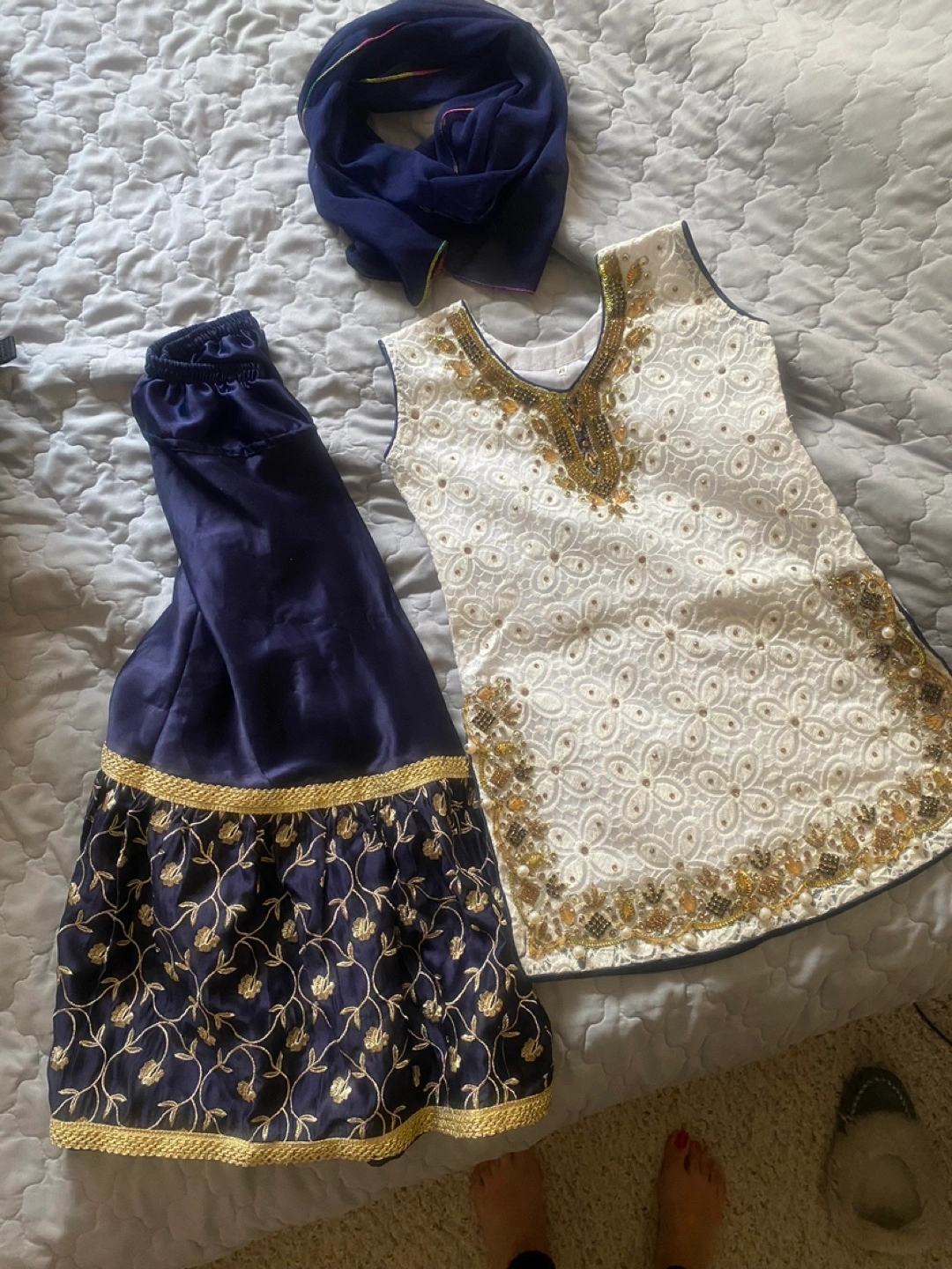 Beautiful girls' three-piece outfit. Features a white embroidered kameez, navy blue shalwar, and matching dupatta. Gold embroidery accents the outfit. for special occasions.