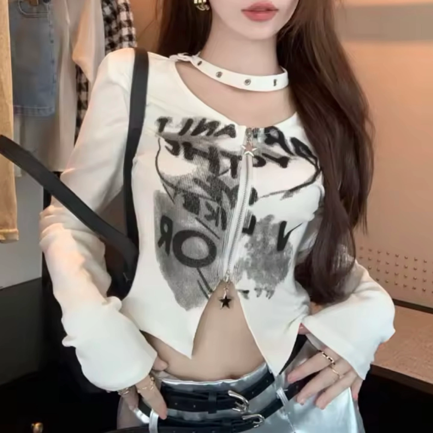 Unique cropped long-sleeve top. Features a front zip closure and graphic print. Stylish and edgy design. Perfect for layering or wearing alone.