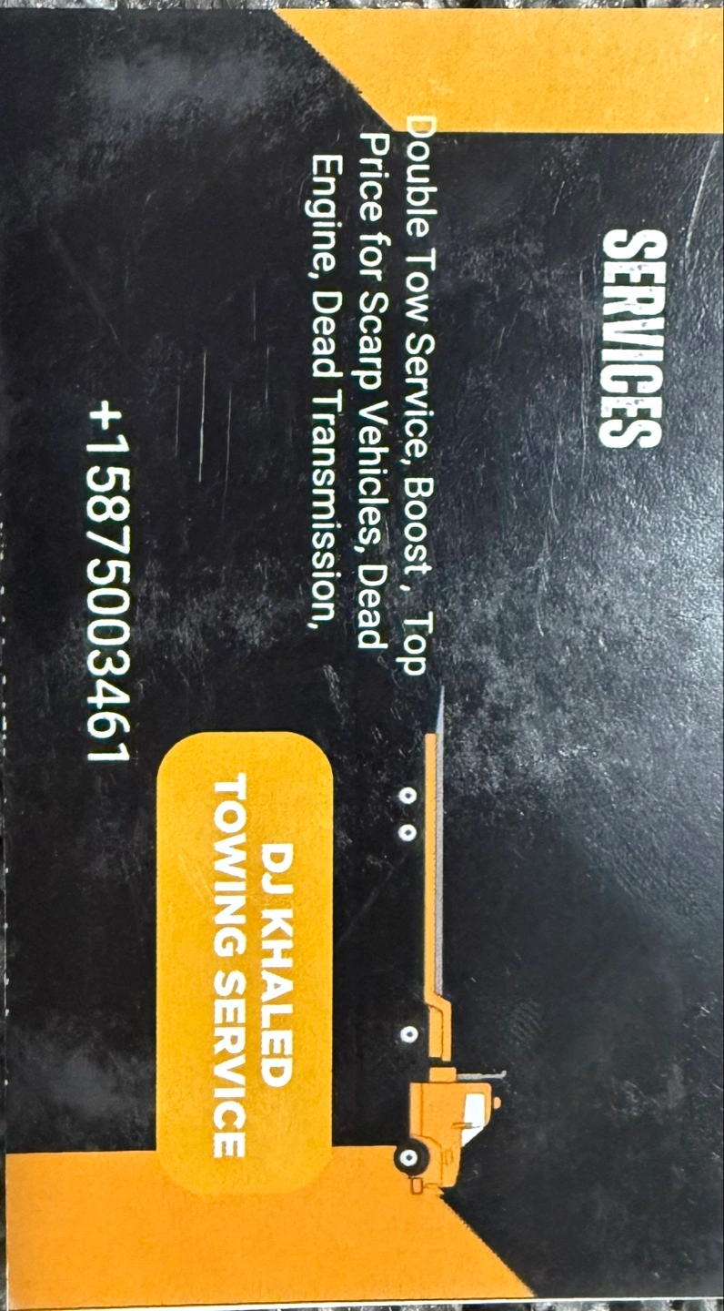 Business card for DJ Khaled Towing Service. Includes phone number and services offered. Double tow service, boost, top price for scrap vehicles, dead engine and transmission services.
