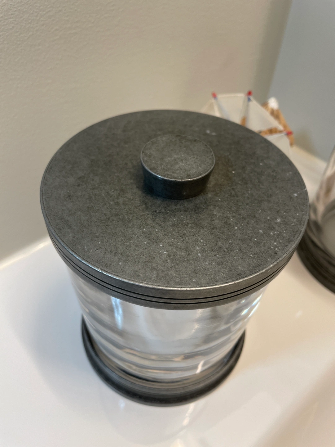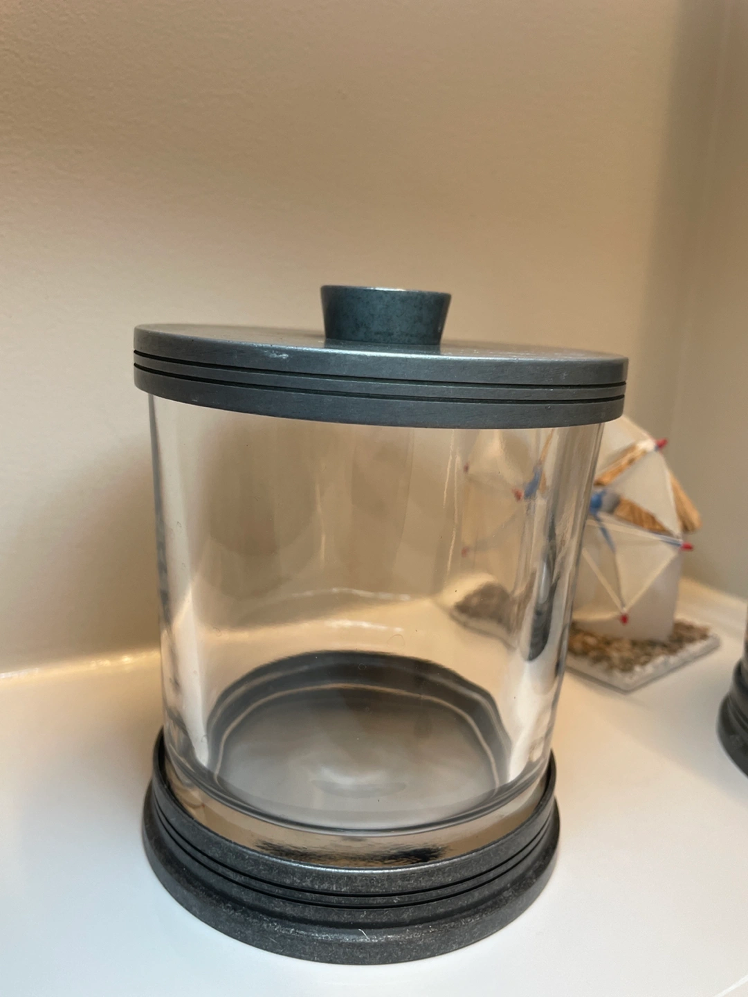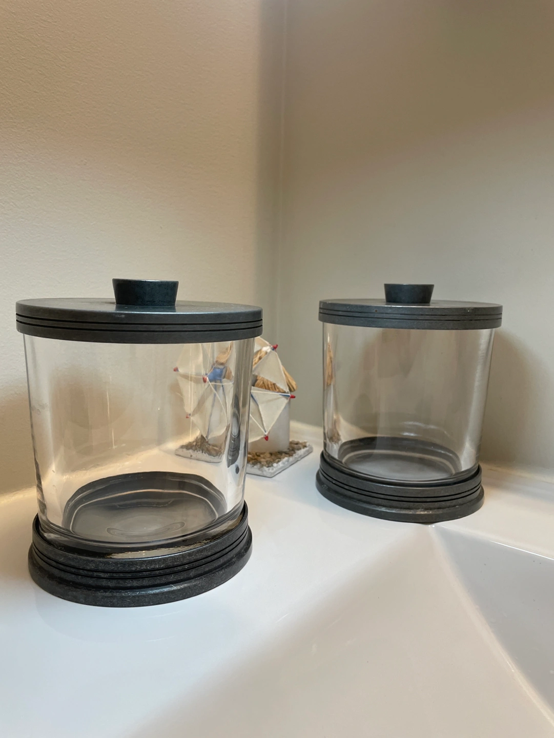 Thick strong glass containers/ jars with metal details. Heavy, used and well taken care of. Would consider selling separate if you would like to make an offer.