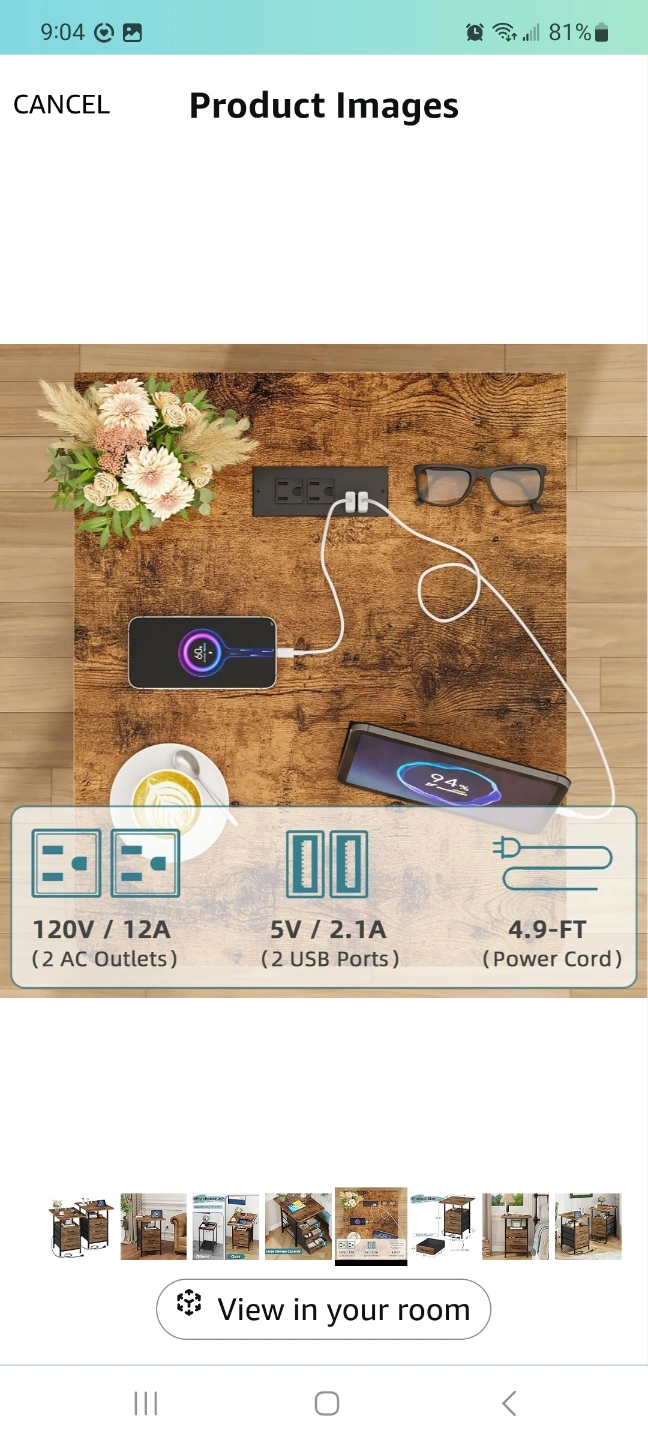 Rustic brown bedside table. Three fabric drawers. Fast charging station. Spacious storage. Includes USB ports and AC outlets. 19" x 15" tabletop.