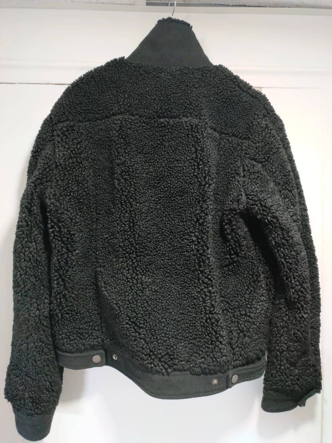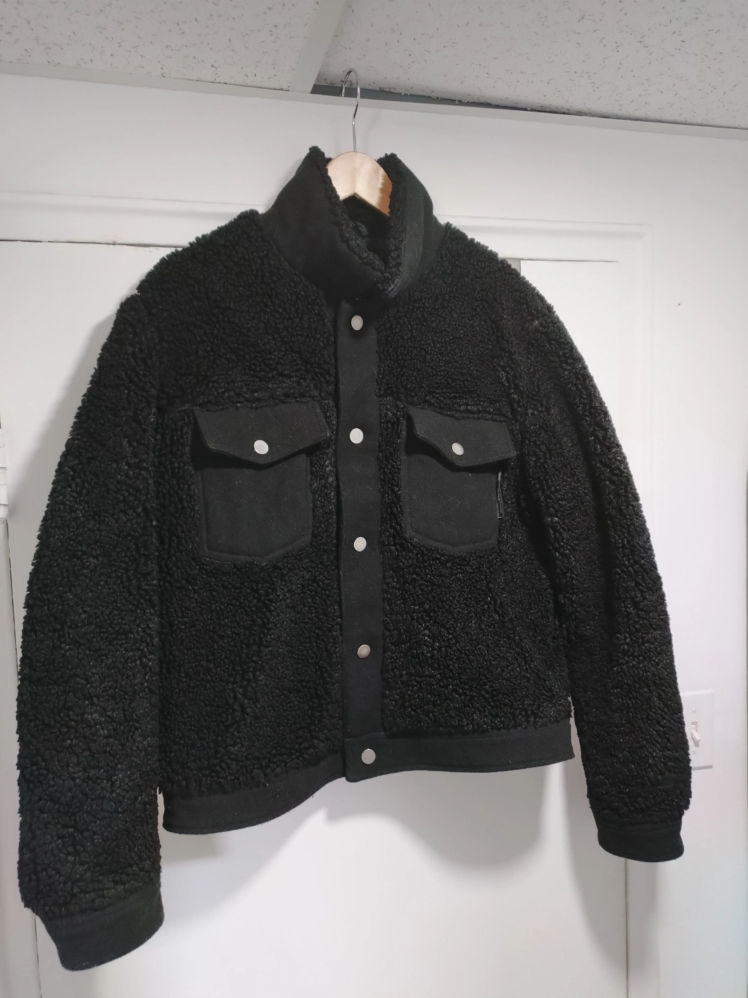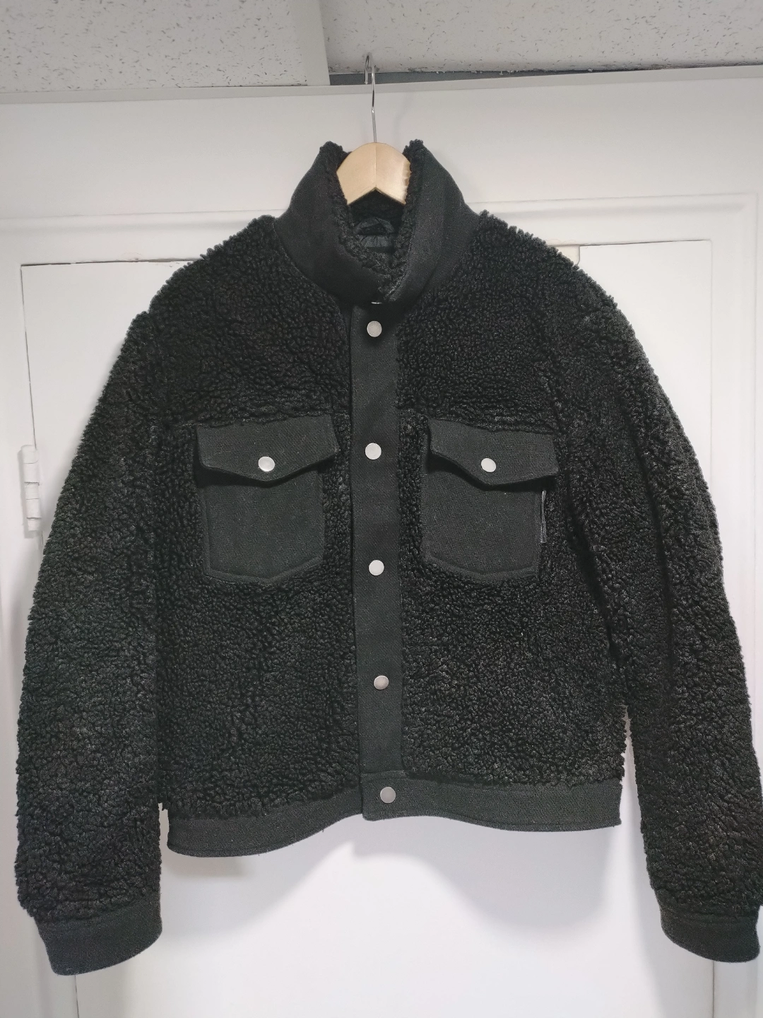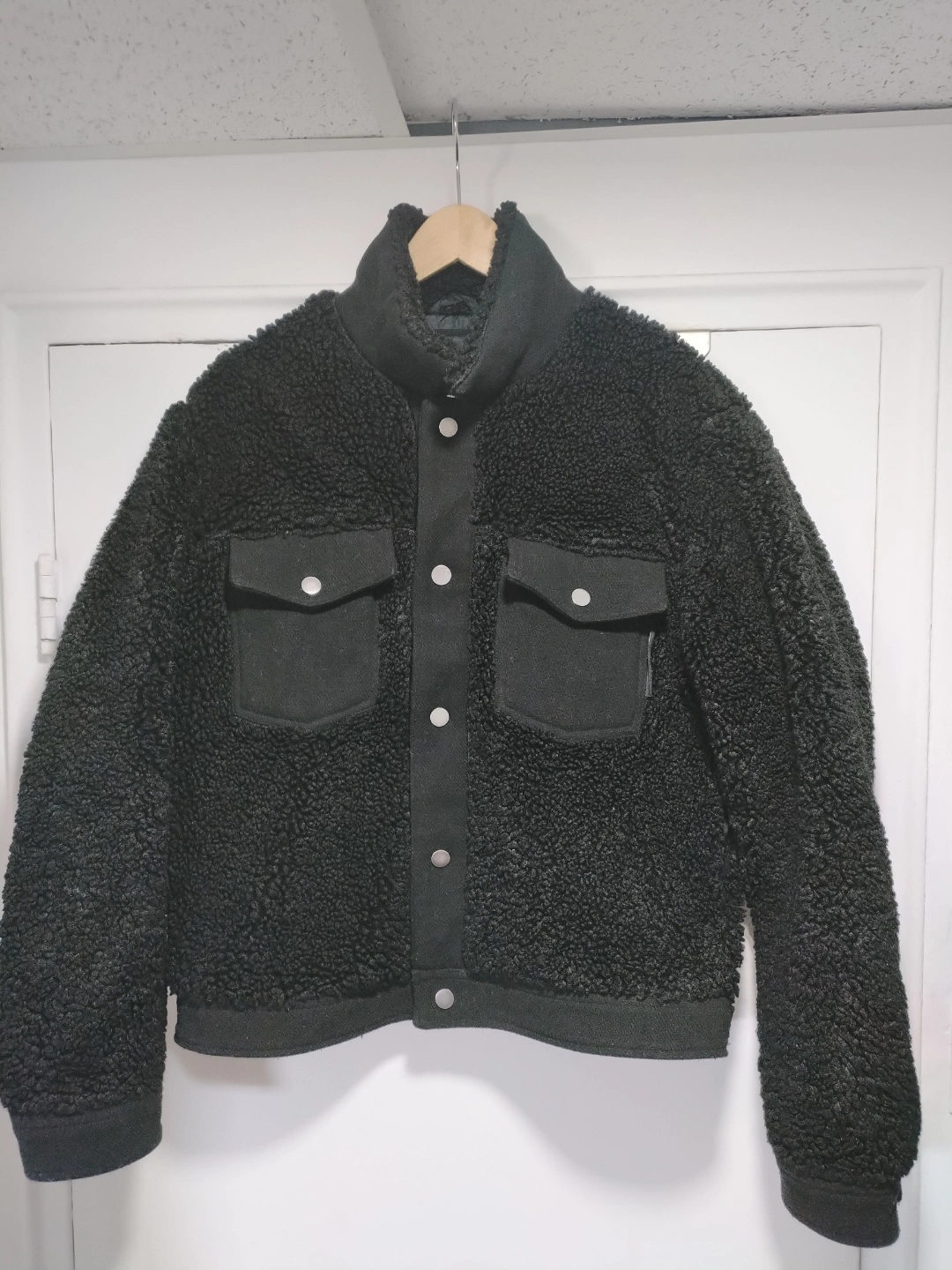 Black teddy jacket. Button closure. Flap pockets. Soft material. Size 40. large but it's a small fitted.