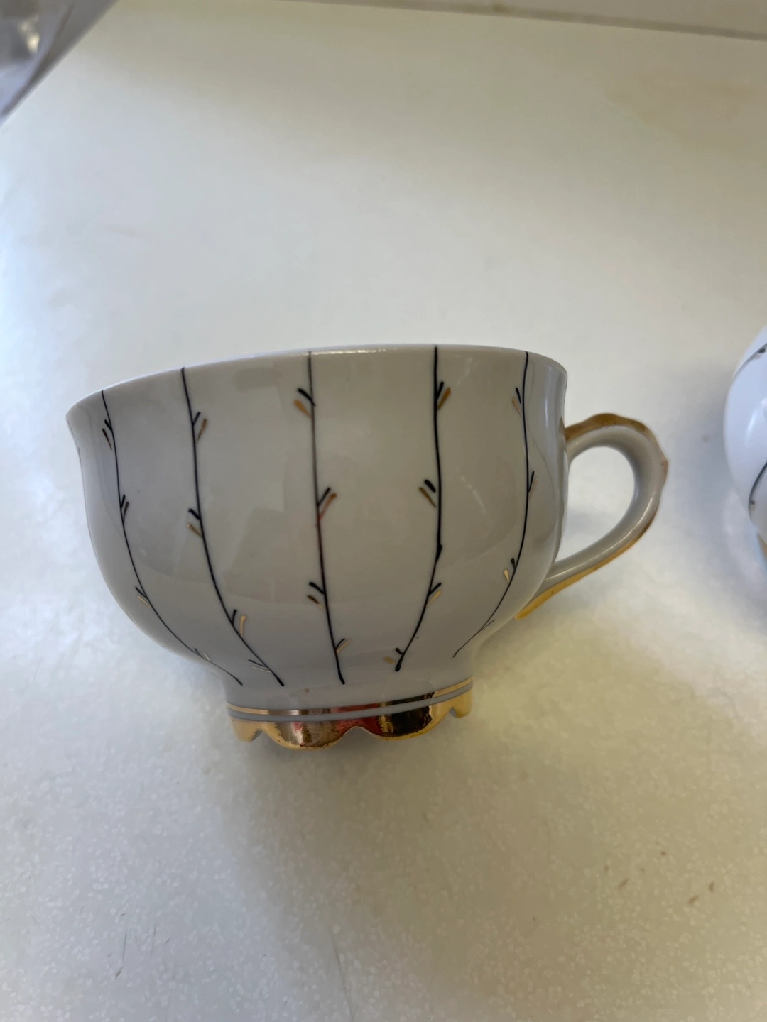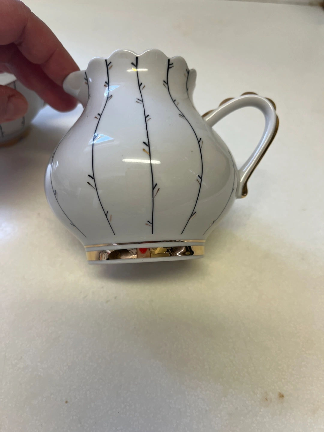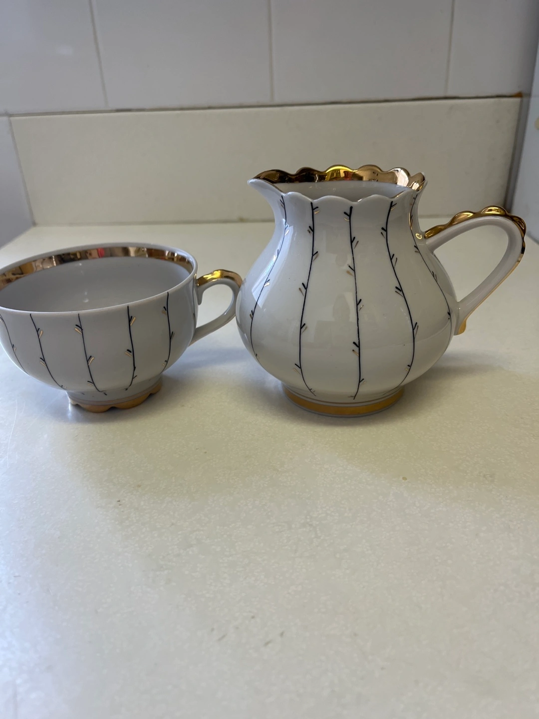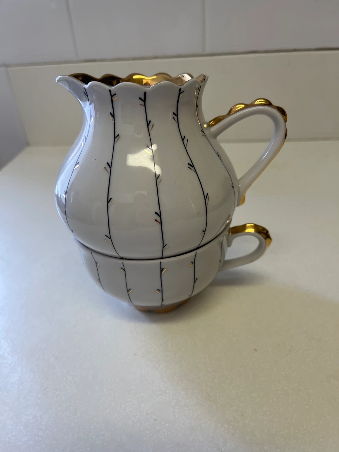 Adorable vintage creamer and cup set. Features delicate gold trim and unique pattern. Perfect for tea parties or adding a touch of elegance to your kitchen.