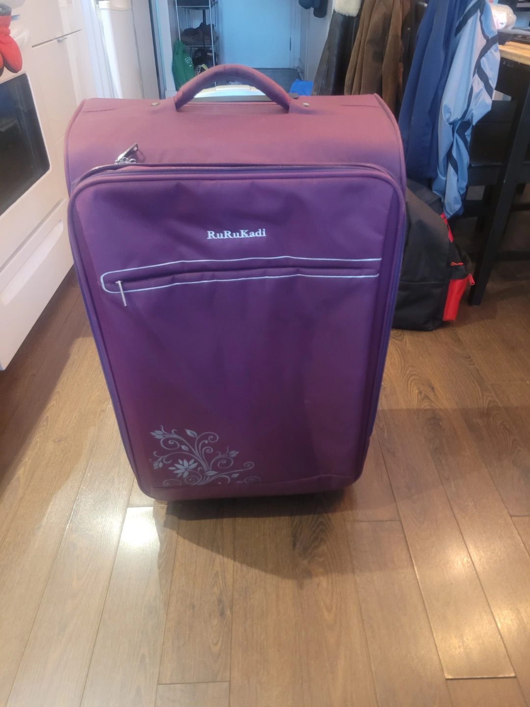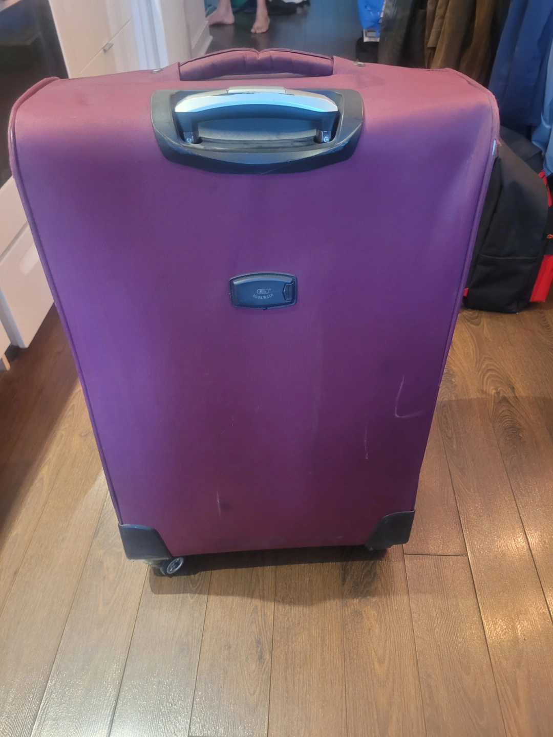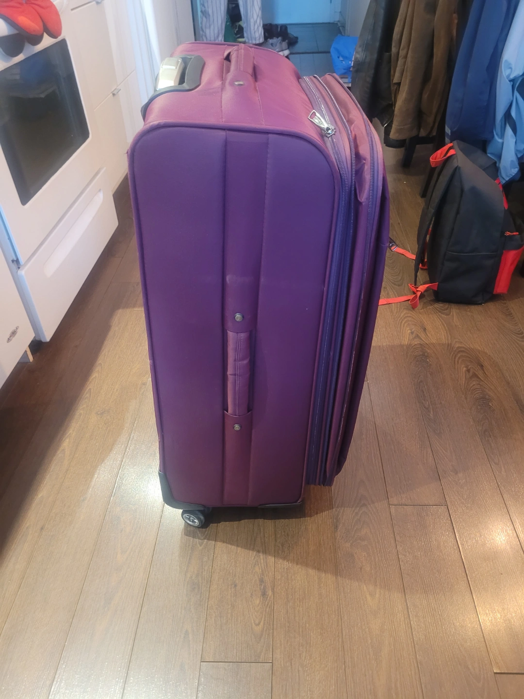335Large purple suitcase. Four wheels. Top and side carry handles. TSA-approved lock. Some minor wear and tear.