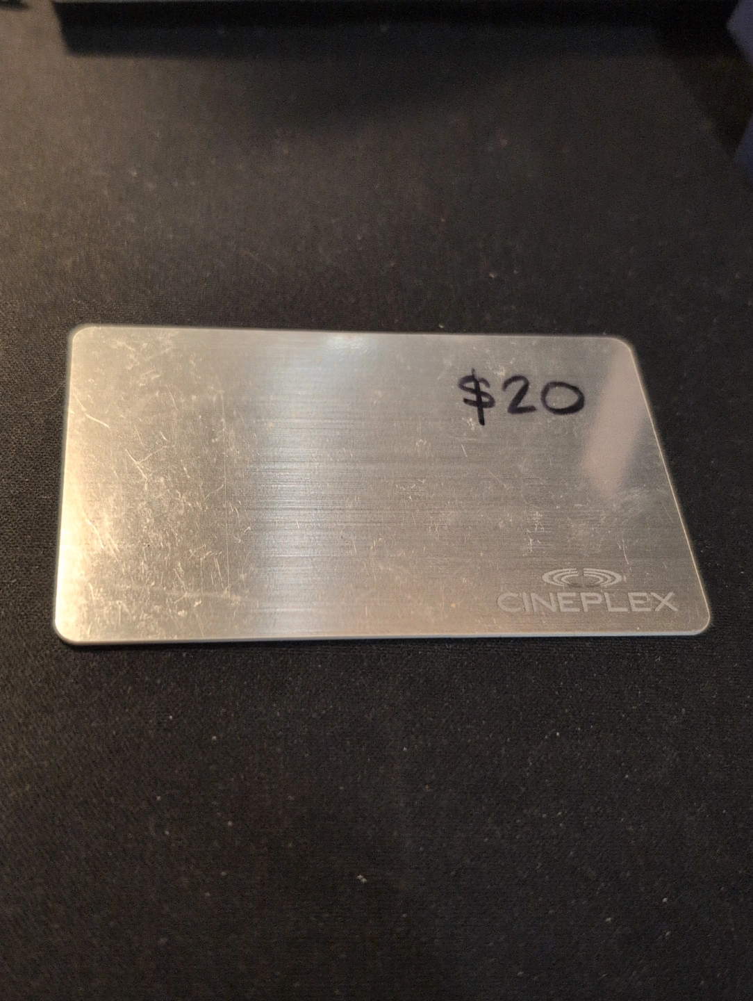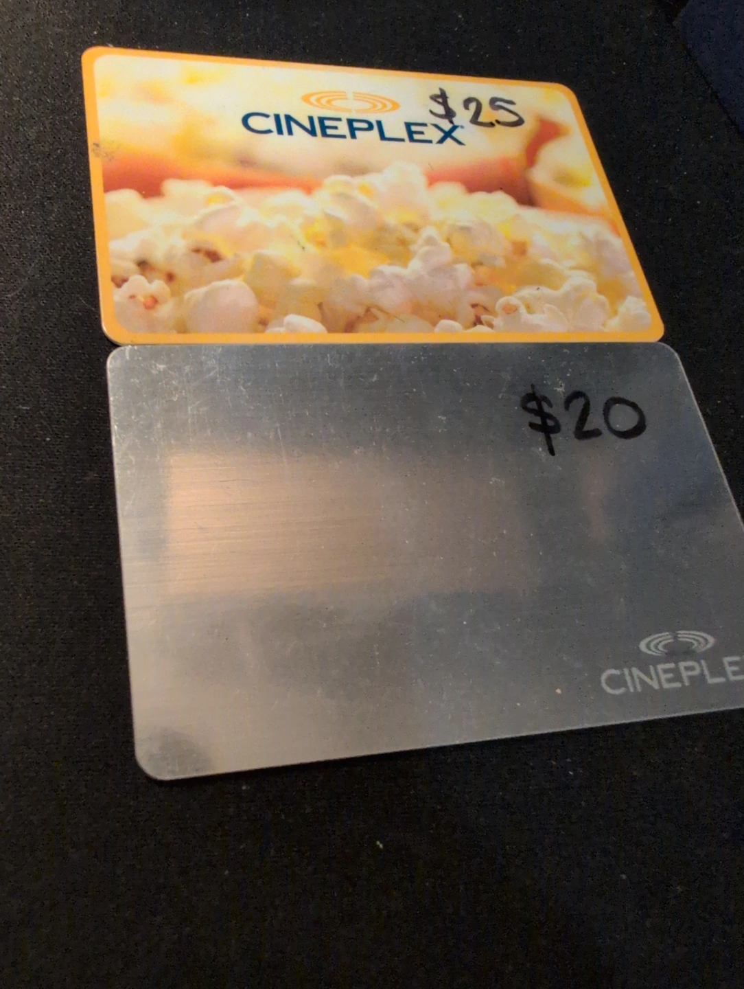 Two unused Cineplex gift cards. One is a brushed metal card with a $20 value. The other is a plastic card featuring a popcorn image with a $25 value. Scratches and minor wear visible.