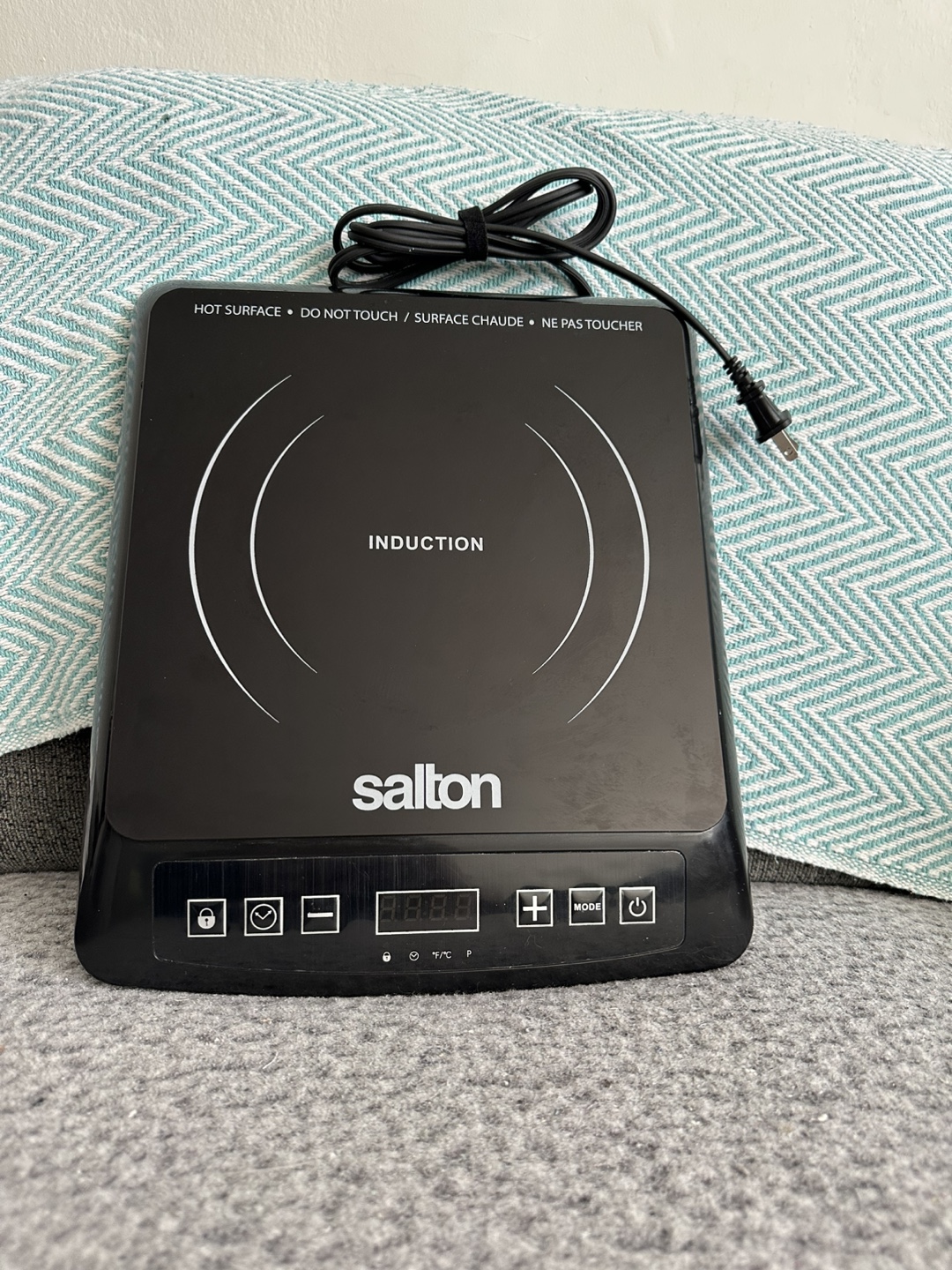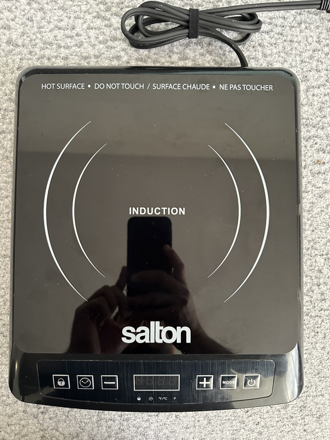 Single burner induction cooktop. Black colour. Features digital controls, timer function, temperature settings in Celsius and Fahrenheit. Power cord included.