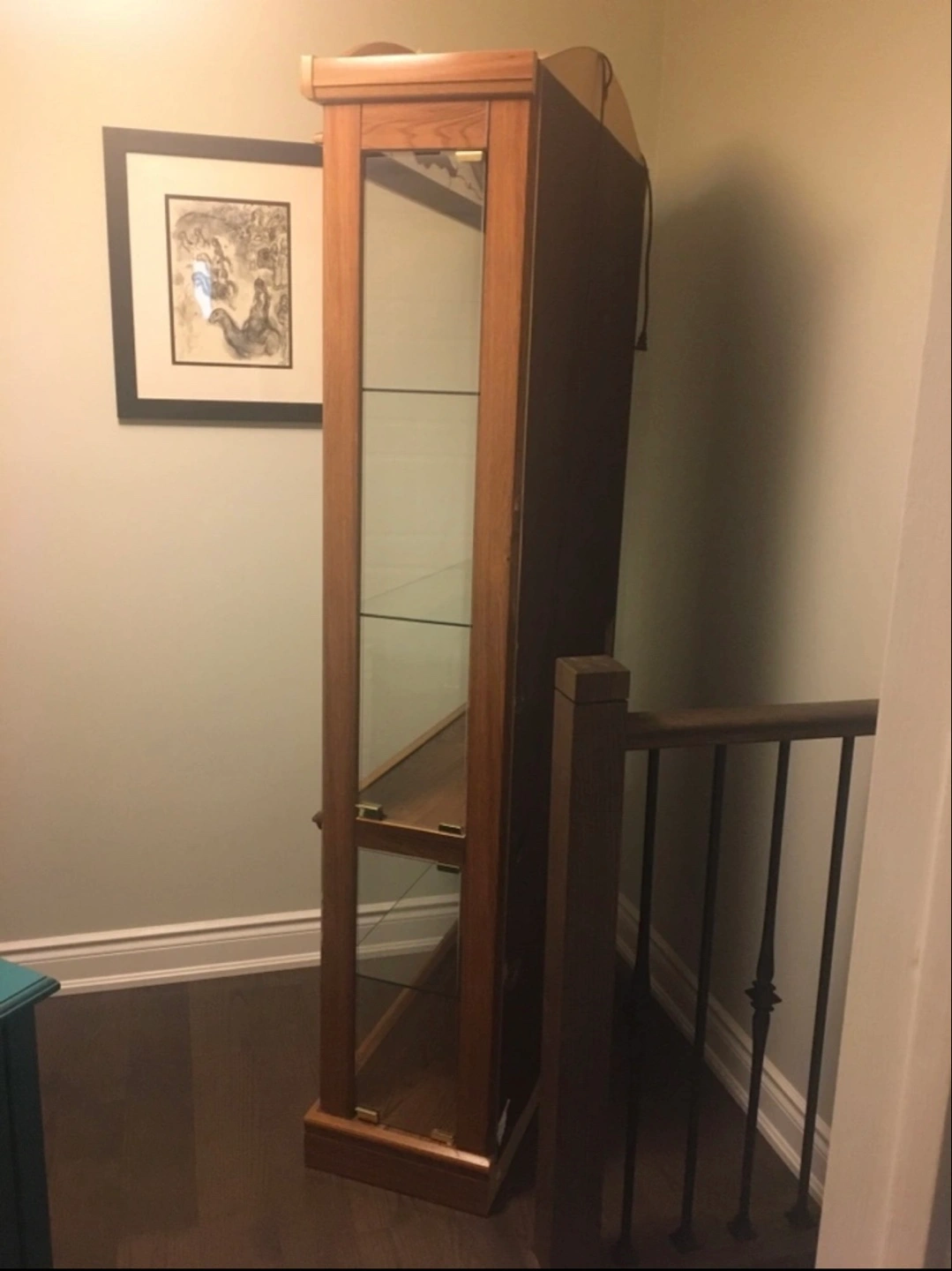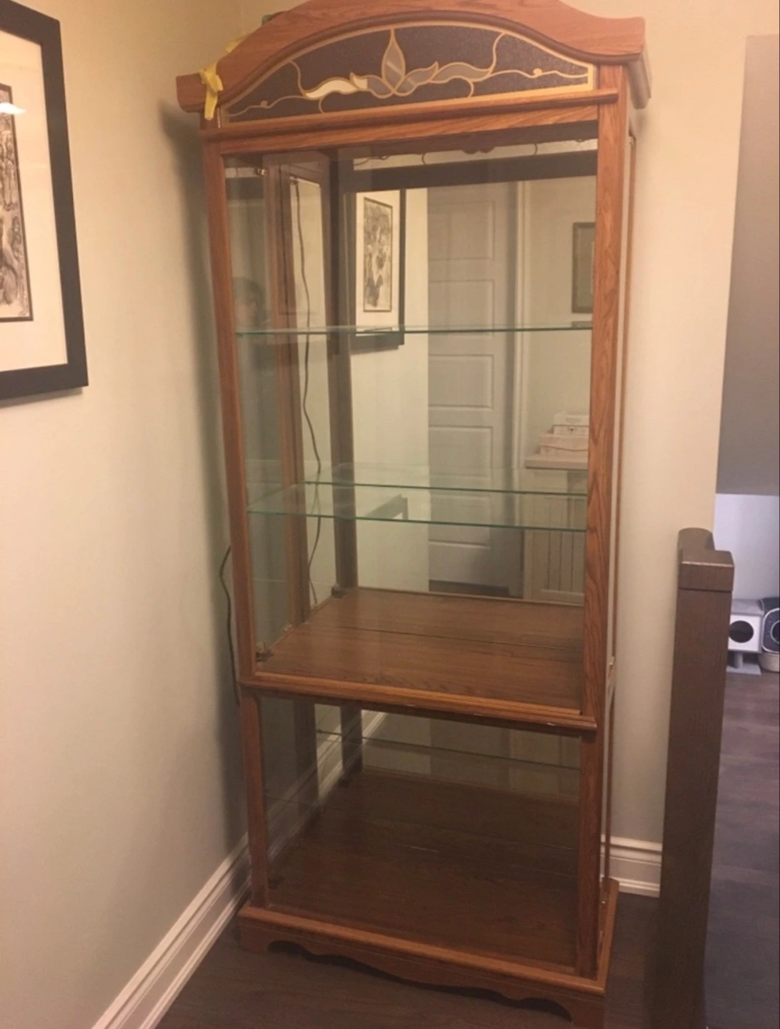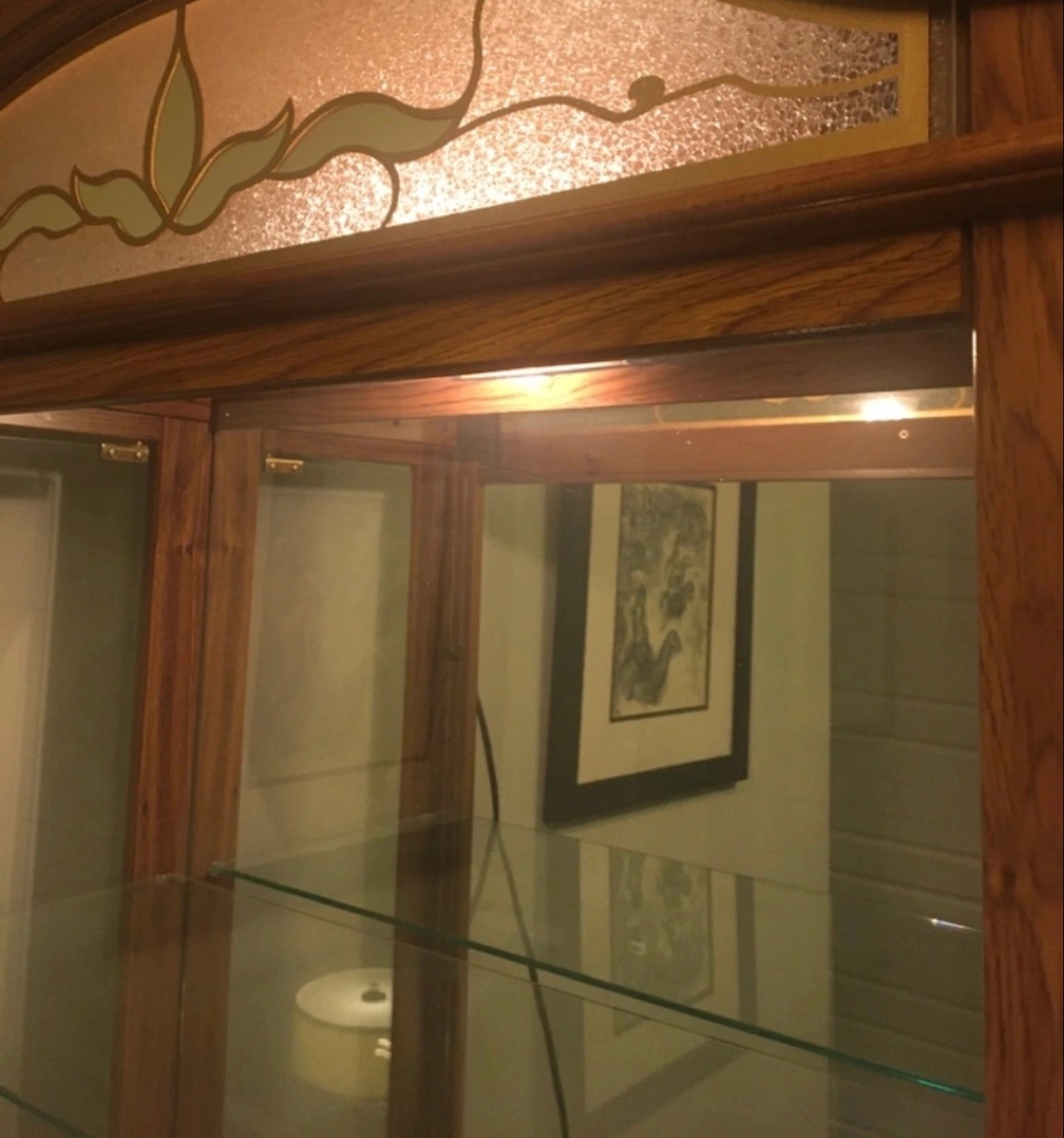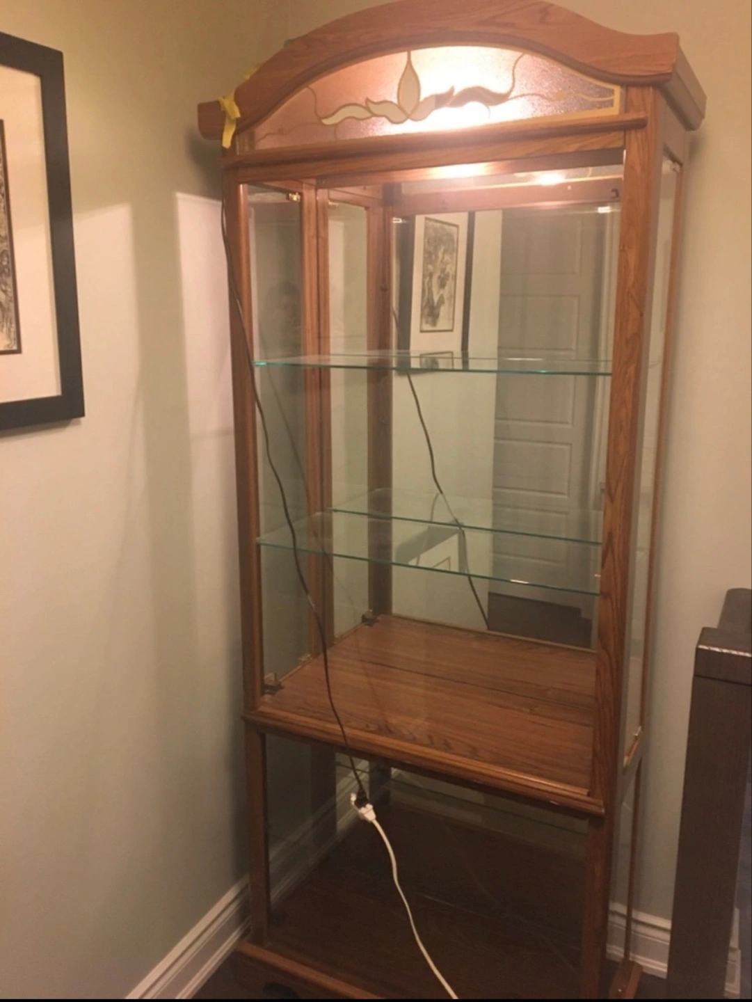 Wooden curio cabinet. Features glass shelves, glass doors, and an interior light. Beautiful arched top with decorative glass. Solid wood construction. Great for displaying collectibles.