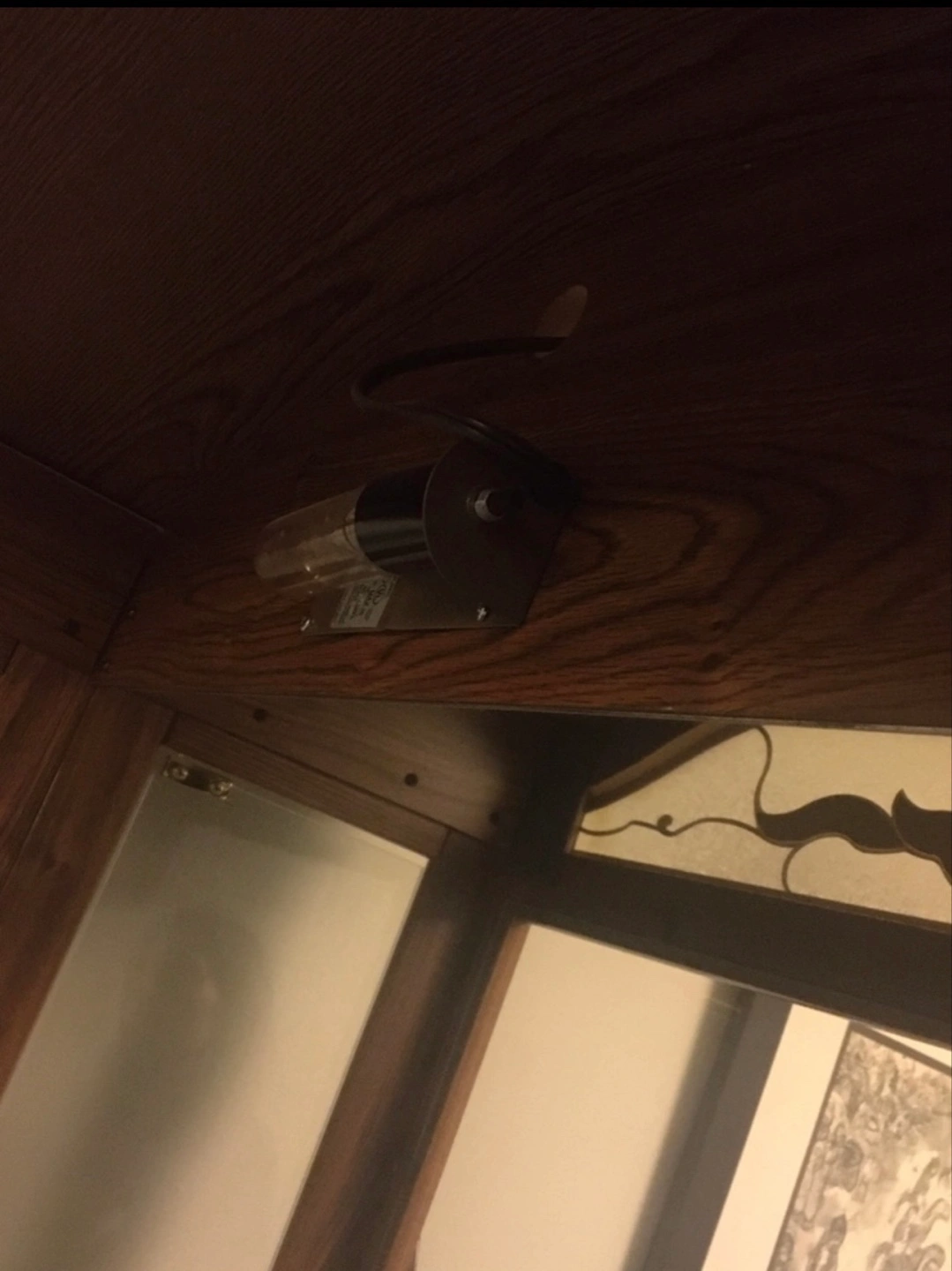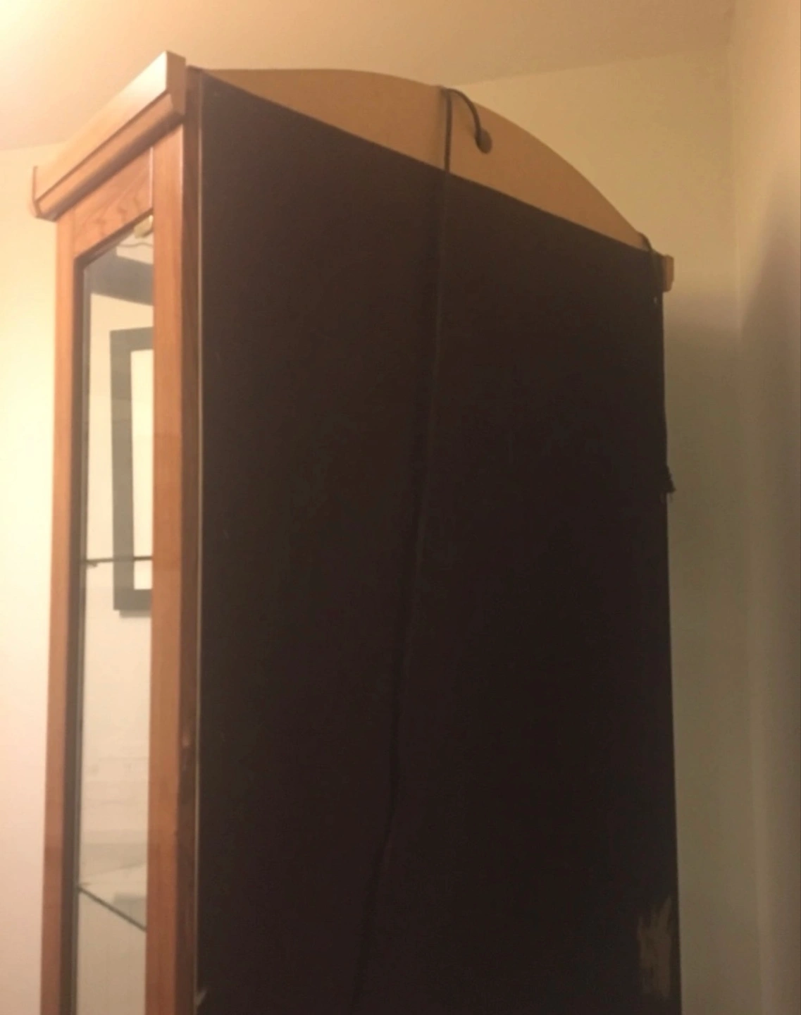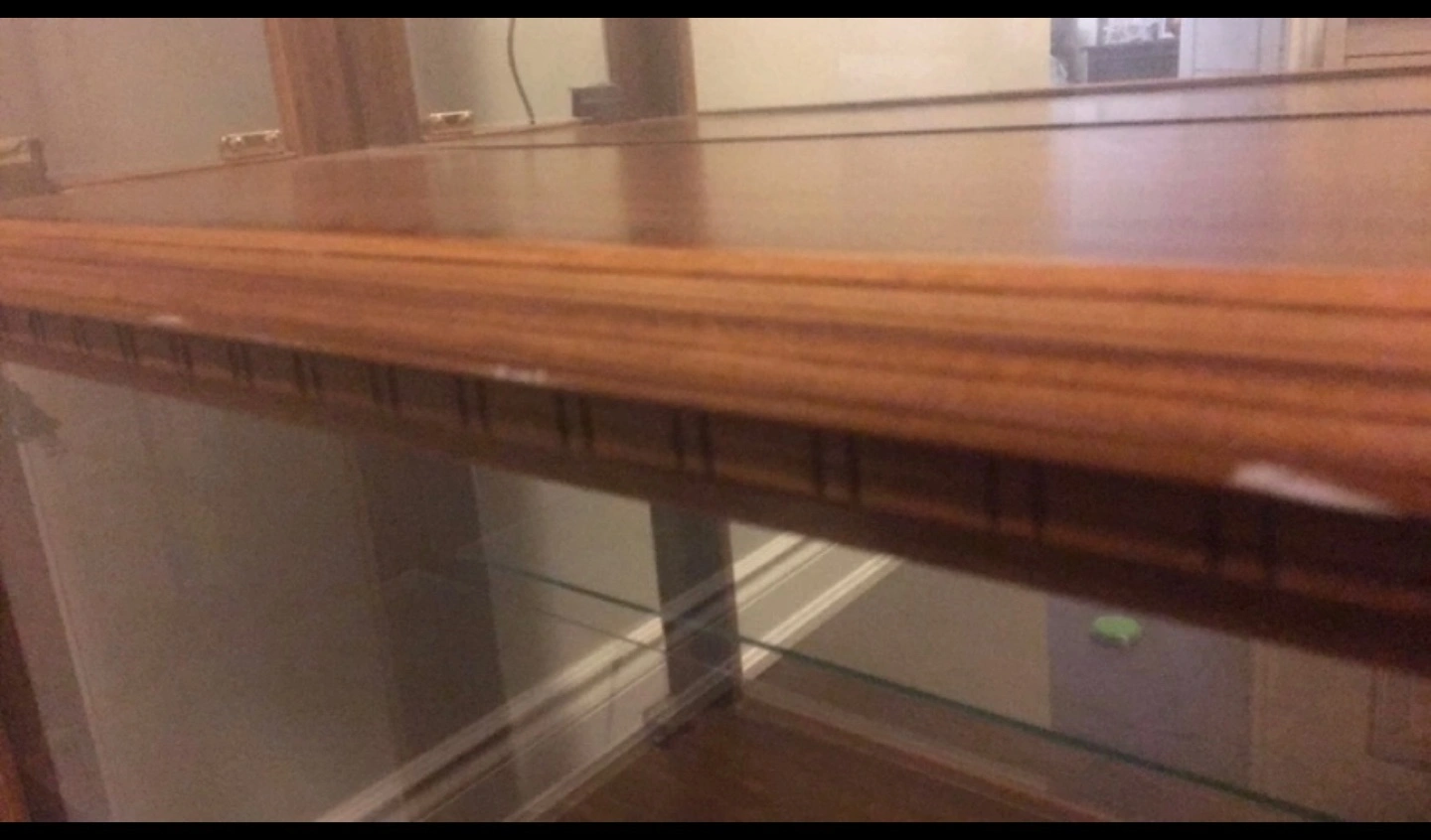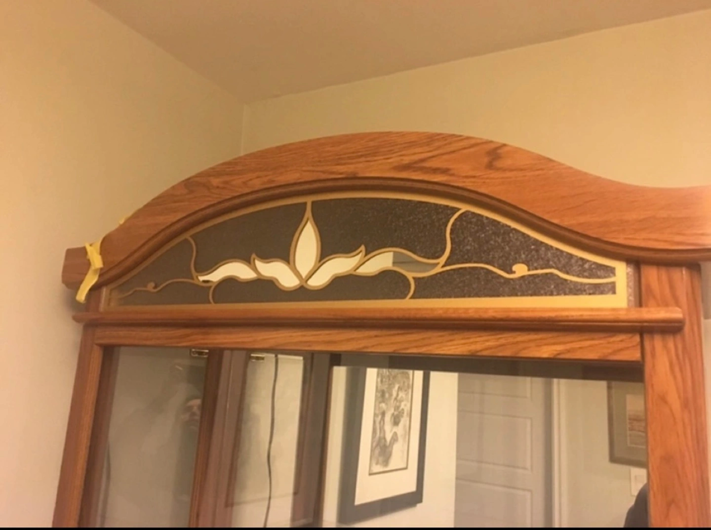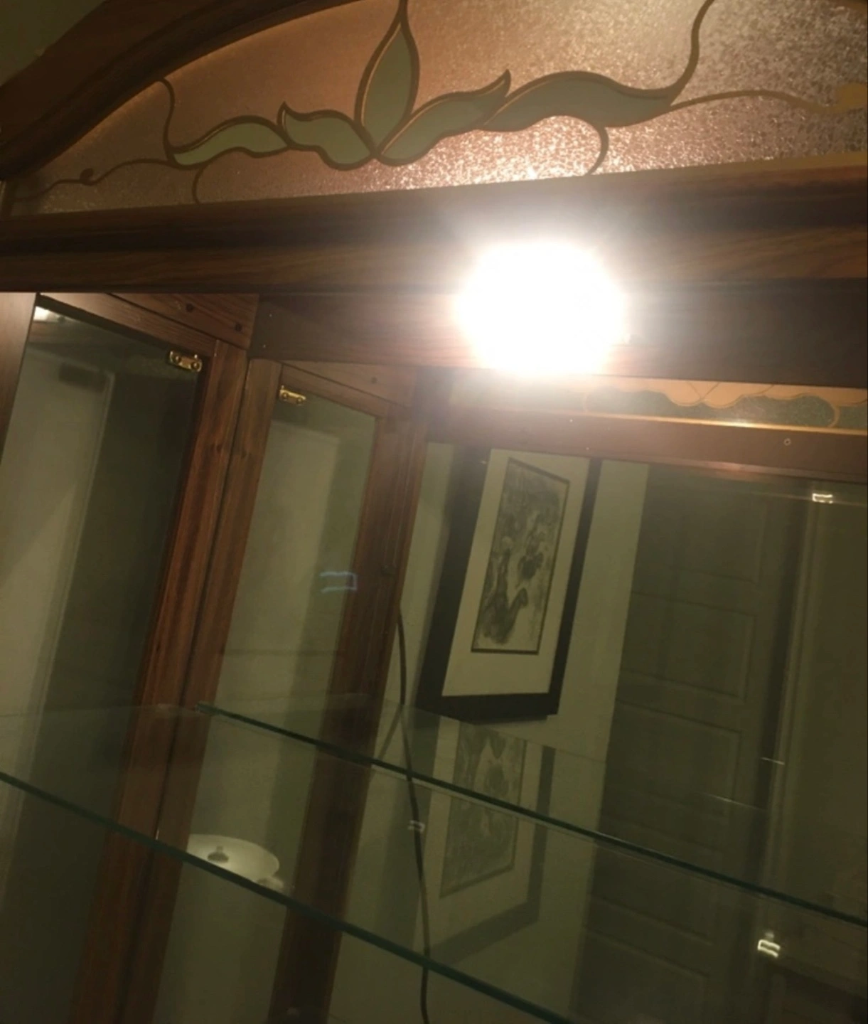 Wooden curio cabinet. Features glass shelves, glass doors, and an interior light. Beautiful arched top with decorative glass. Solid wood construction. Great for displaying collectibles.