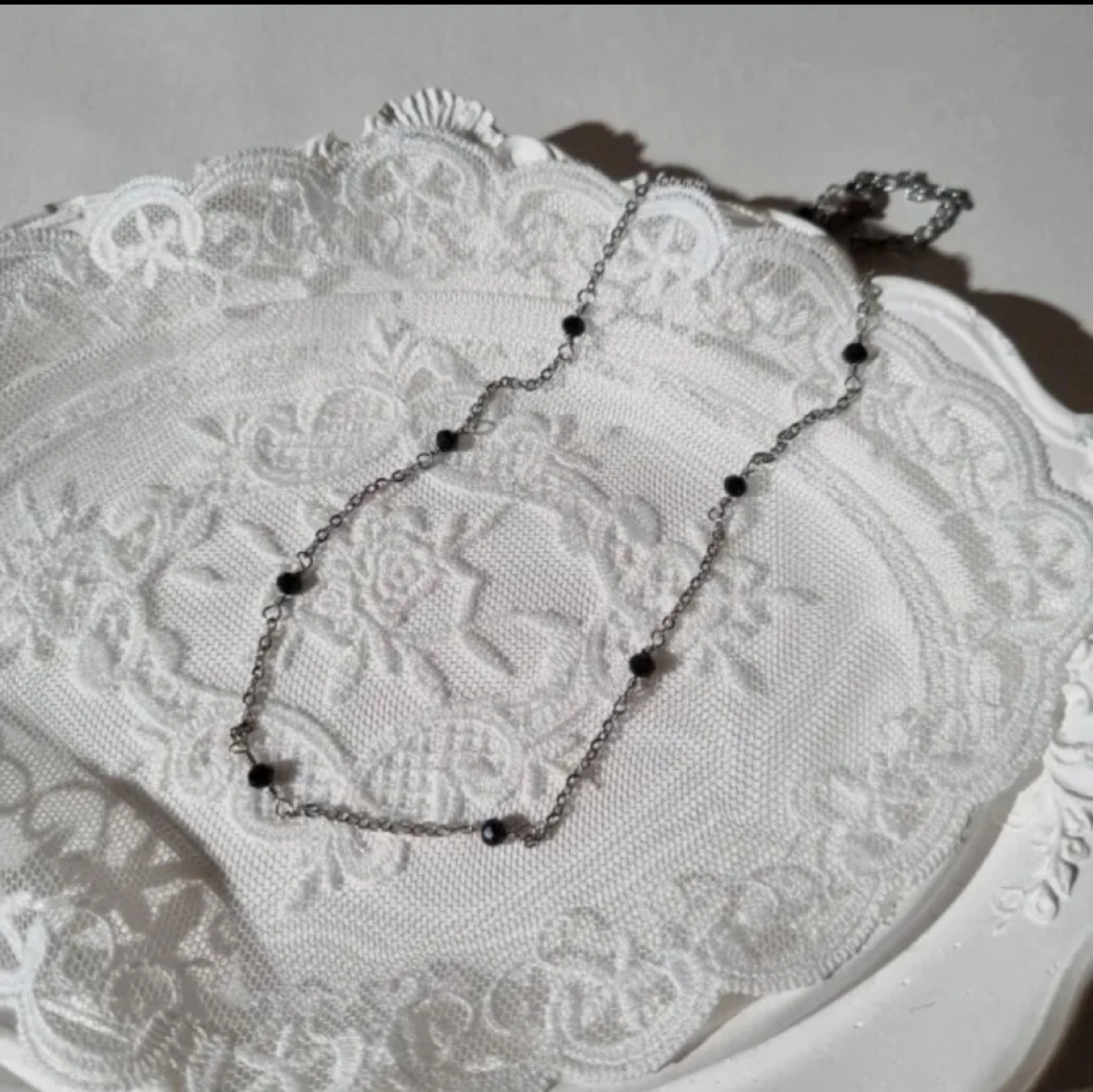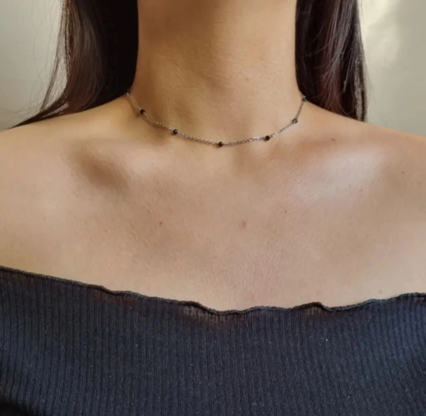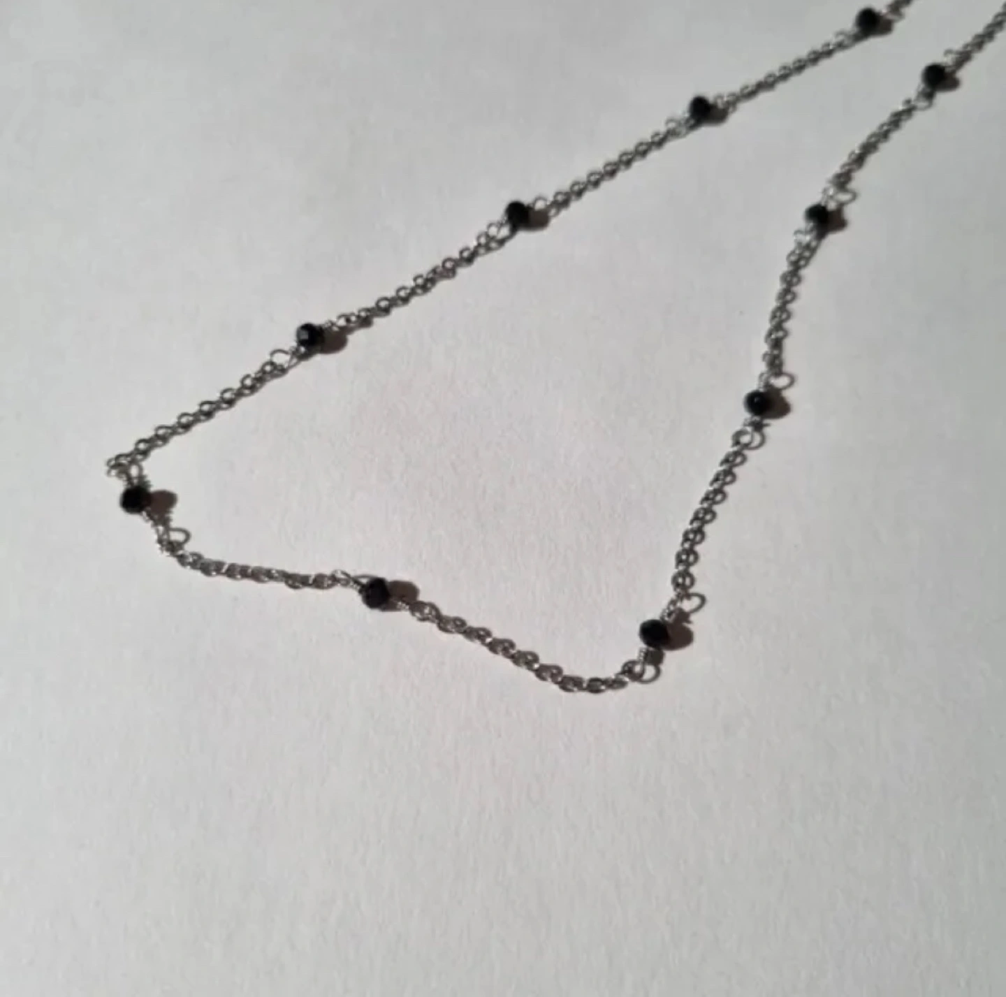 Silver chain choker necklace. Features small black beads. Minimalist style. Perfect for layering.