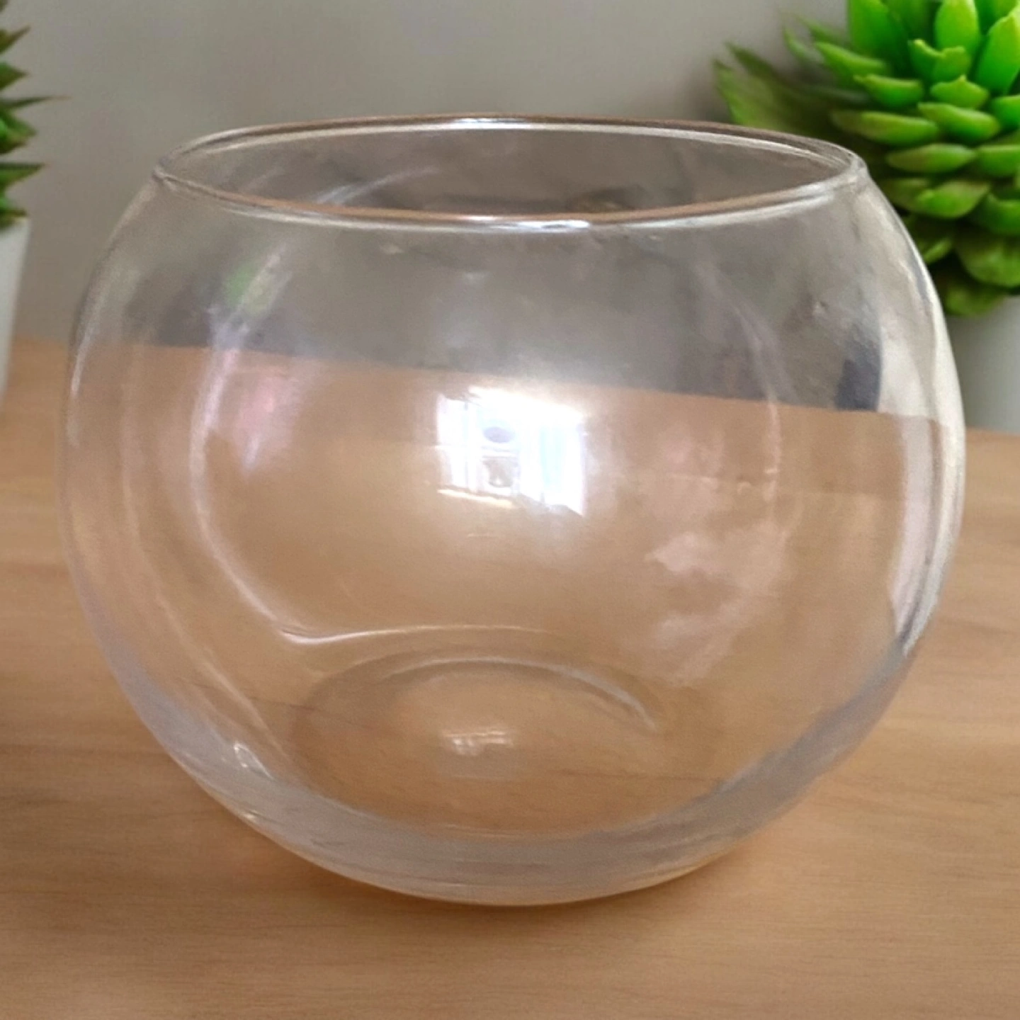 Small, round glass bowl. Perfect for candles or small plants. Clear glass with a slight curve.