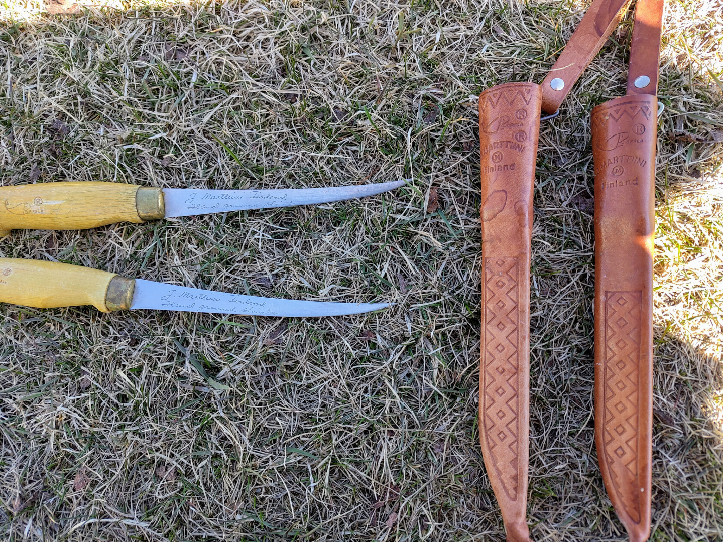 Two signed 1960s vintage Marttiini Finland knives. Hand-ground blades. Beautiful leather sheaths included. Great condition.