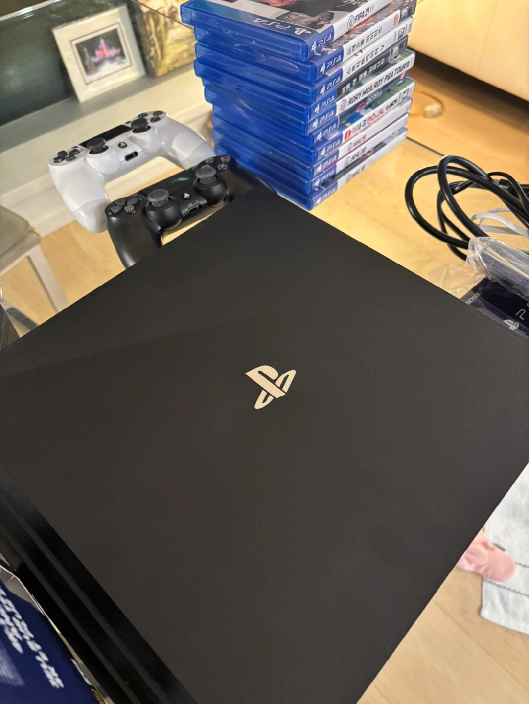 PlayStation 4 Pro 1TB console, two controllers (one white, one black).