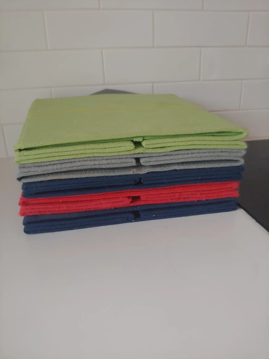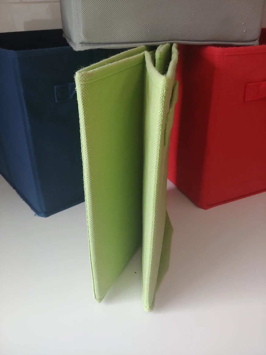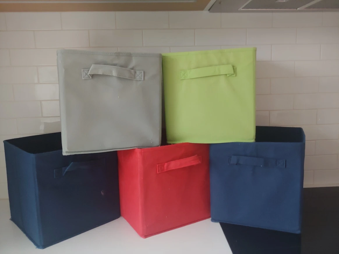 5 Fabric storage cubes. They fold for easy storage. Each cube has a base and a handles.