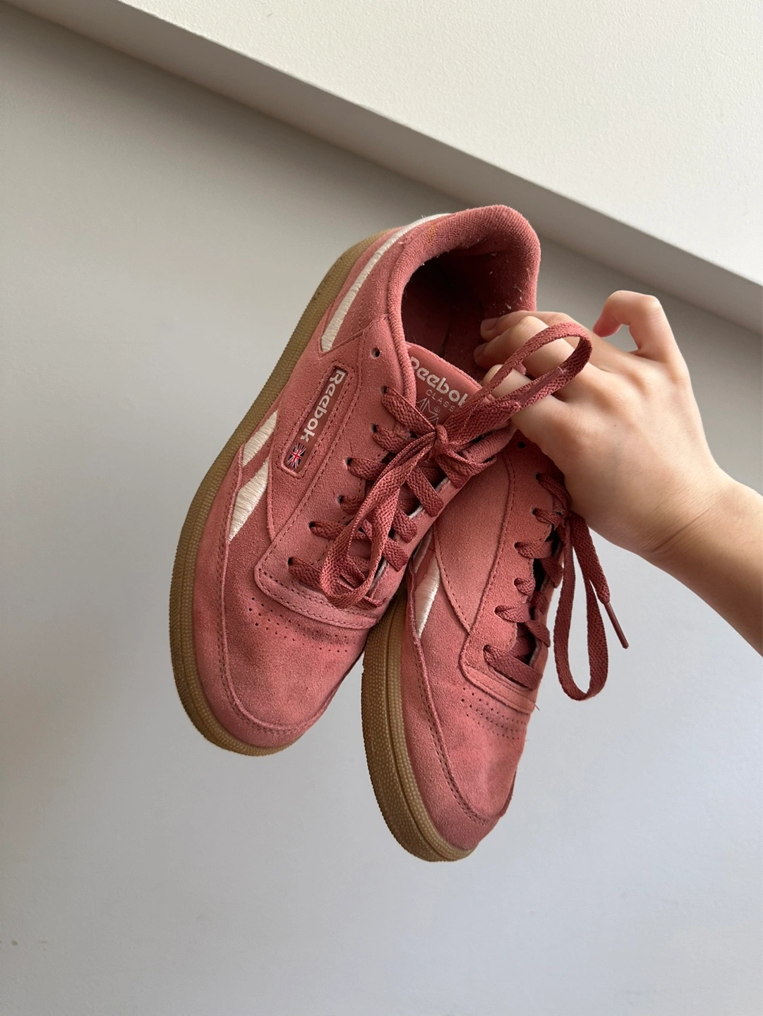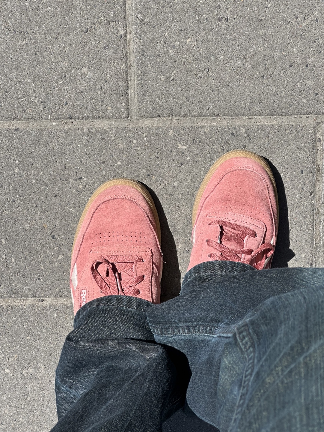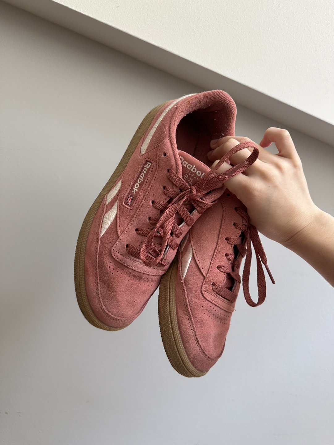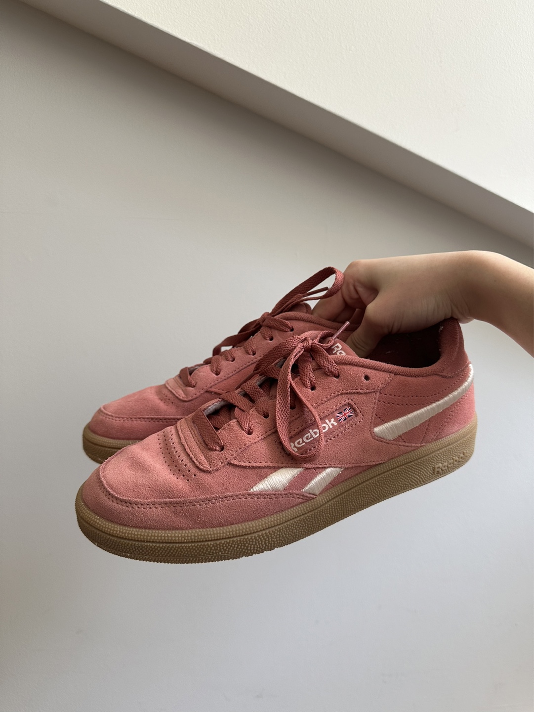 Dusty rose Reebok sneakers with gum sole. Good pop of colour for any outfit!