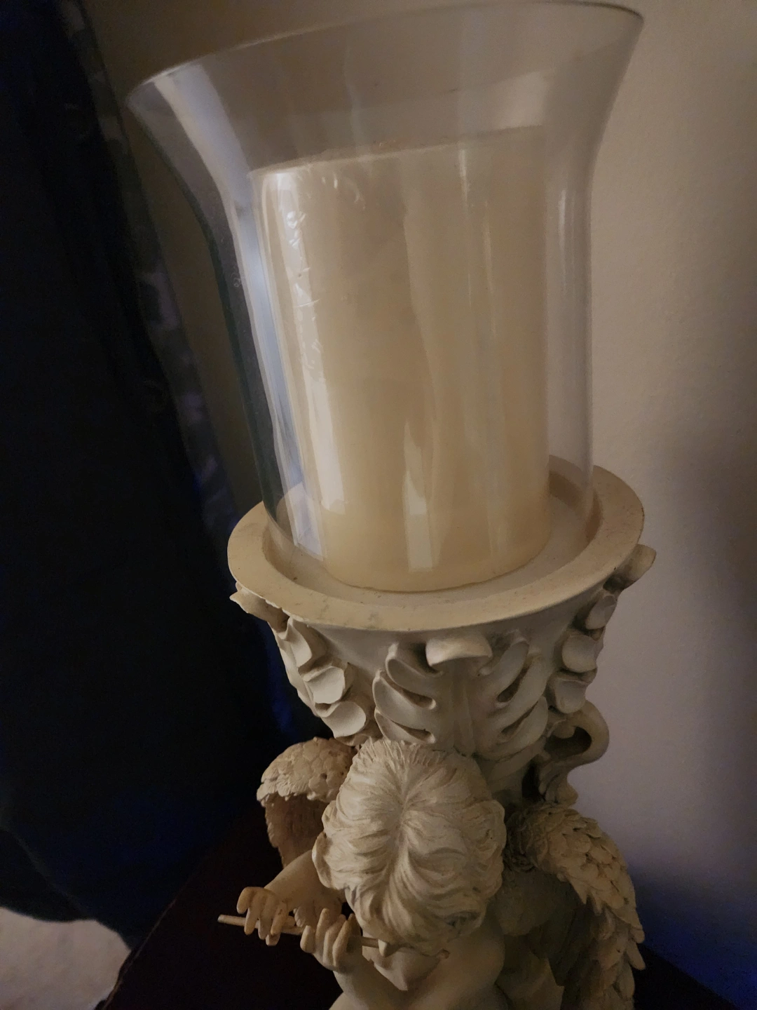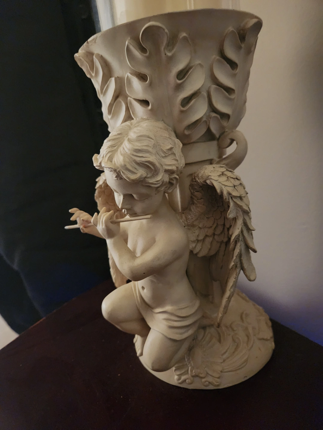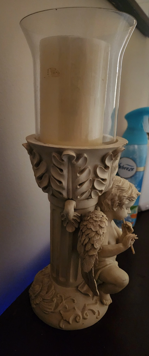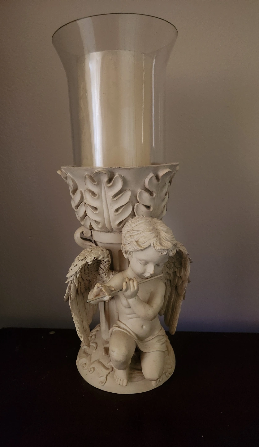 Ornate candle holder featuring a cherubic angel playing a flute. Glass hurricane shade included. Off-white/cream colour. Elegant design, perfect for home décor.