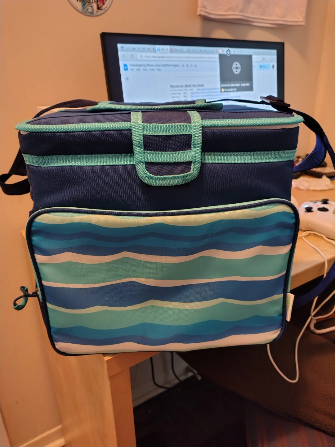 27Soft sided cooler bag. Features a removable liner. Blue and teal colour scheme. Wave pattern. Shoulder strap.