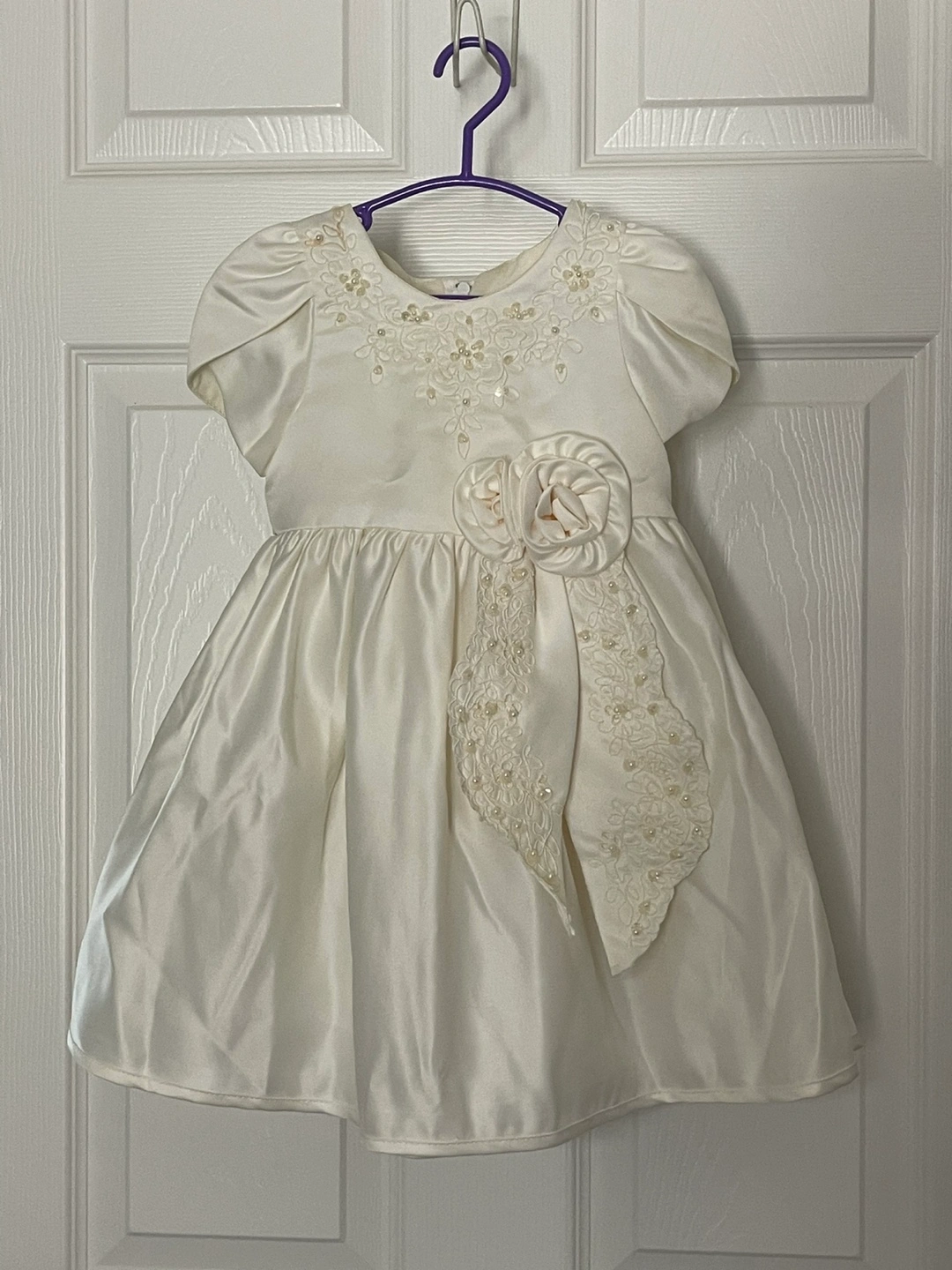 Beautiful off-white satin dress. Short sleeves, embroidered details, and a floral accent. Perfect for special occasions.