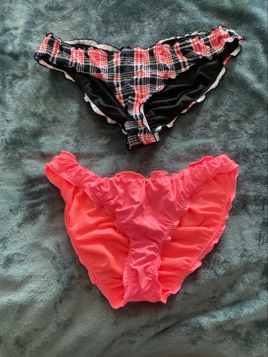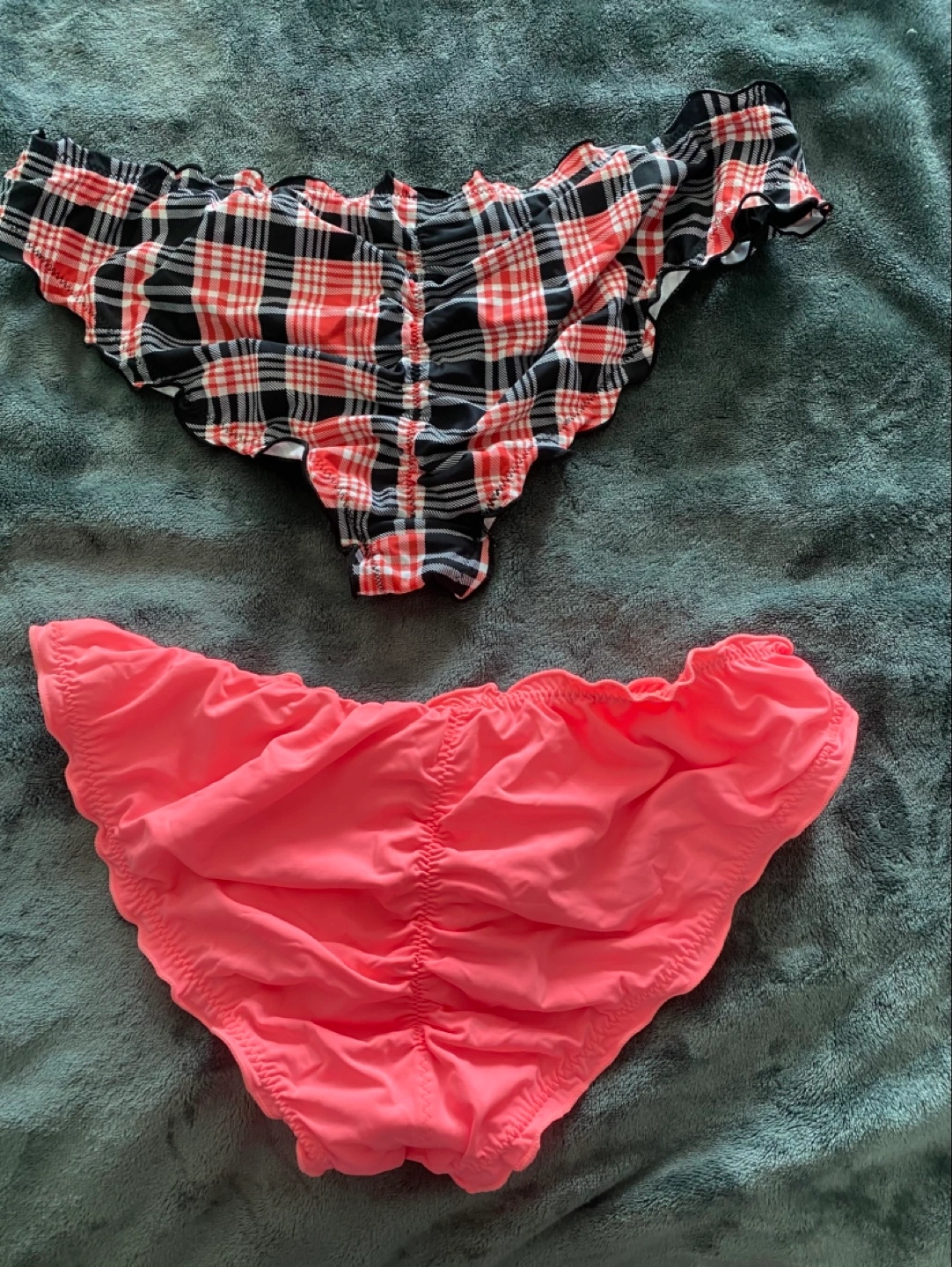 Never worn. One pair features a red and black plaid pattern with ruffles. The other pair is solid coral with ruffles. Both pairs have rouched back