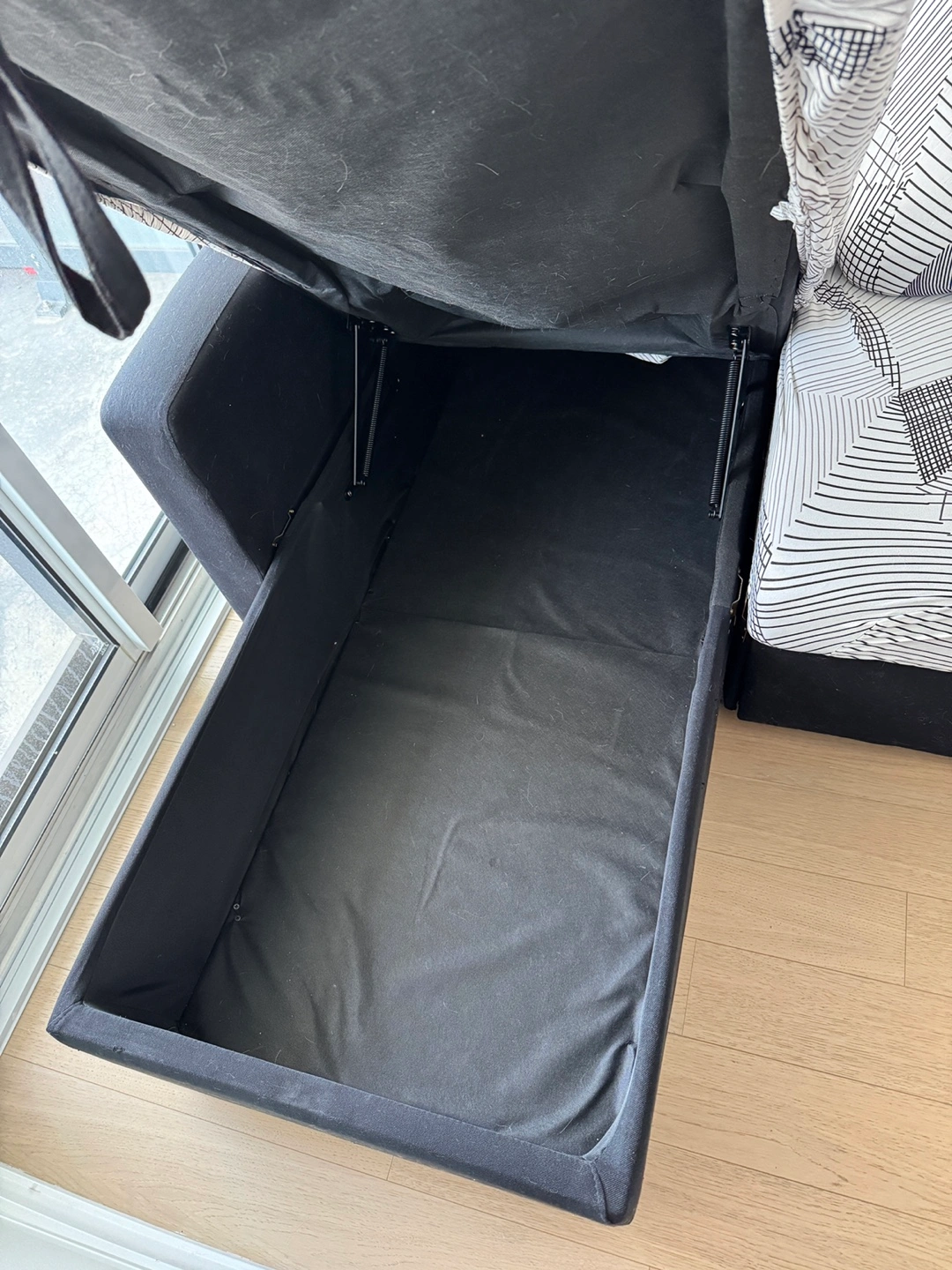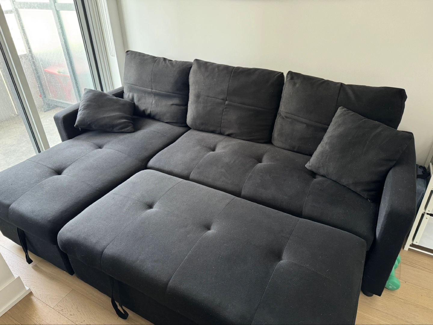 Comfortable and stylish black L-shaped sectional sofa-bed. While it shows normal wear and tear from a year of use, it’s an ideal fit for smaller places. We’ve recently upgraded to a larger couch, so it's time for this one to find a new home. It also has a large storage space.
