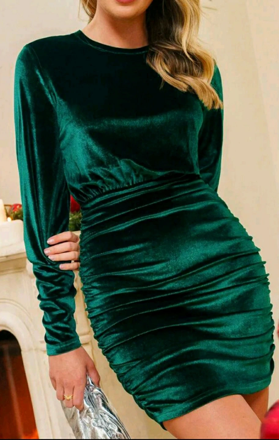 Stunning emerald green velvet dress. Features long sleeves and a fitted silhouette. Ruched detailing at the waist.