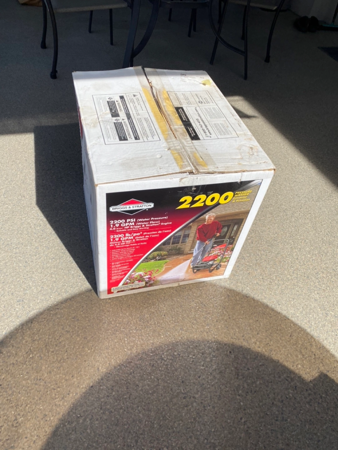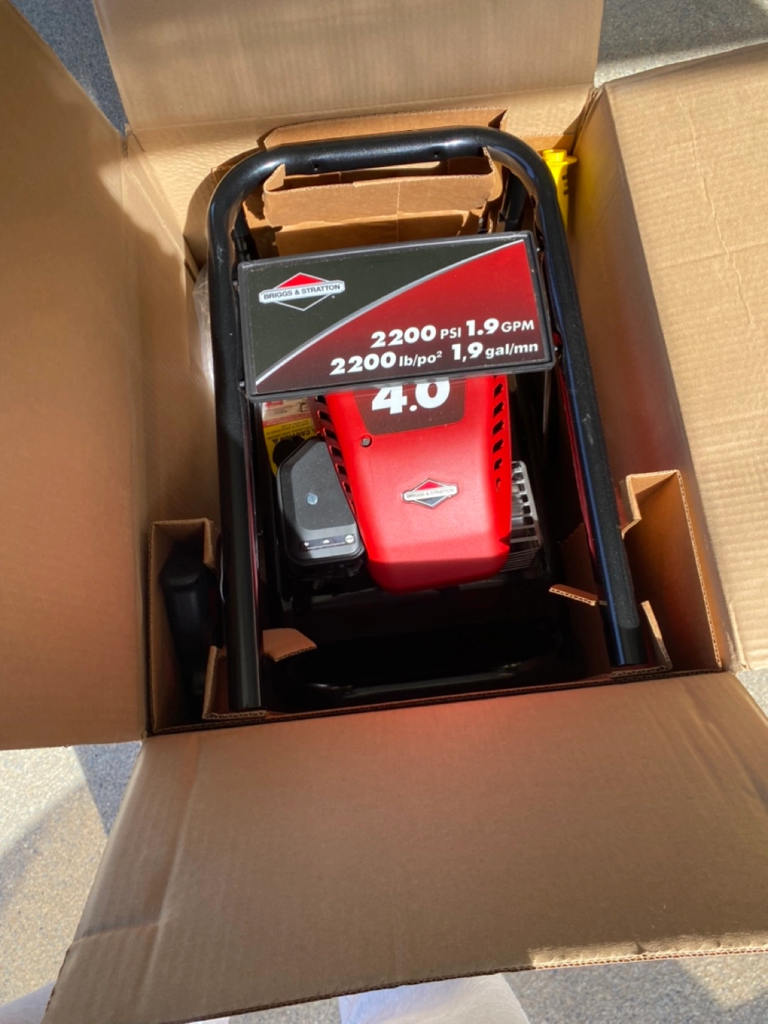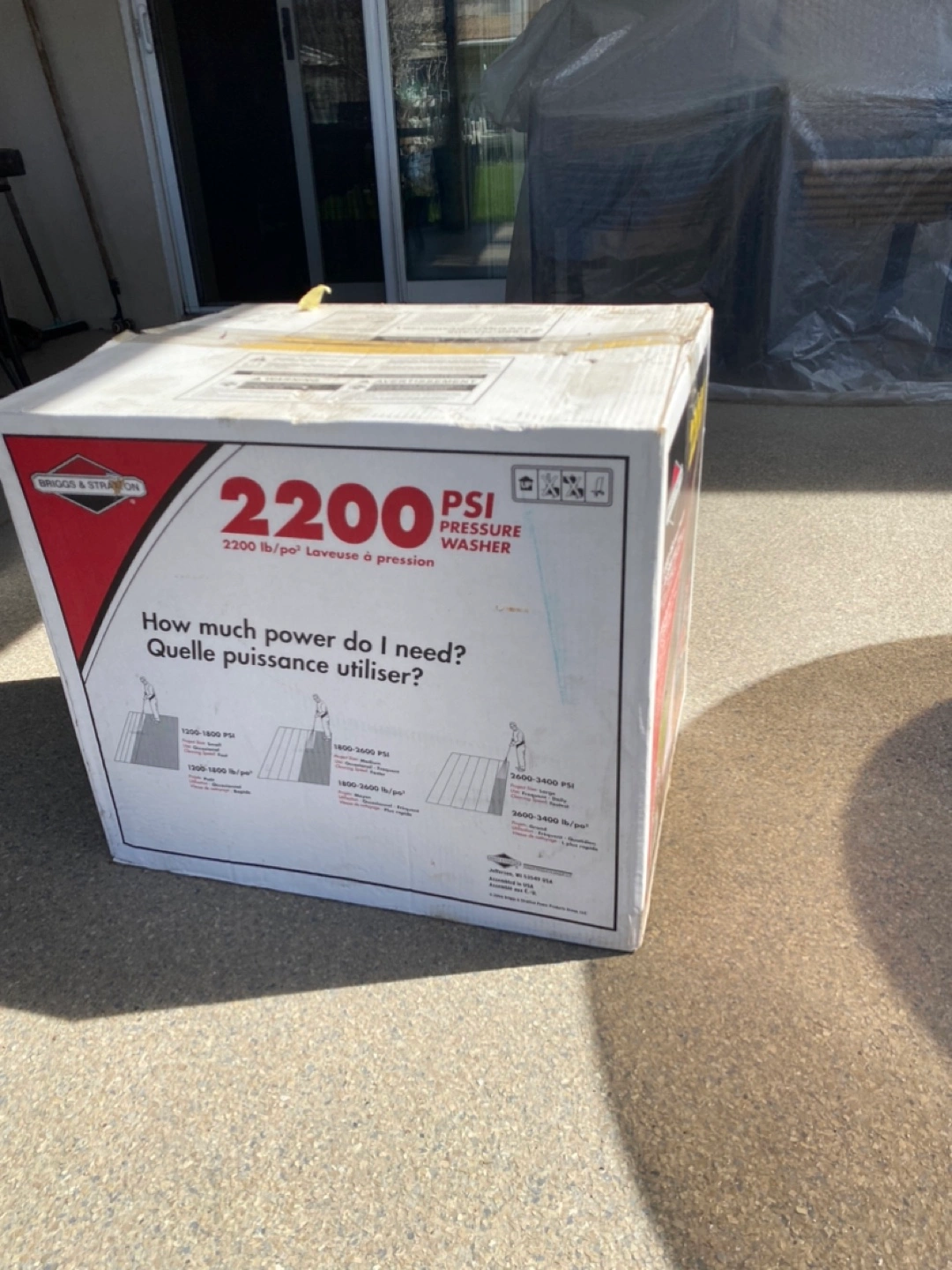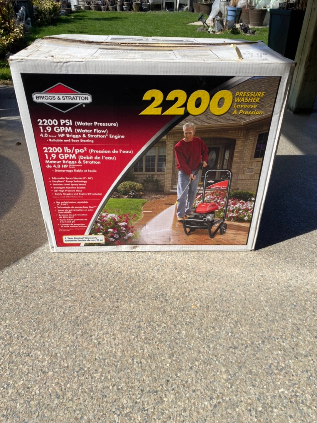 60Brand new in box. 4.0 HP Briggs & Stratton engine. 2200 PSI, 1.9 GPM. Includes pressure washer, never been used. 416-830-6400