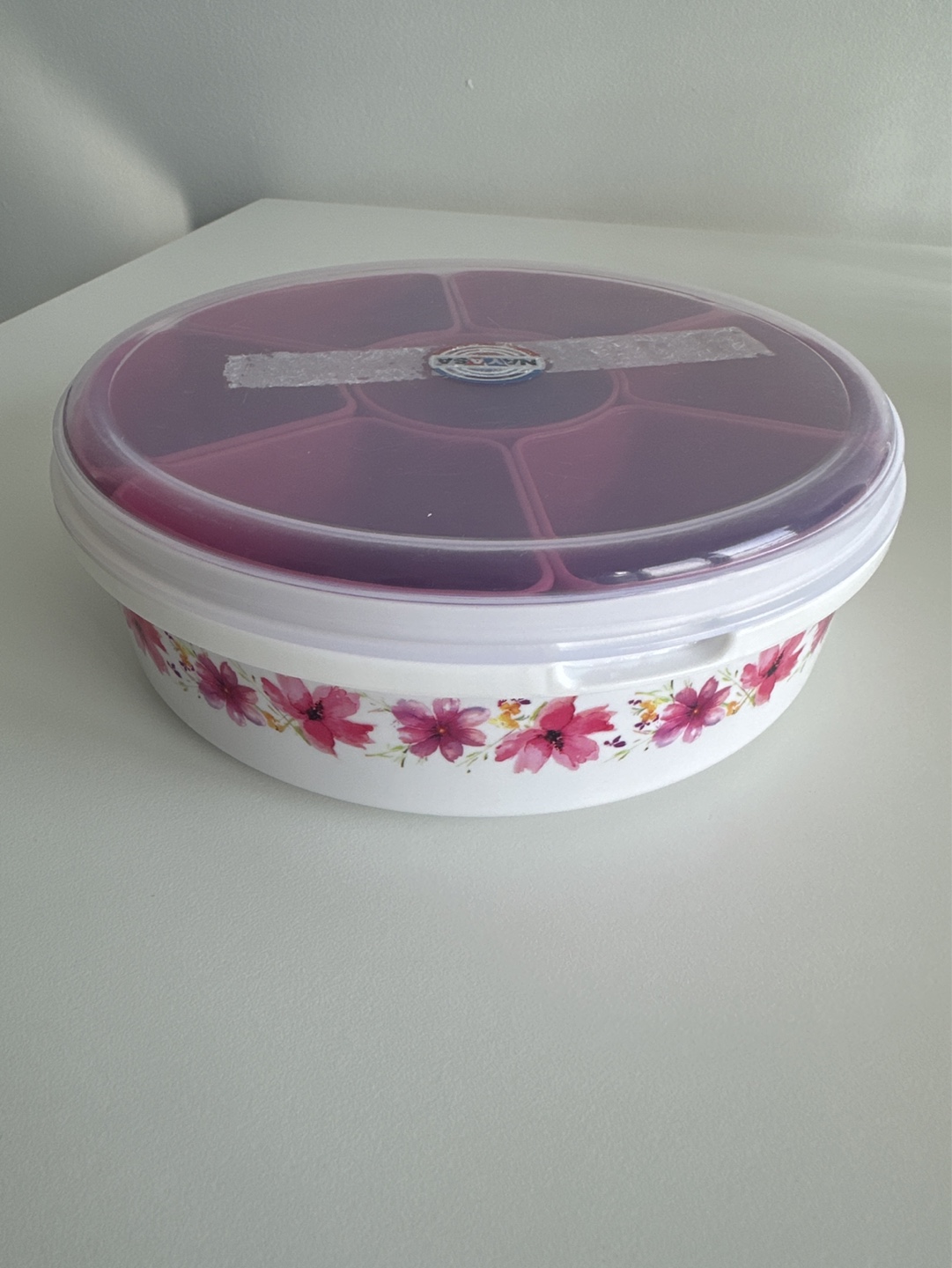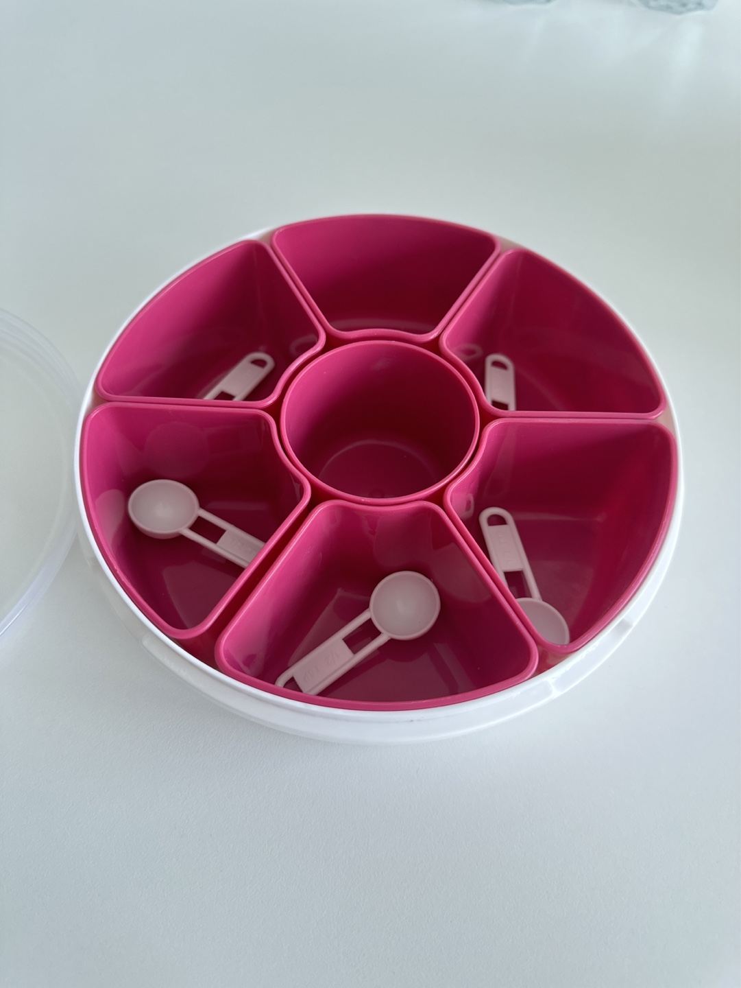 Never used spice container. Seven individual compartments. Includes small spoons. Great for organizing spices, tea, or other small items.