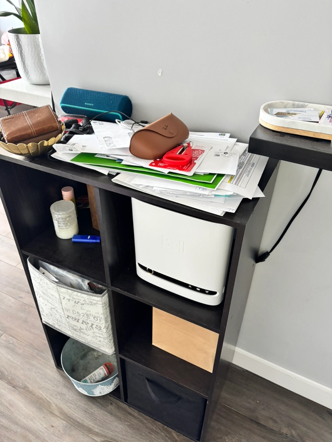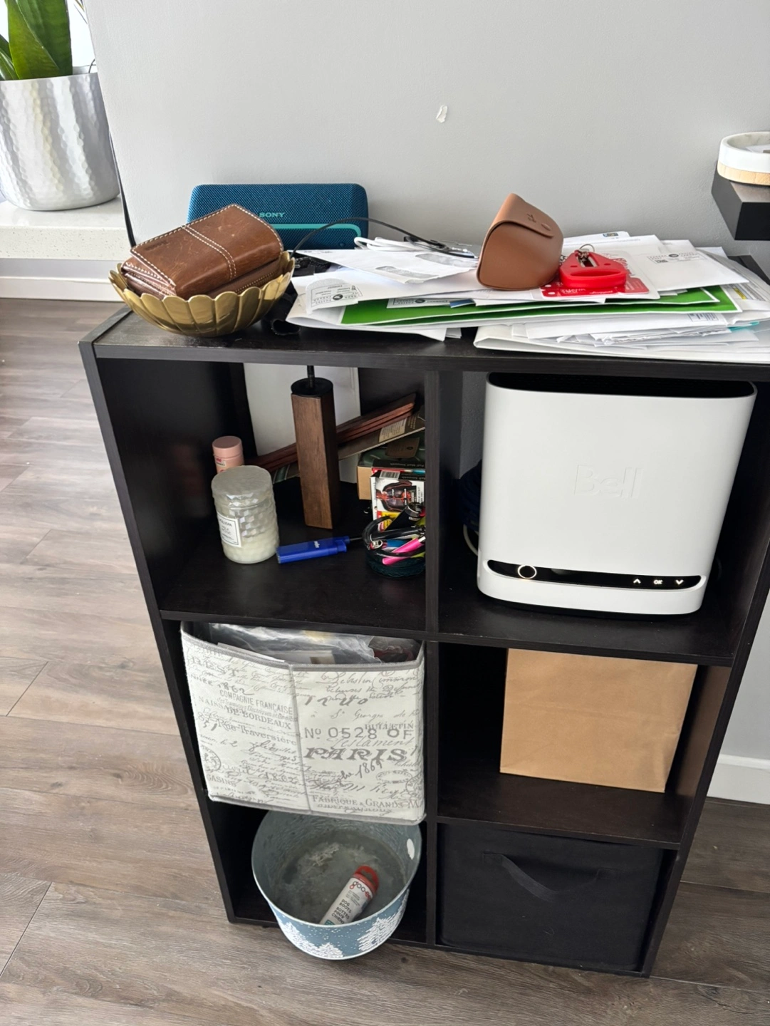 Functional storage unit. Six-cube design. Dark brown finish. Measures approximately 87 cm high, 33 cm wide, and 60 cm deep. Measurements in the photos. Excellent condition. Cash and pick up only.