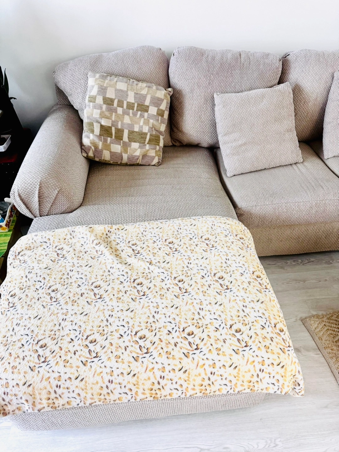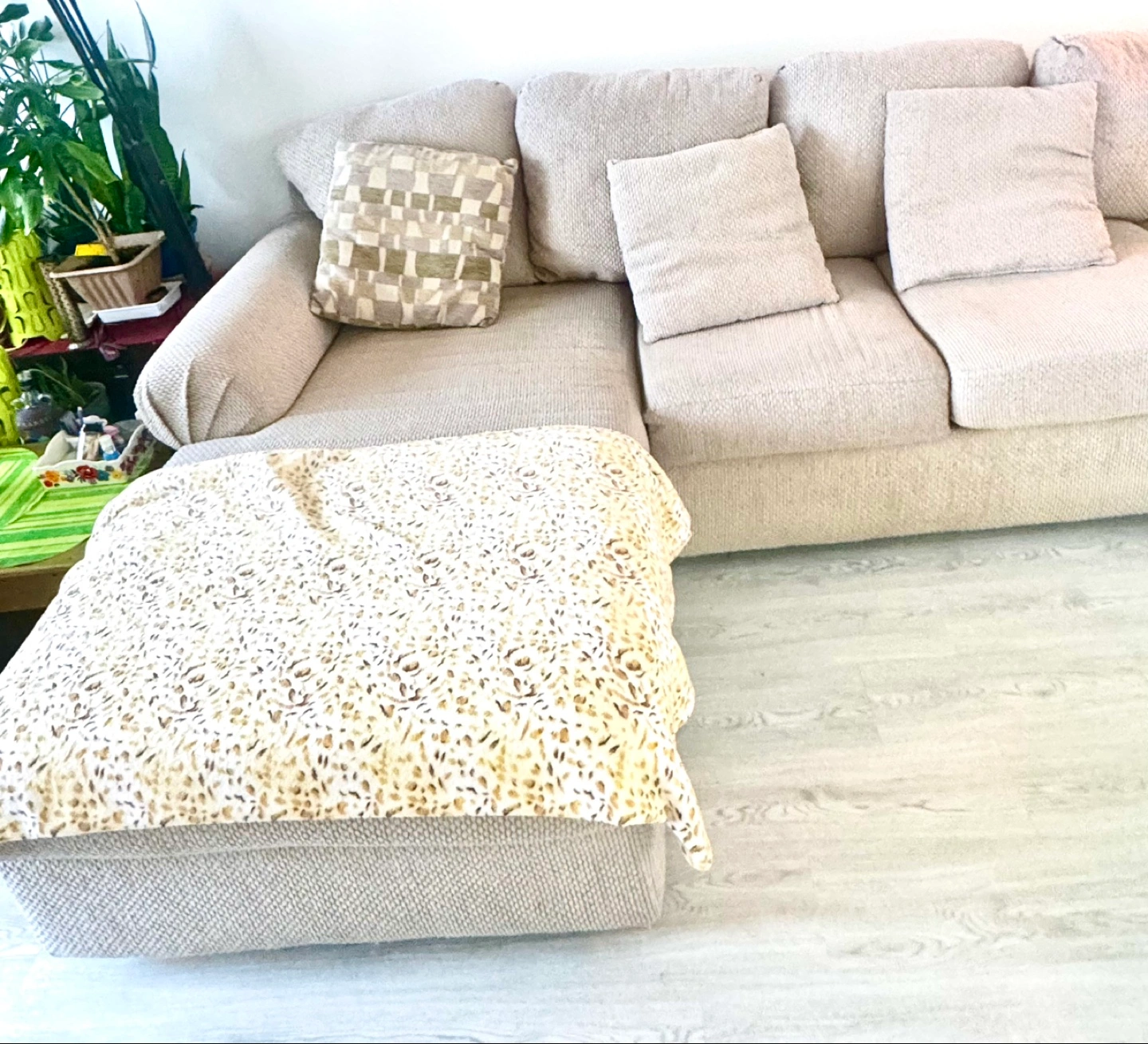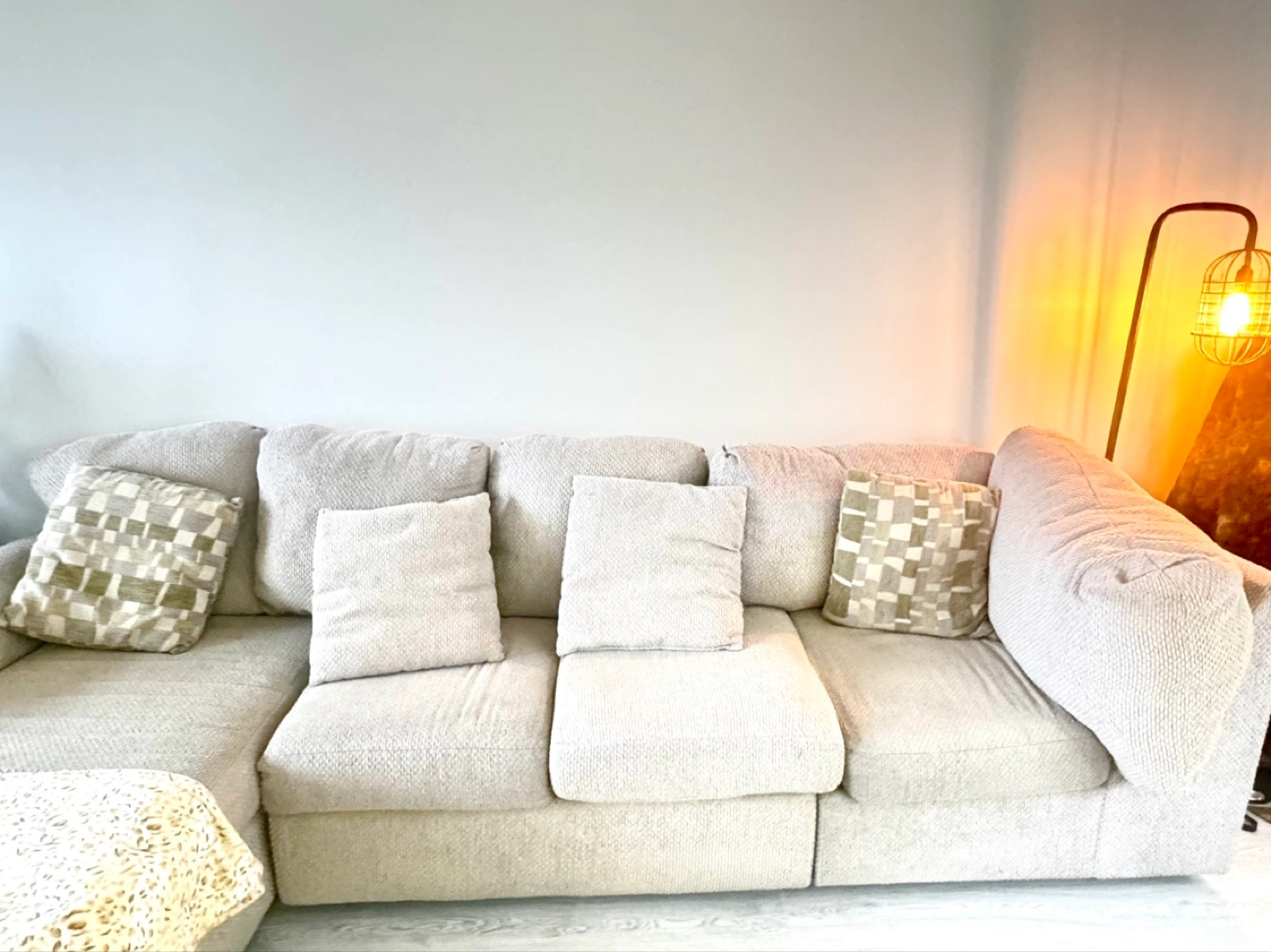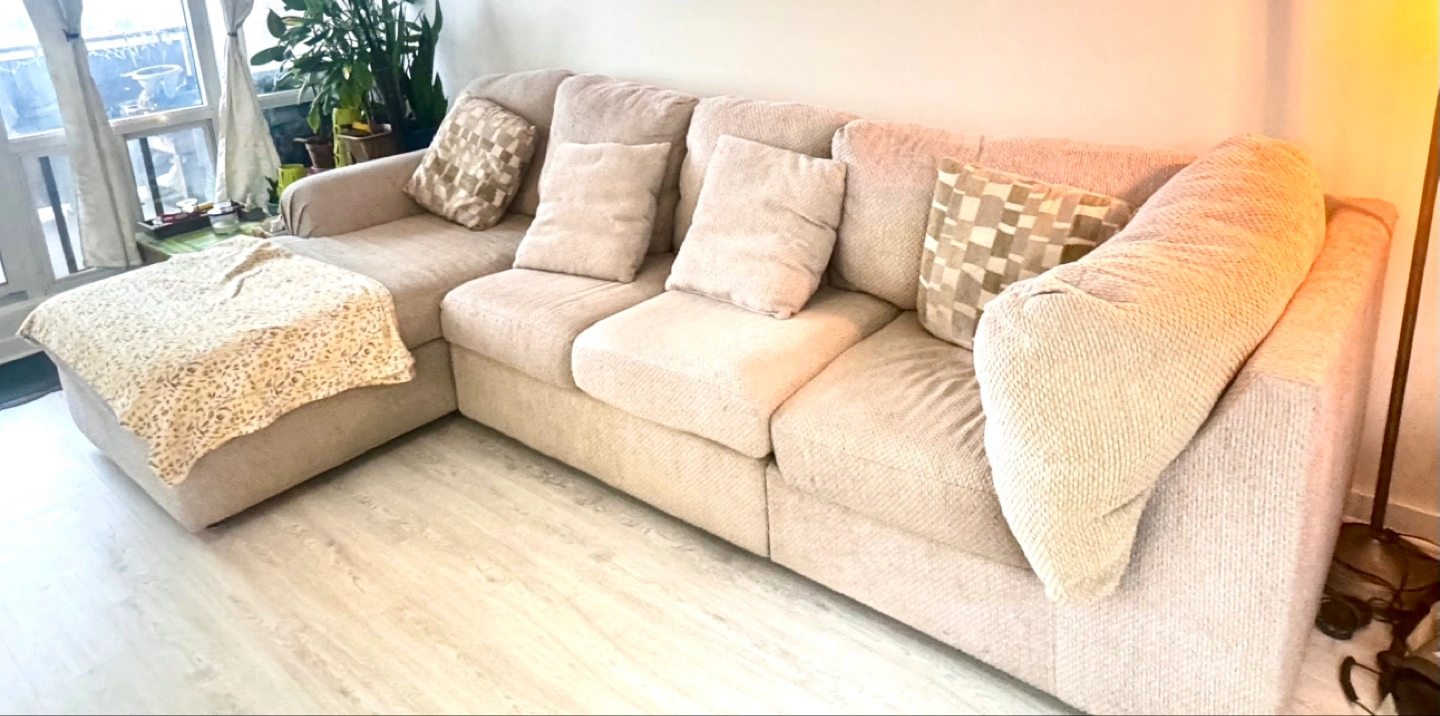 Leon Further- Comfortable beige sectional sofa. Includes chaise lounge. Four included throw pillows. Fabric upholstery. Good used condition.