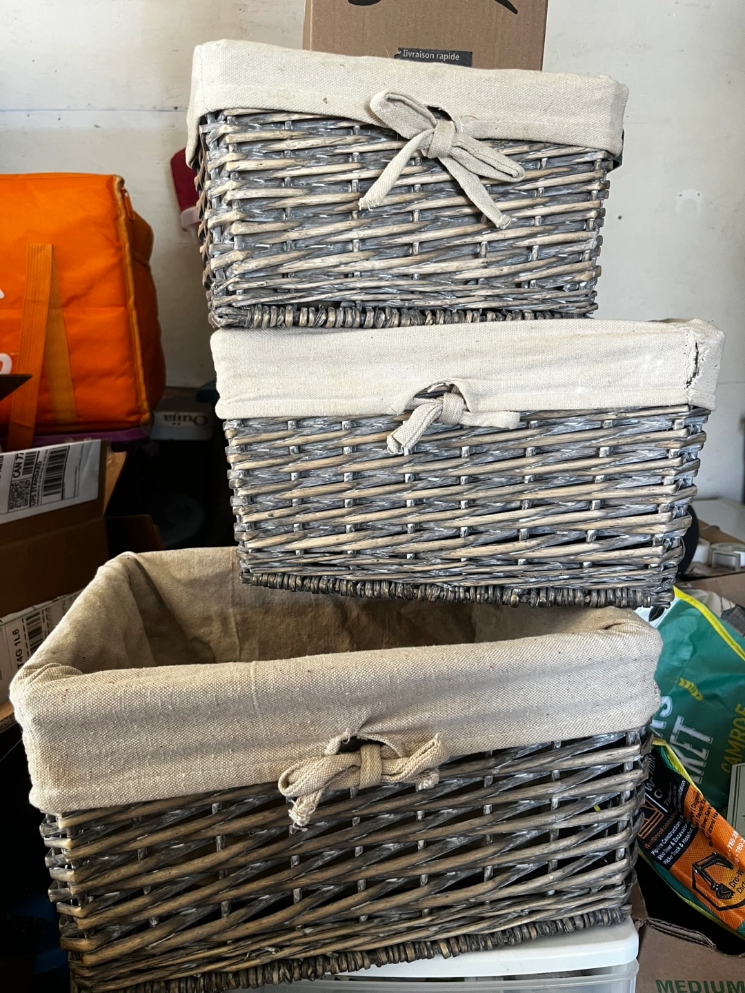 Buy & SellSet of 3 Wicker Storage Baskets with Linen LinersSet of 3 Wicker Storage Baskets with Linen Liners$10Three grey wash wicker baskets. Each features a removable, washable beige linen liner with a fabric tie. 14x9.5x8” 12x8.5x7” 10x7x6”ConditionGoodWHERE TO MEETInnisfailView MapSELLERverifiedStephInnisfail893 reviews0 chats·0 favorites·4 viewsSEND CHAT TO SELLERHi Steph! I’m interested in your listing.Hi Steph! I’m interested in your listing.Get the Karrot app to chatSign In to chat