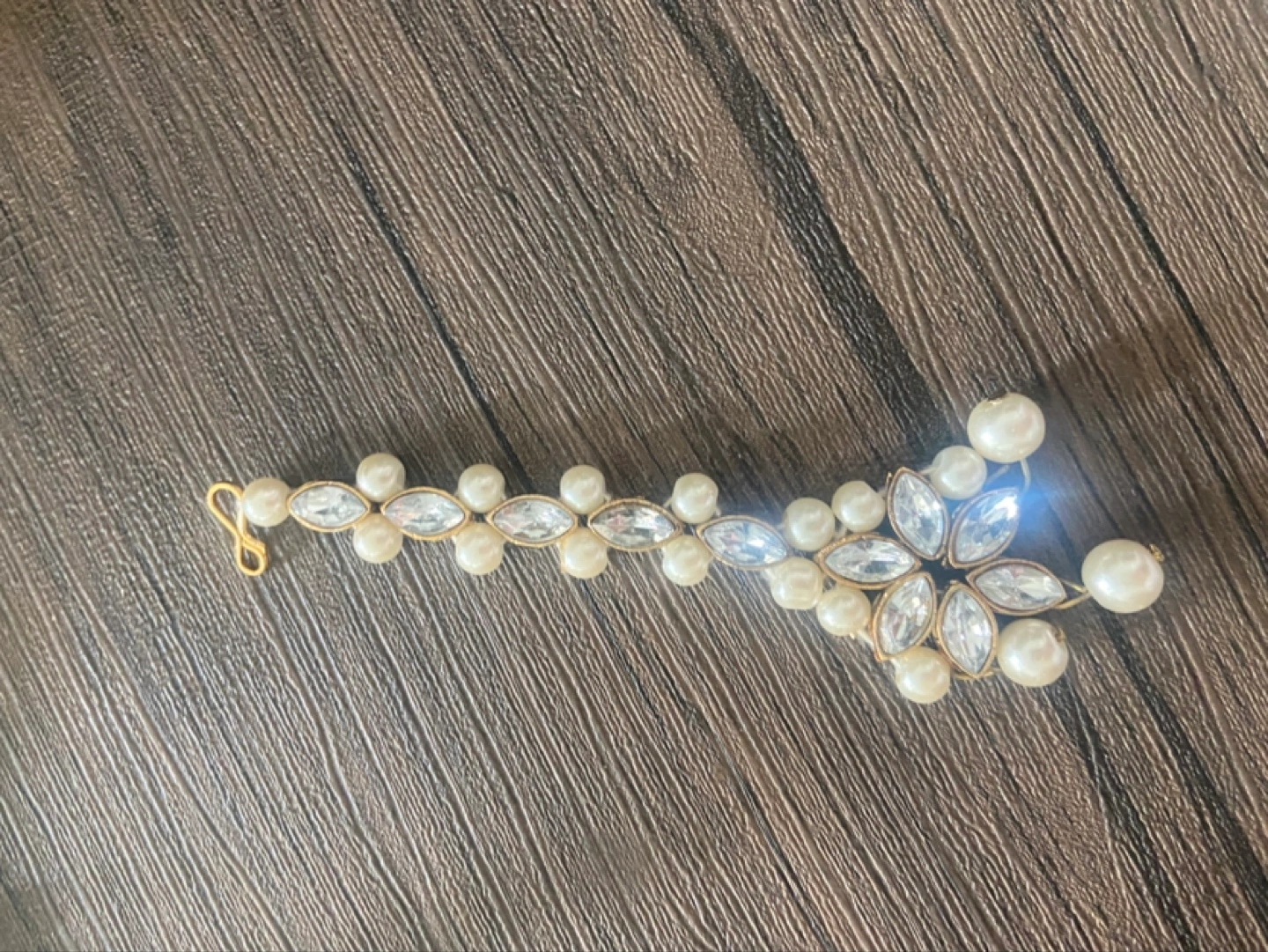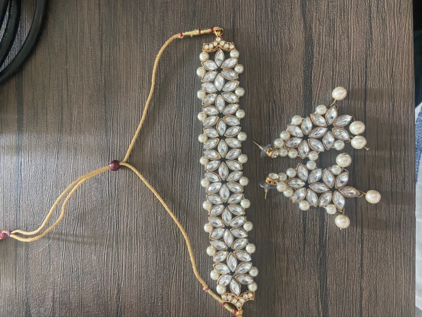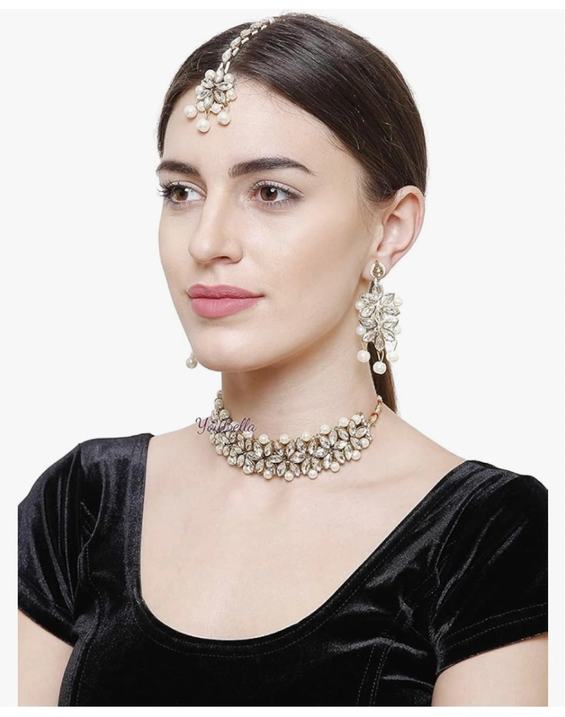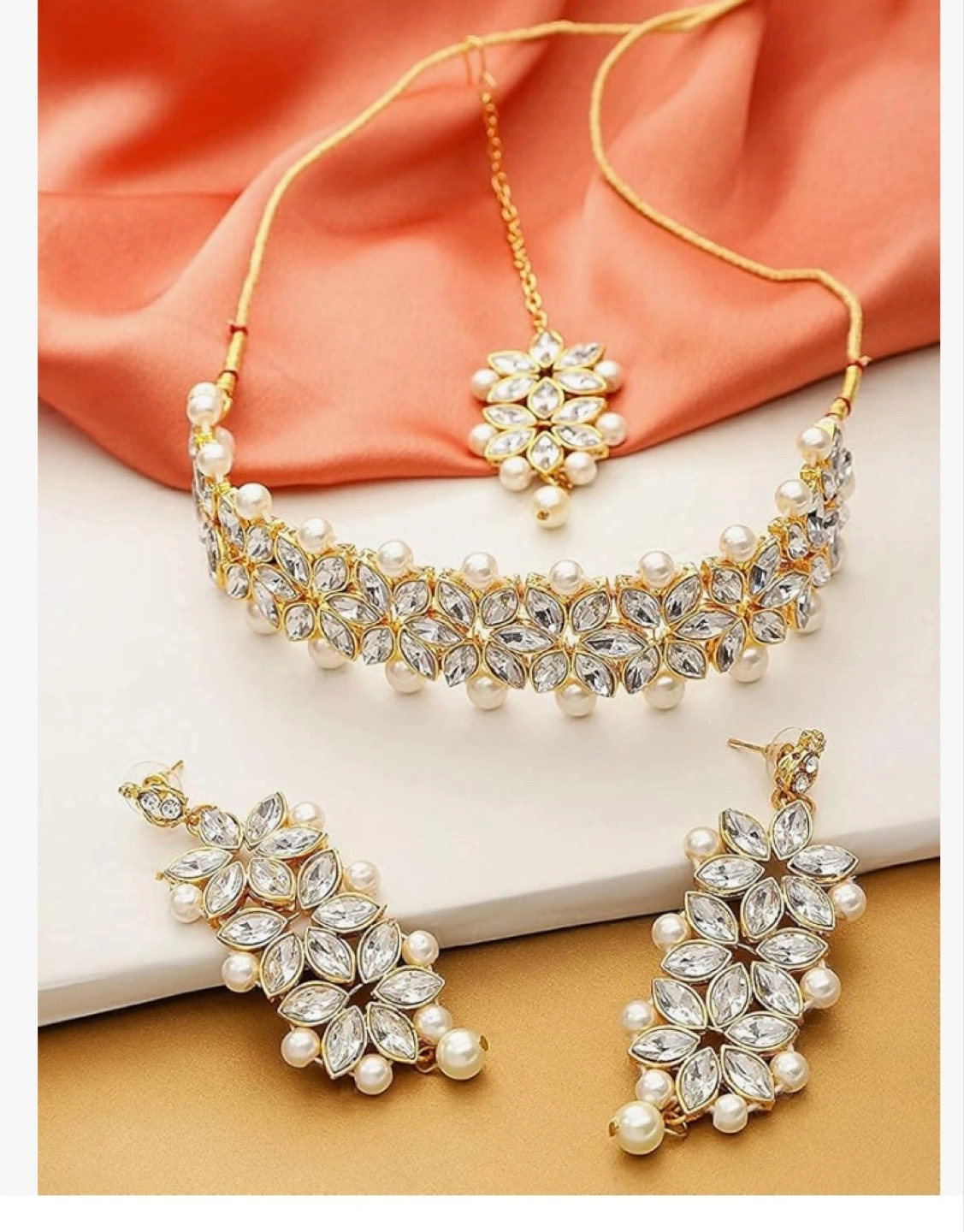 Beautiful Kundan and pearl choker necklace set. Includes matching earrings and maang tikka. Gold-tone metal. Elegant design, perfect for special occasions.